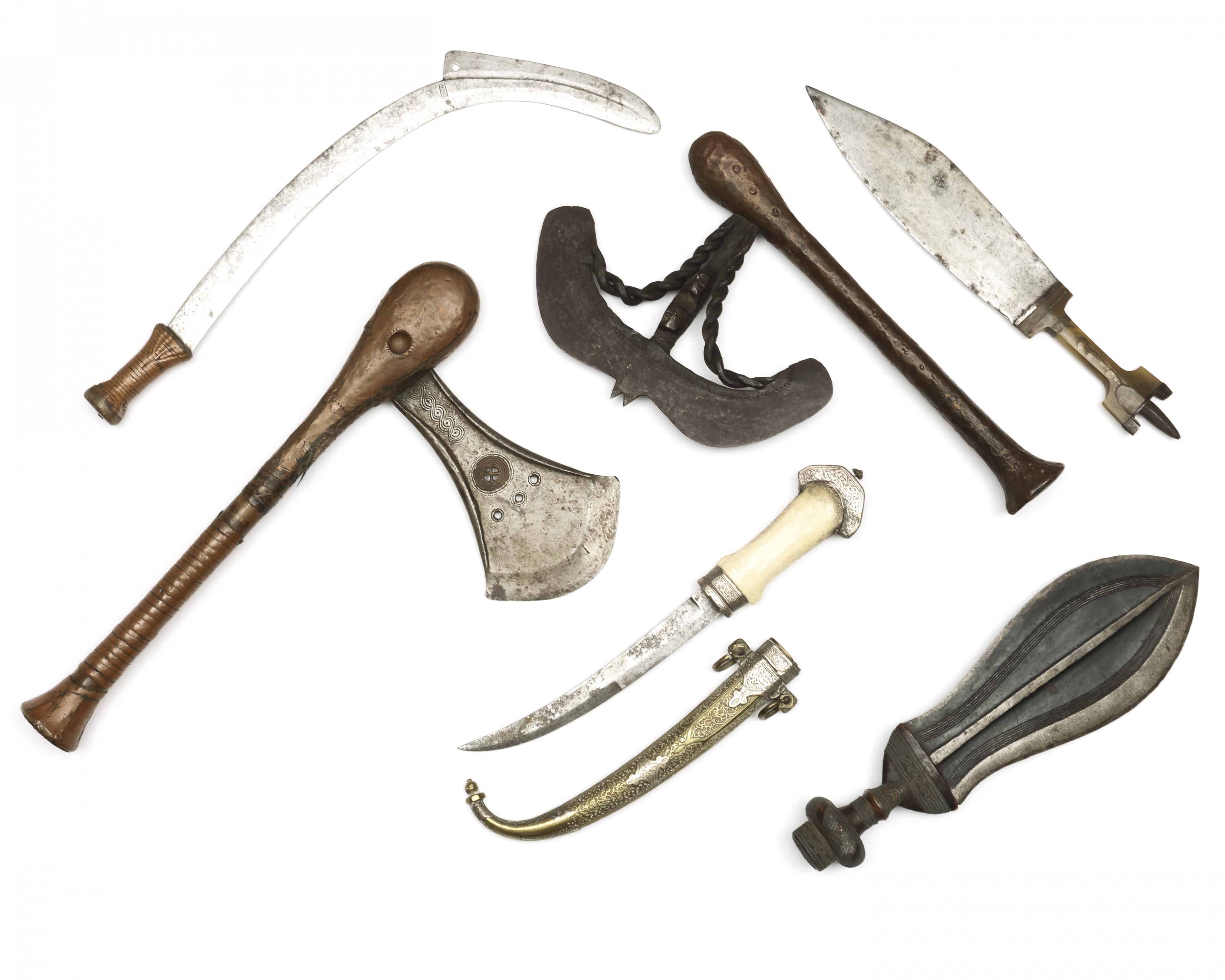 a.o. Songye, a ceremonial axe the shaft with copper plating, the blade with copper open wheel.
