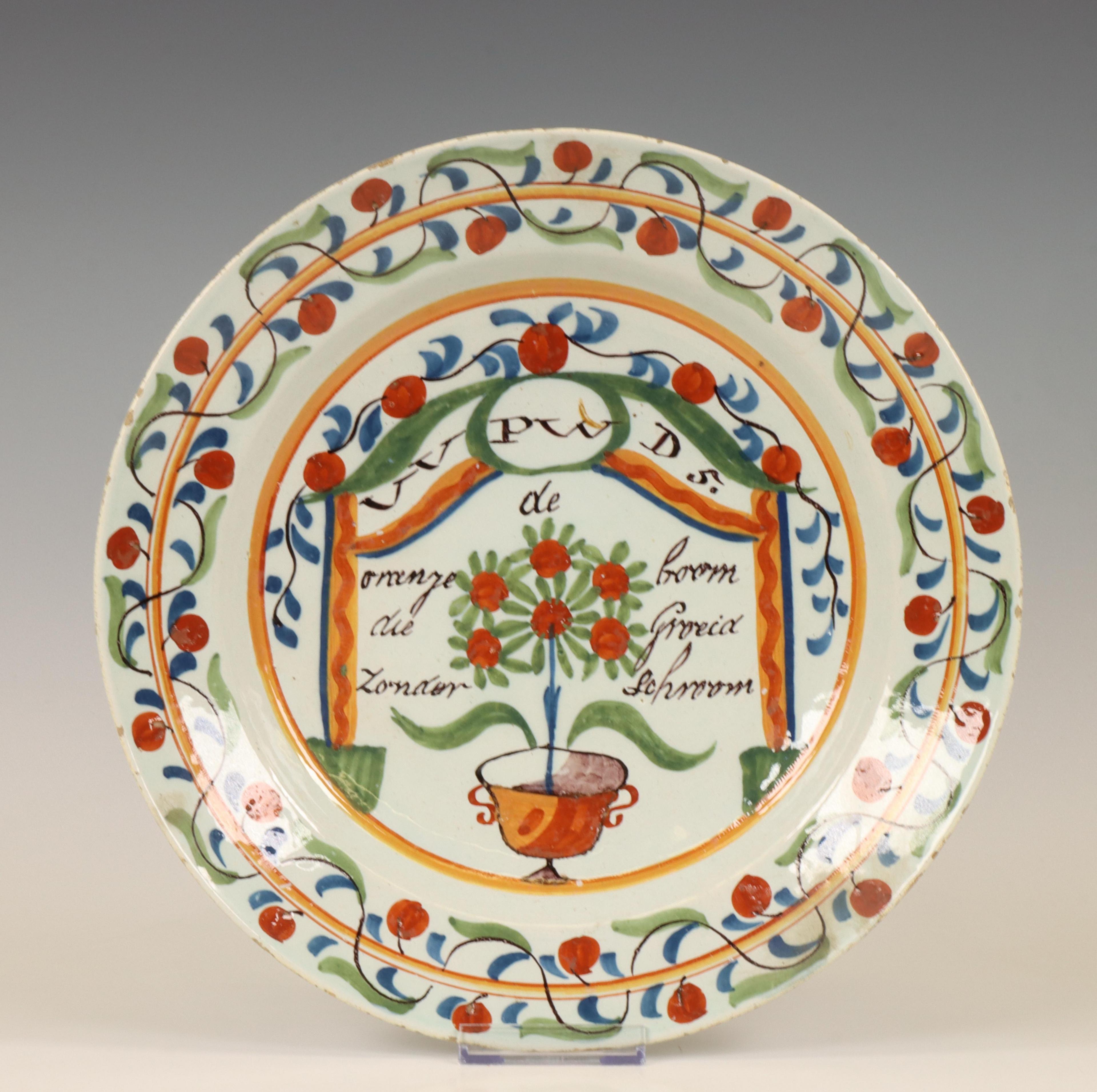 Delft, polychroom geschilderde aardewerk schotel met Orangisten decor, 18e eeuw.