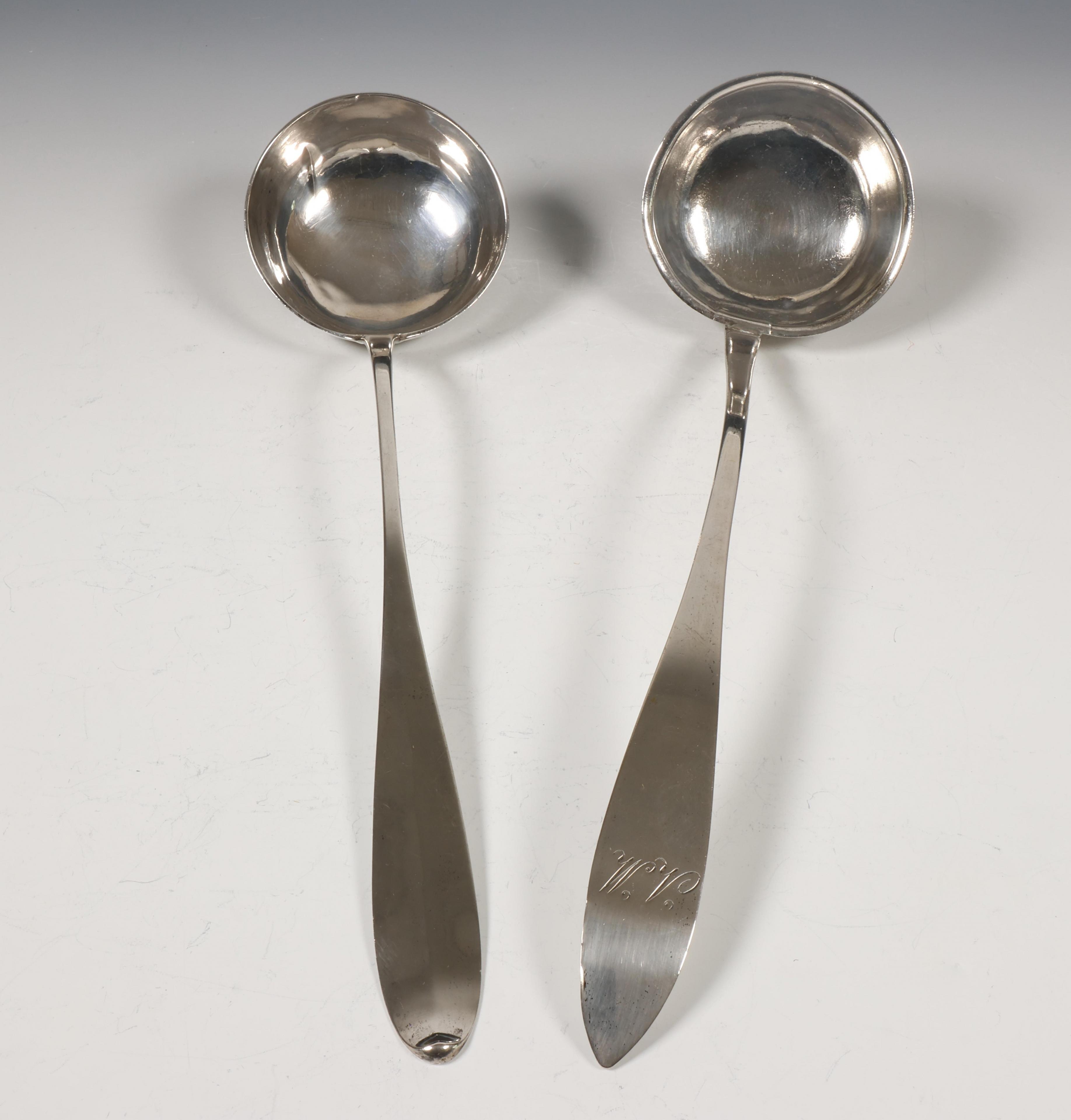 beide met ronde bakken en puntfilet steel, diverse keuren, 2e gehalte, een met lettermonogram,