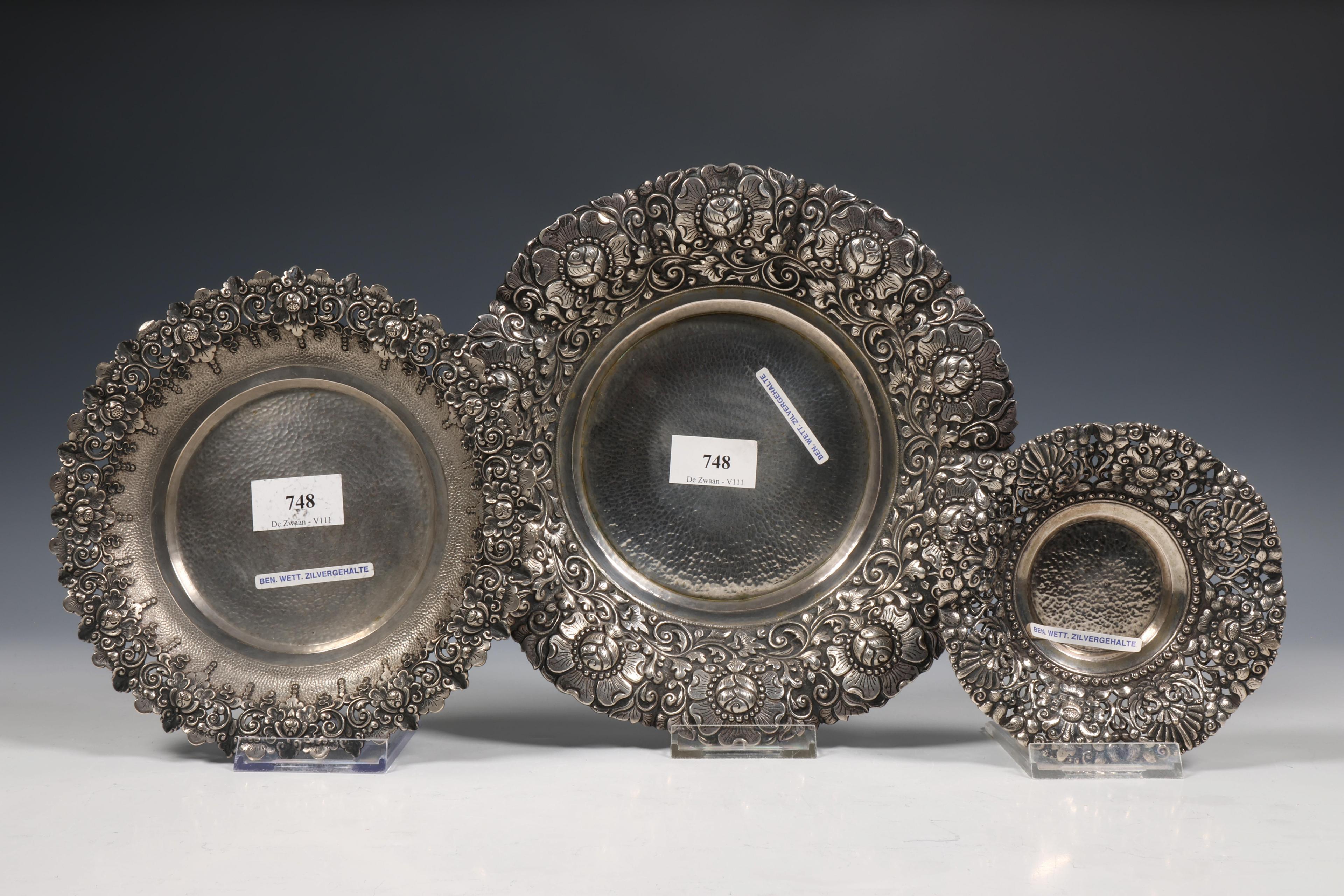 alle gehamerd en met versierde golvende randen met bloem-, blad- en motieven, de kleinste ook met pauwendecoratie, getekend resp . 800NZ(niet geïdentifiiceerd), 800KSP(geïdentificeerd Djokja.nl)en 800 WC(geïdentificeerd), BWG,