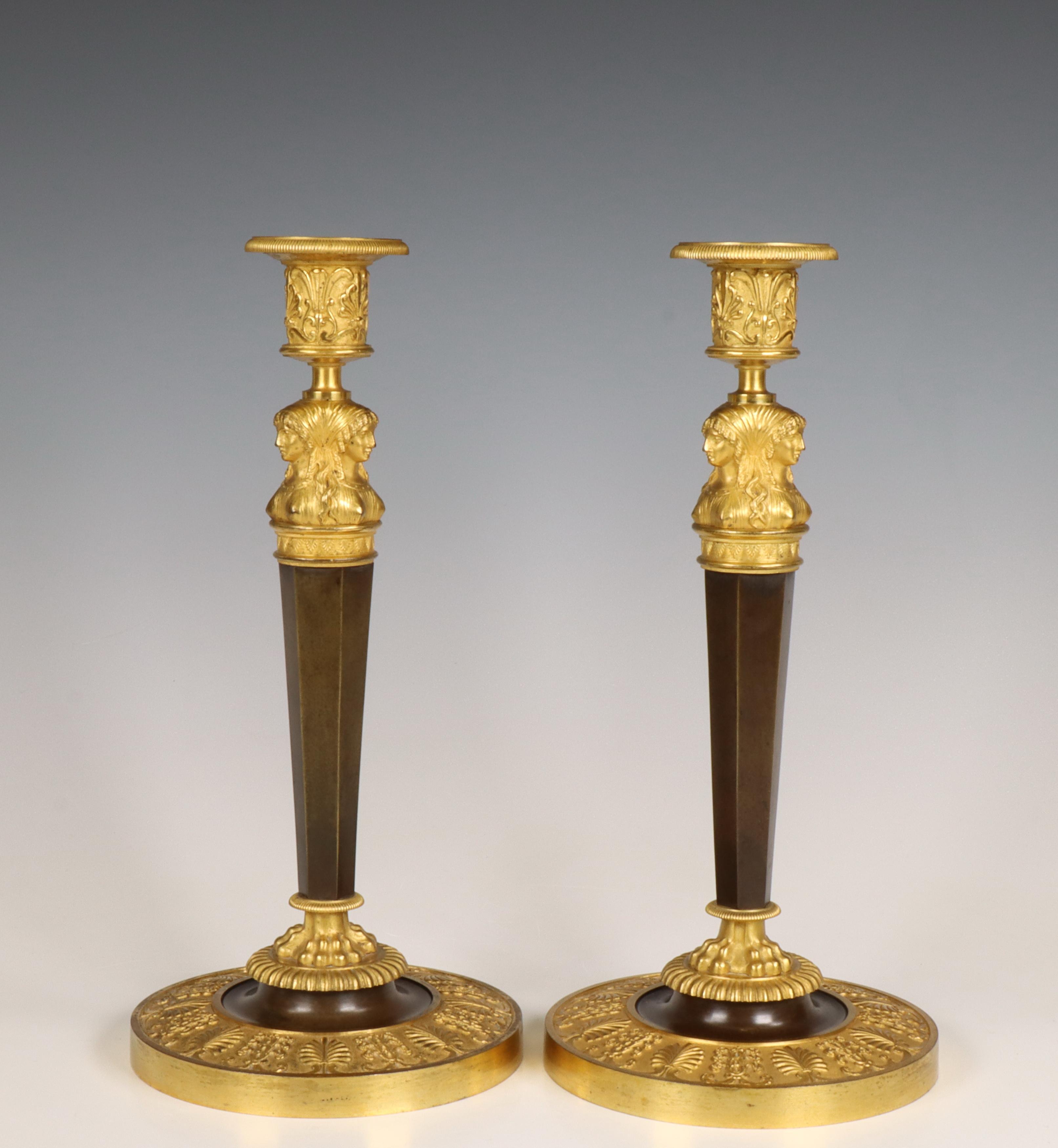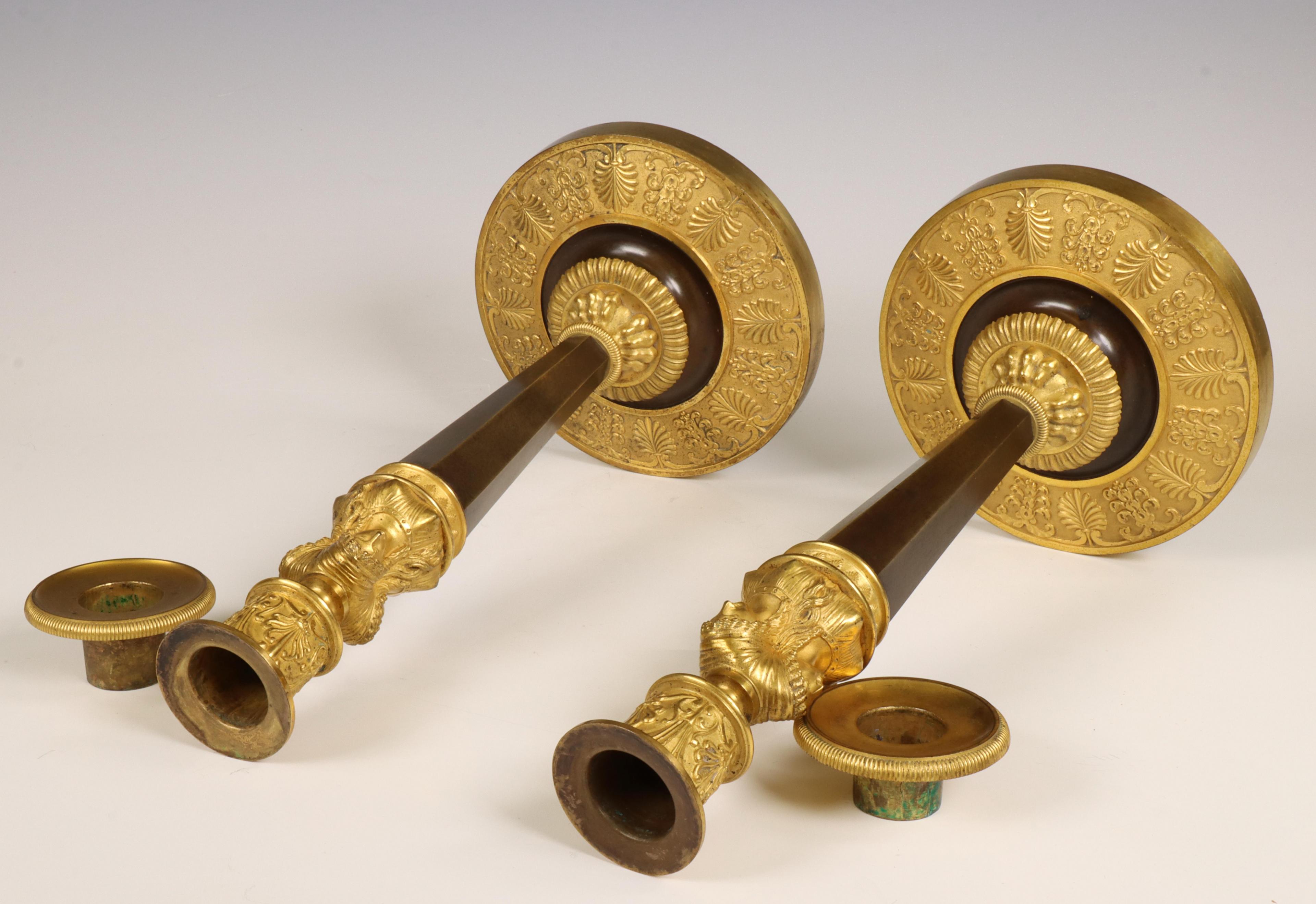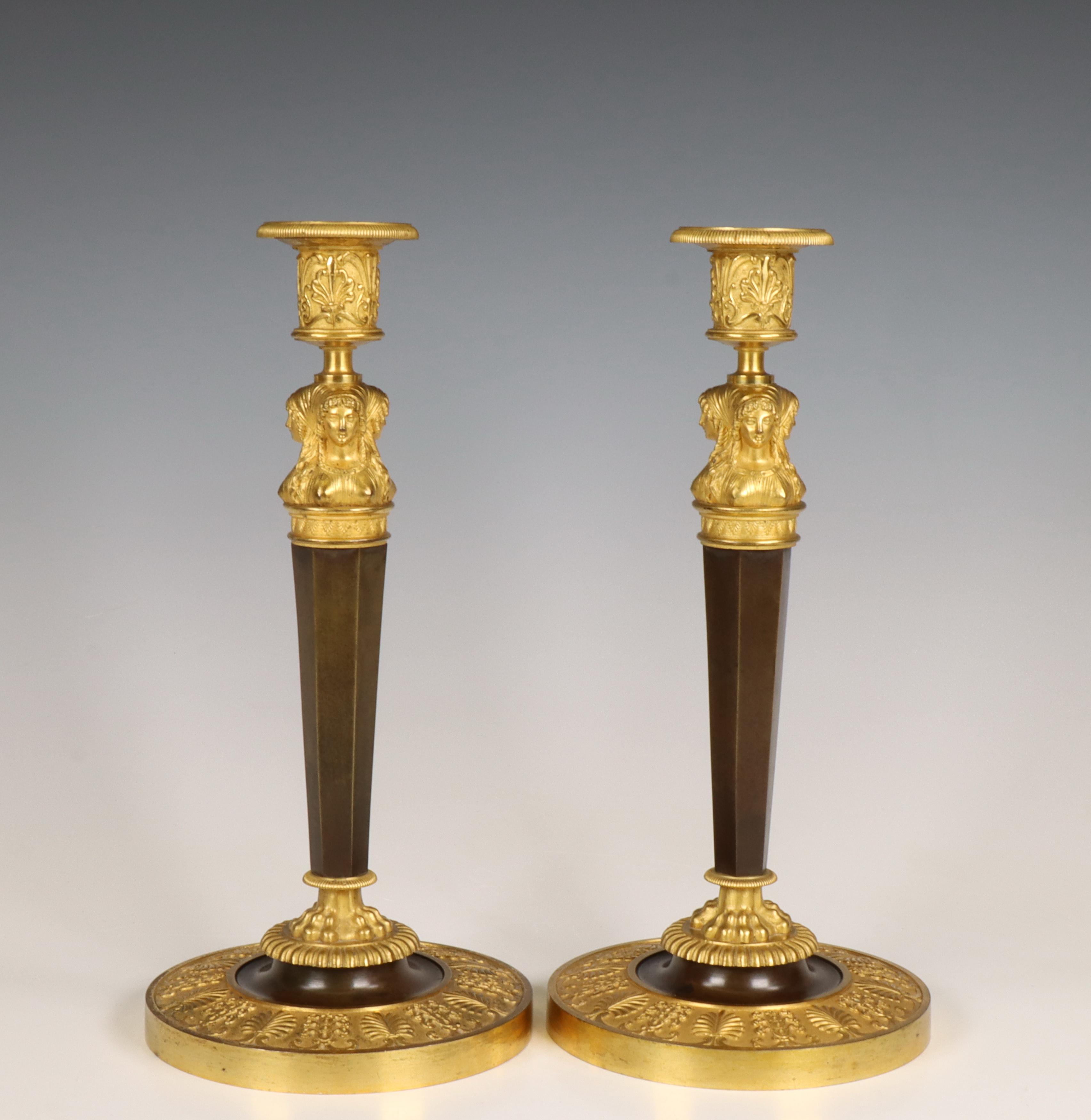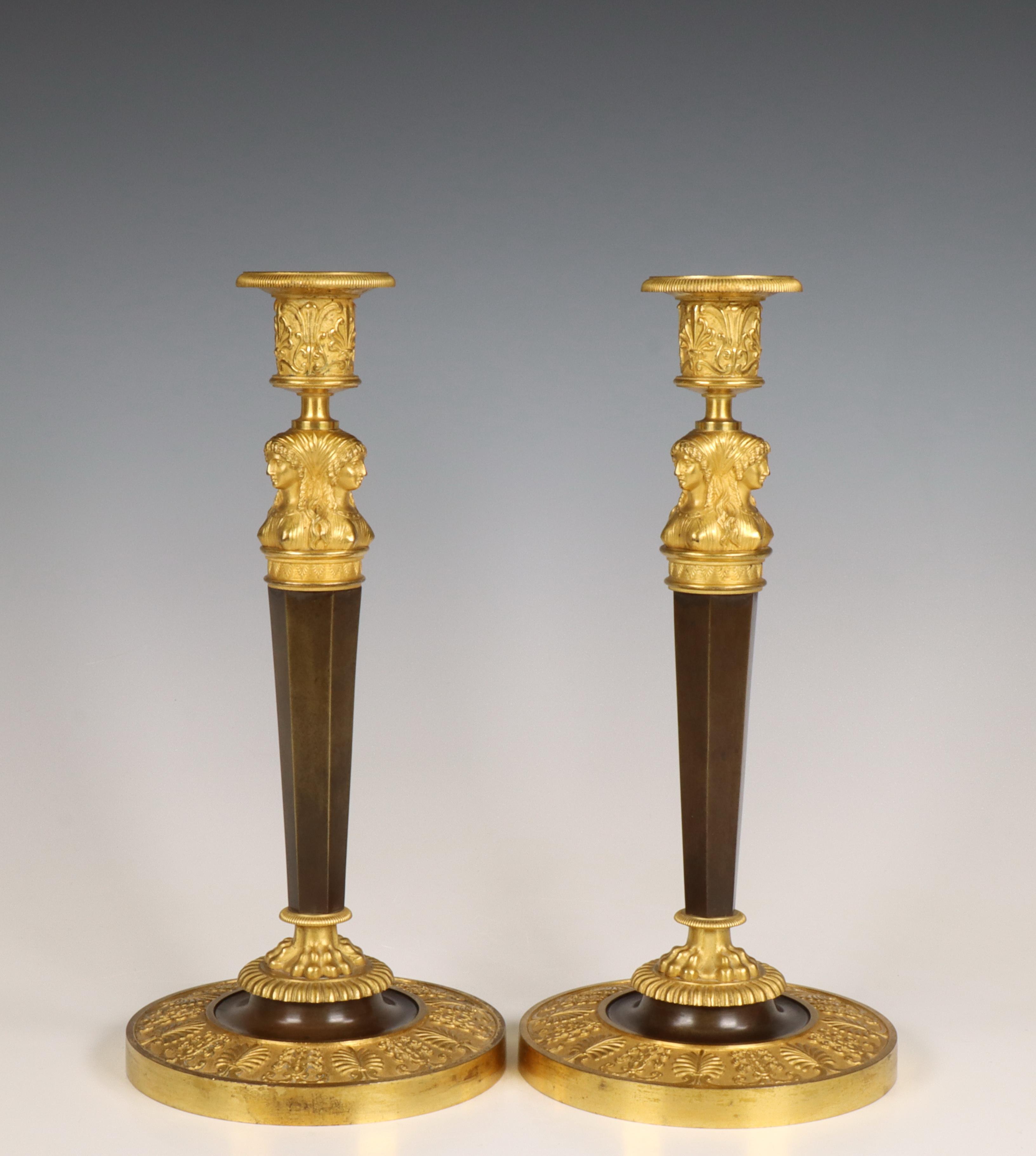 Frankrijk, paar groen gepatineerde en vuurvergulde bronzen eenlichts kandelaars Retour d'Egypte, Empire, circa 1805.