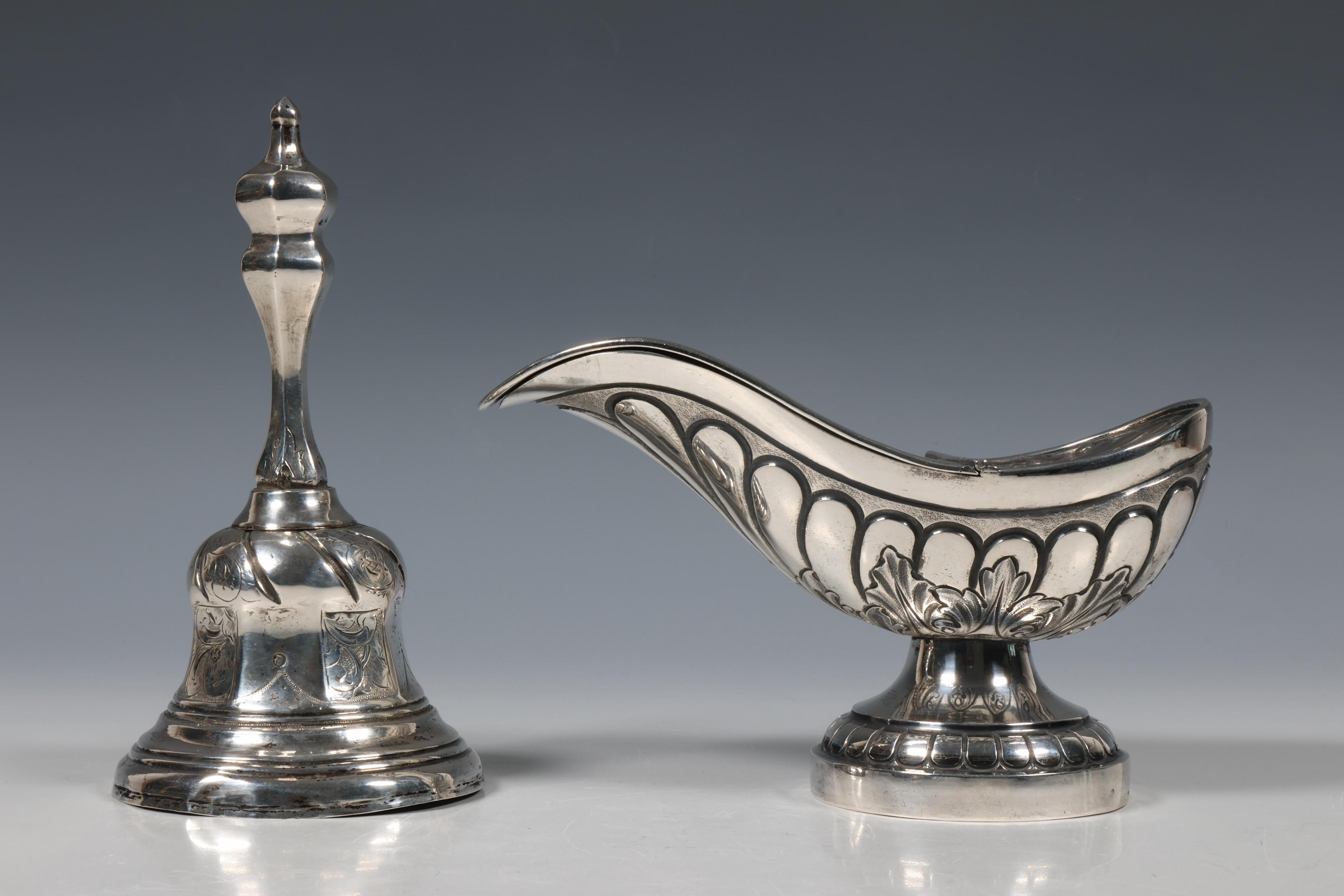 klokvormig bewerkt met gravering, bronzen bel, mt. AH of SH samengesteld, vermoedelijk Frankrijk, asvergaarde schuitvormig op ronde voet en bewerkt, stempel gekroonde V 1853-1893, ovale lijst mt. Hollandia zilversmeden Zutphen, 2e gehalte,