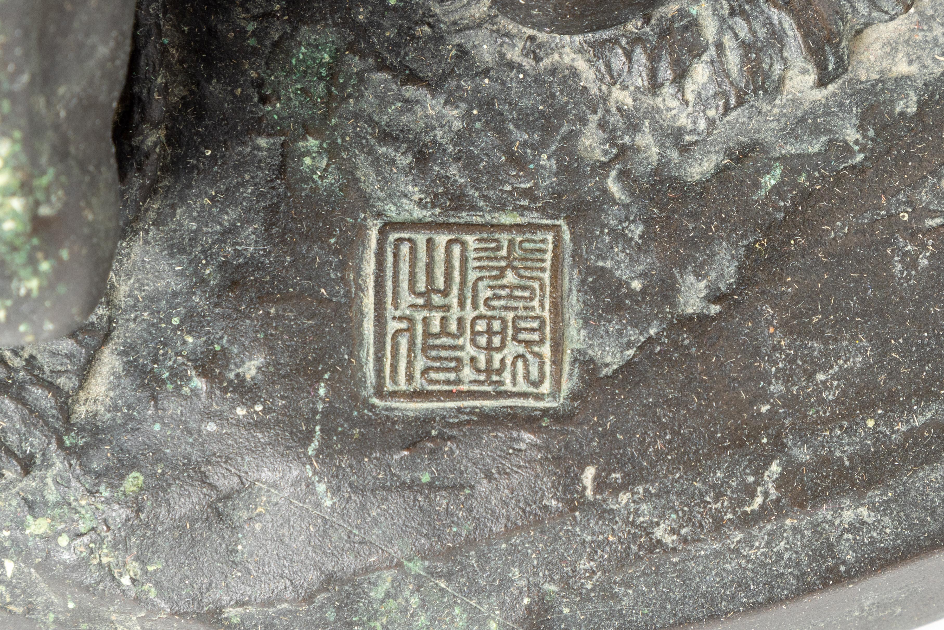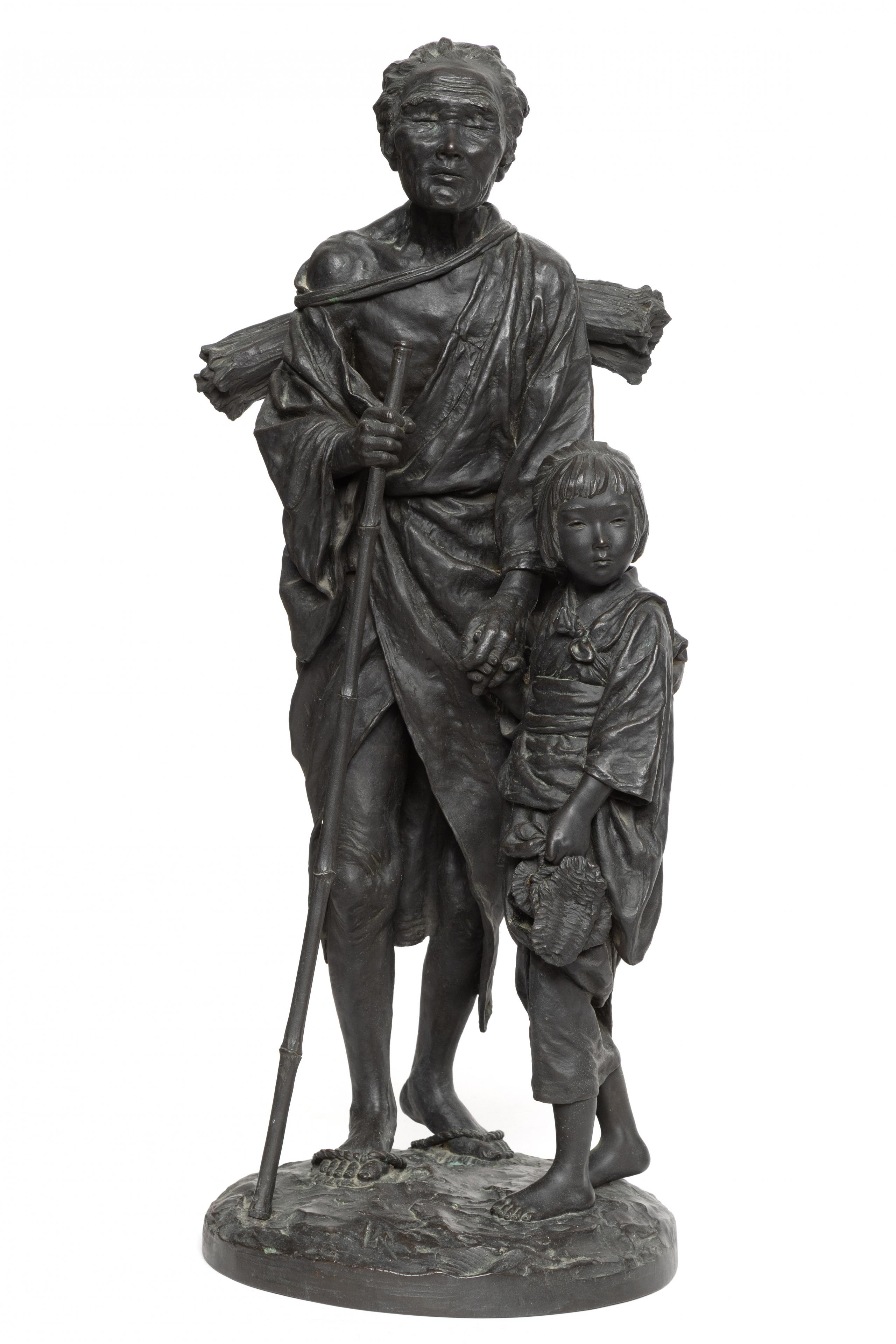 Japan, black patinated bronze okimono, depicting blind woman with child, Meiji (1868-1912);