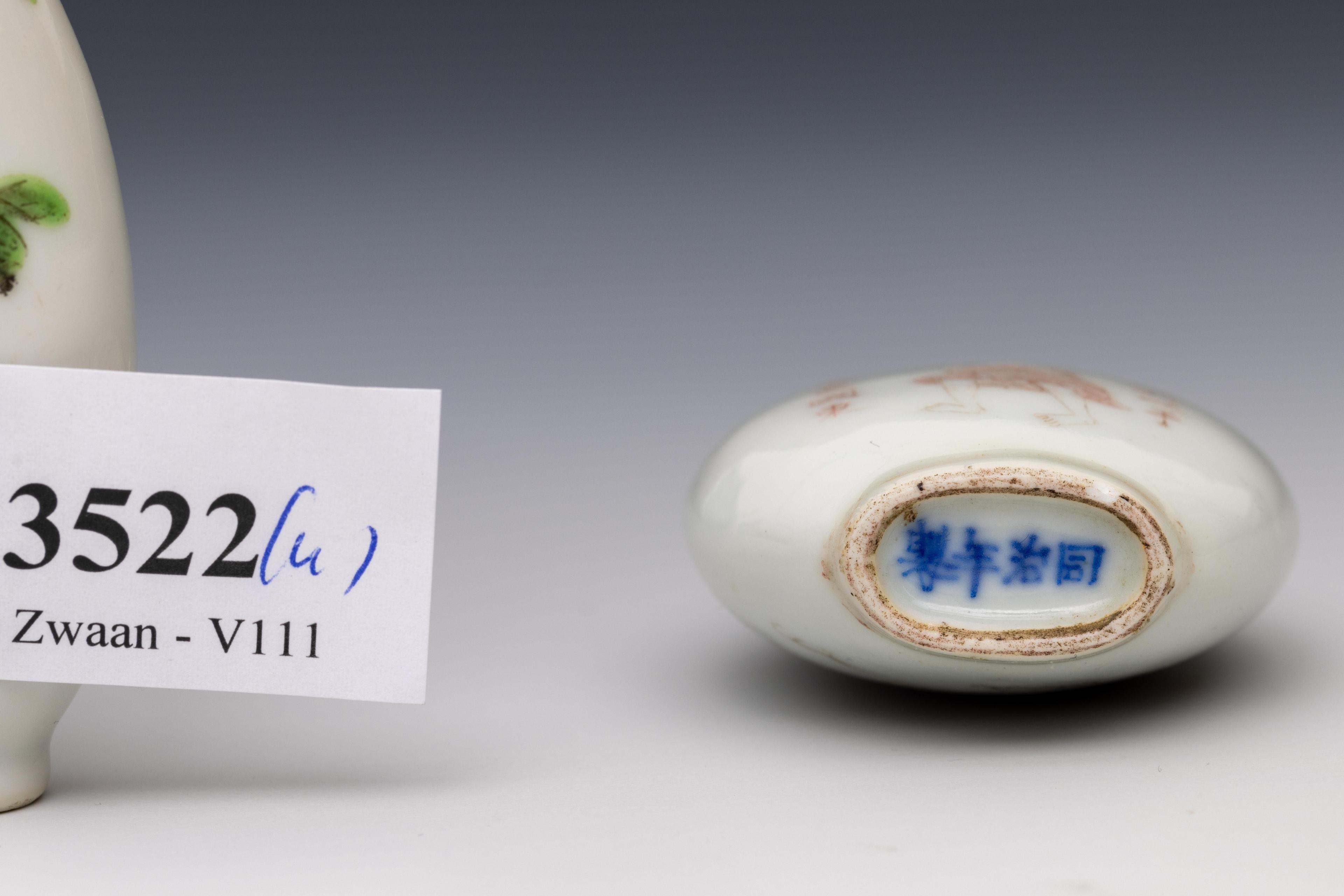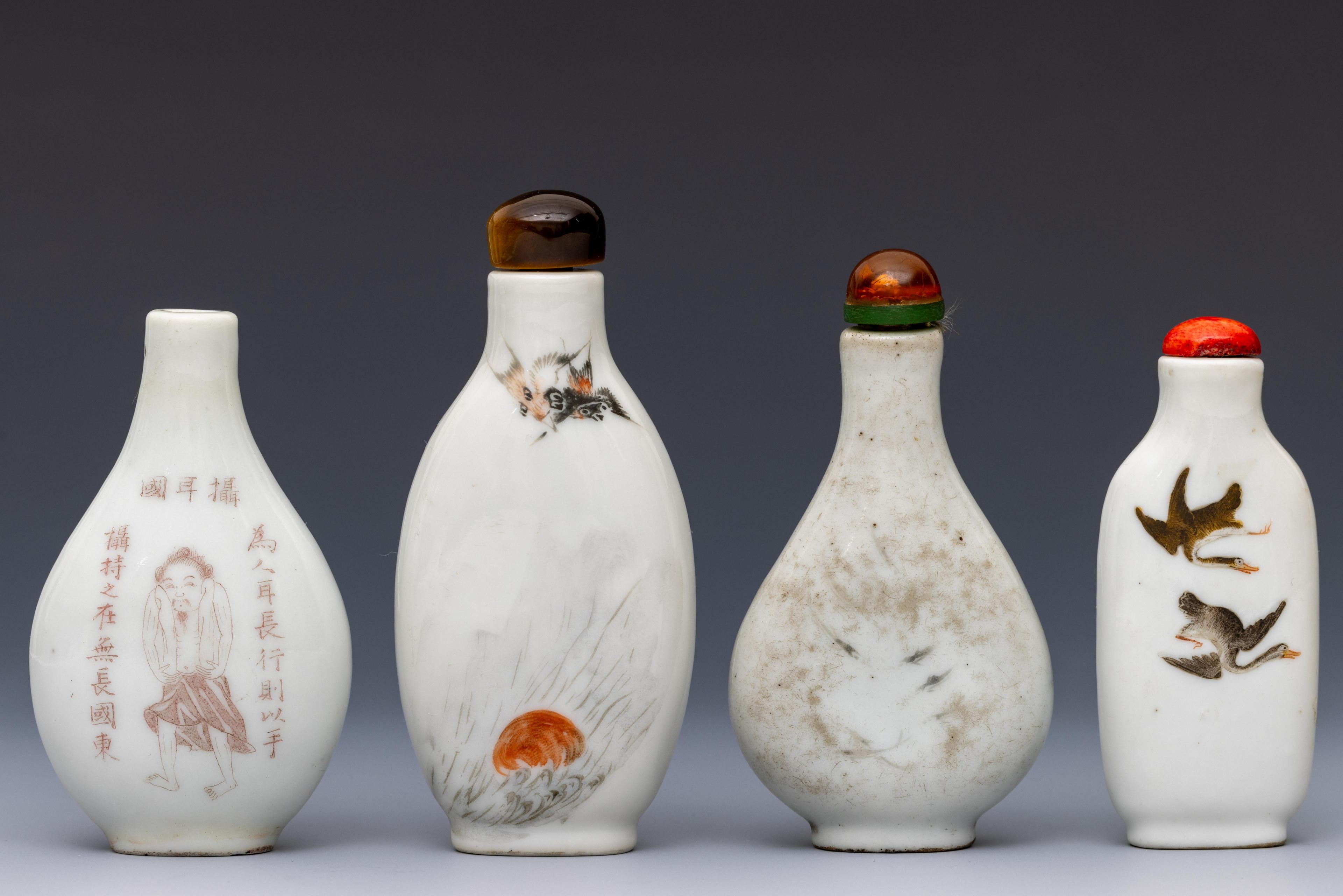 China, four polychrome decorated porcelain 'fauna' snuff bottles and three stoppers, late Qing dynasty (1644-1912),