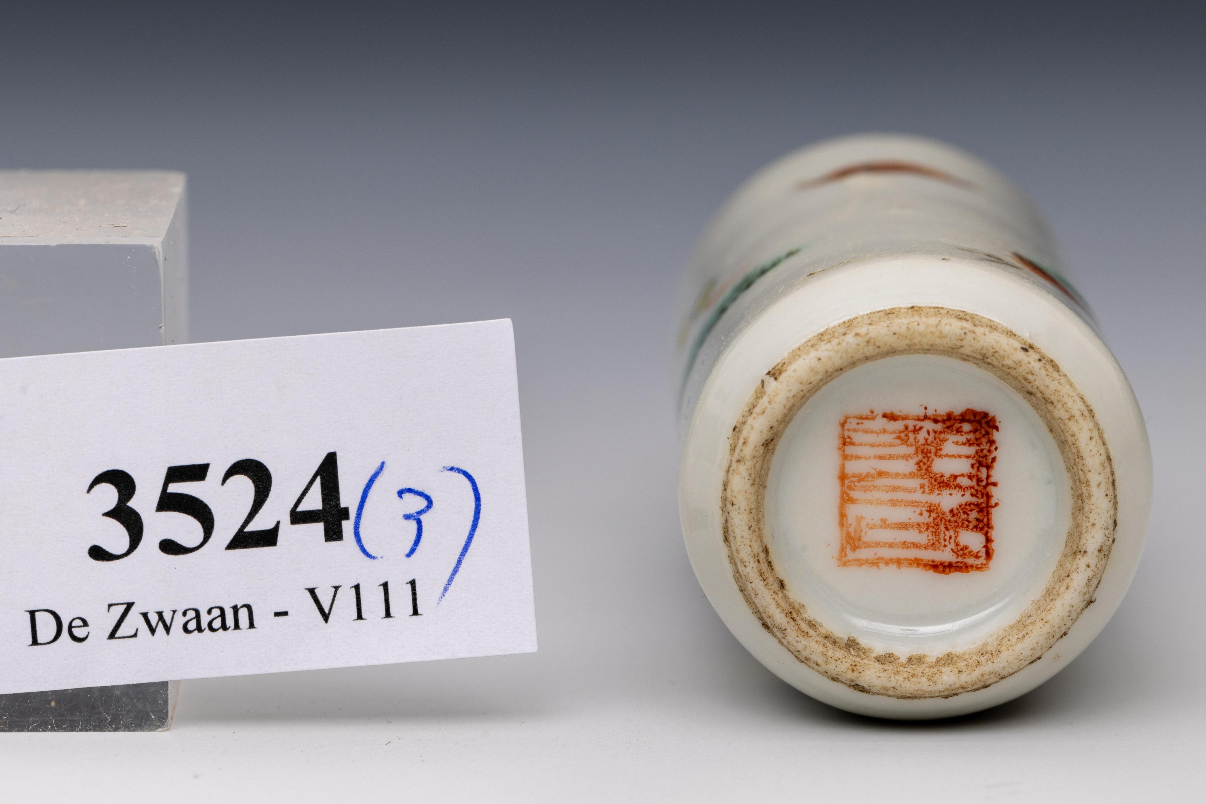 two of flattened baluster shape and one cylindrical, each variously and vibrantly decorated with figural scenes (surface wear, minor nicks and frits)