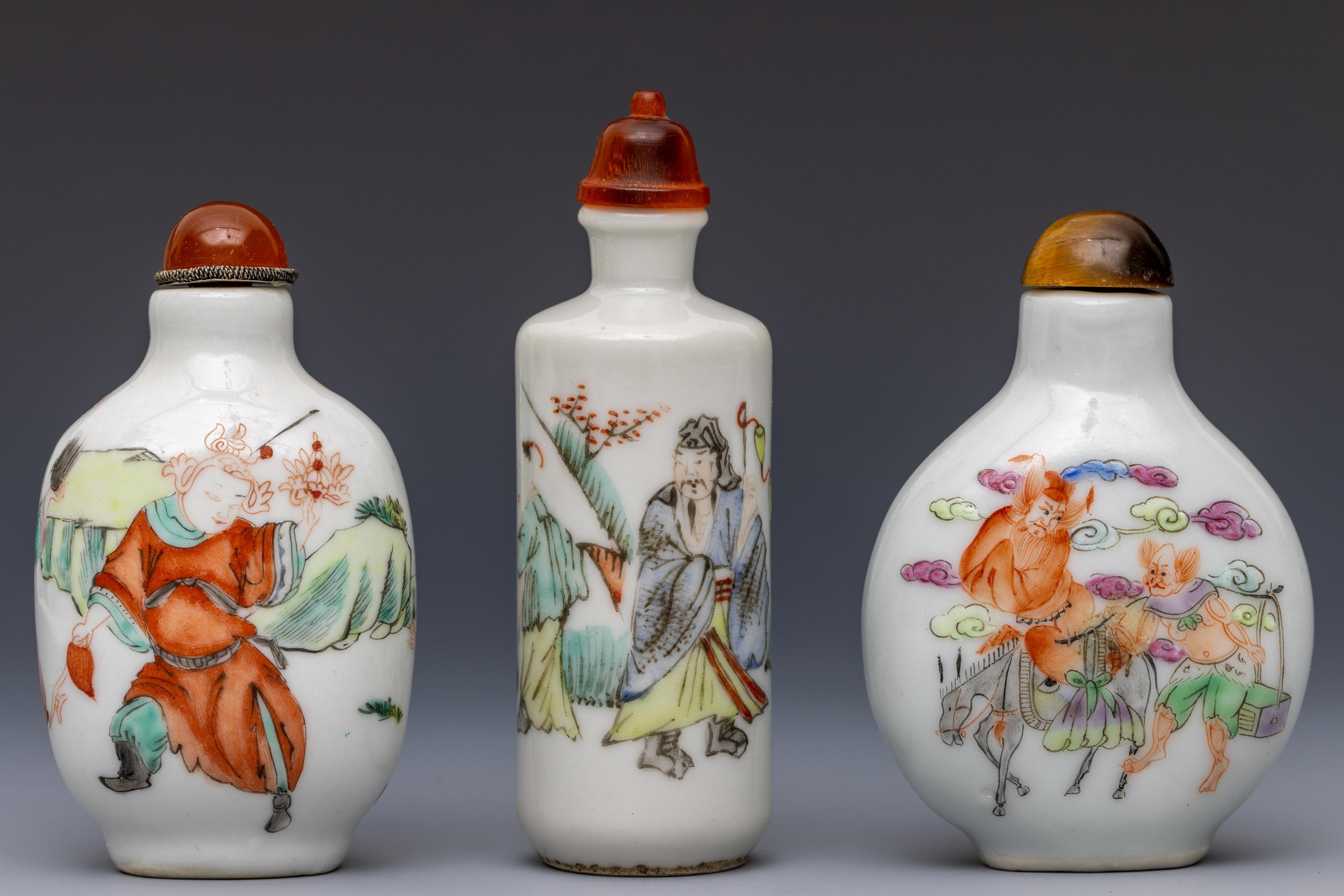 China, three polychrome decorated porcelain figural snuff bottles and stoppers, late Qing dynasty (1644-1912),