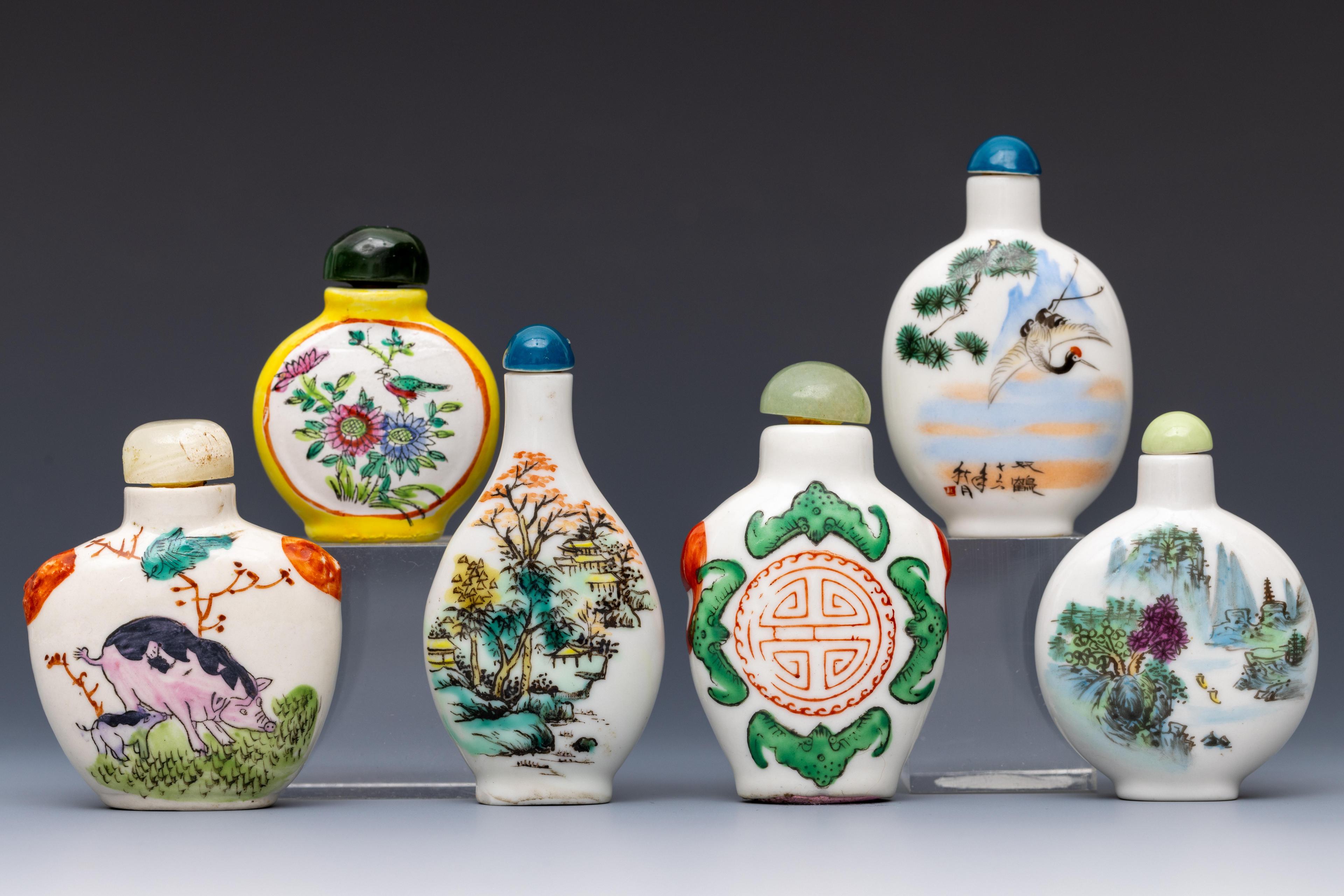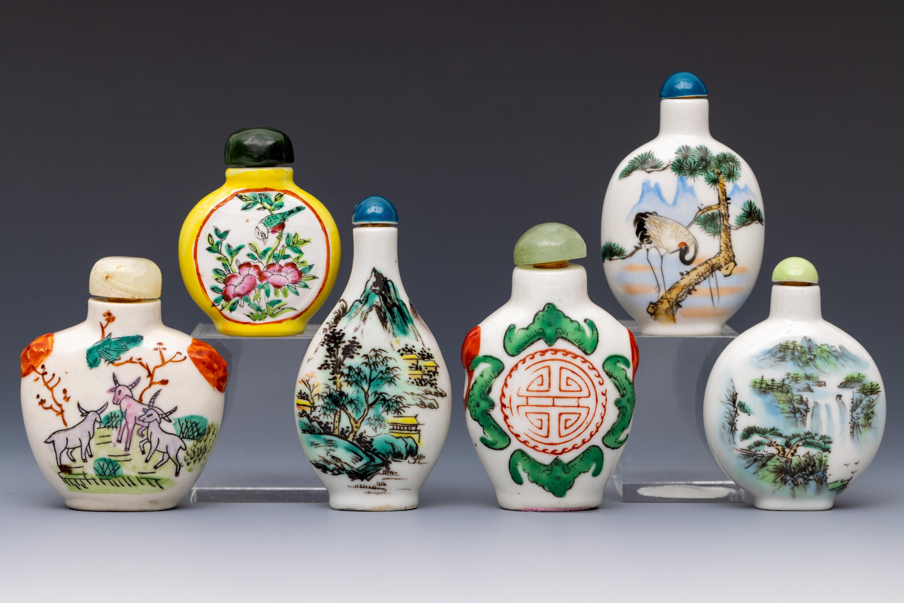 China, six polychrome decorated porcelain snuff bottles and stoppers, late 19th/ 20th century,