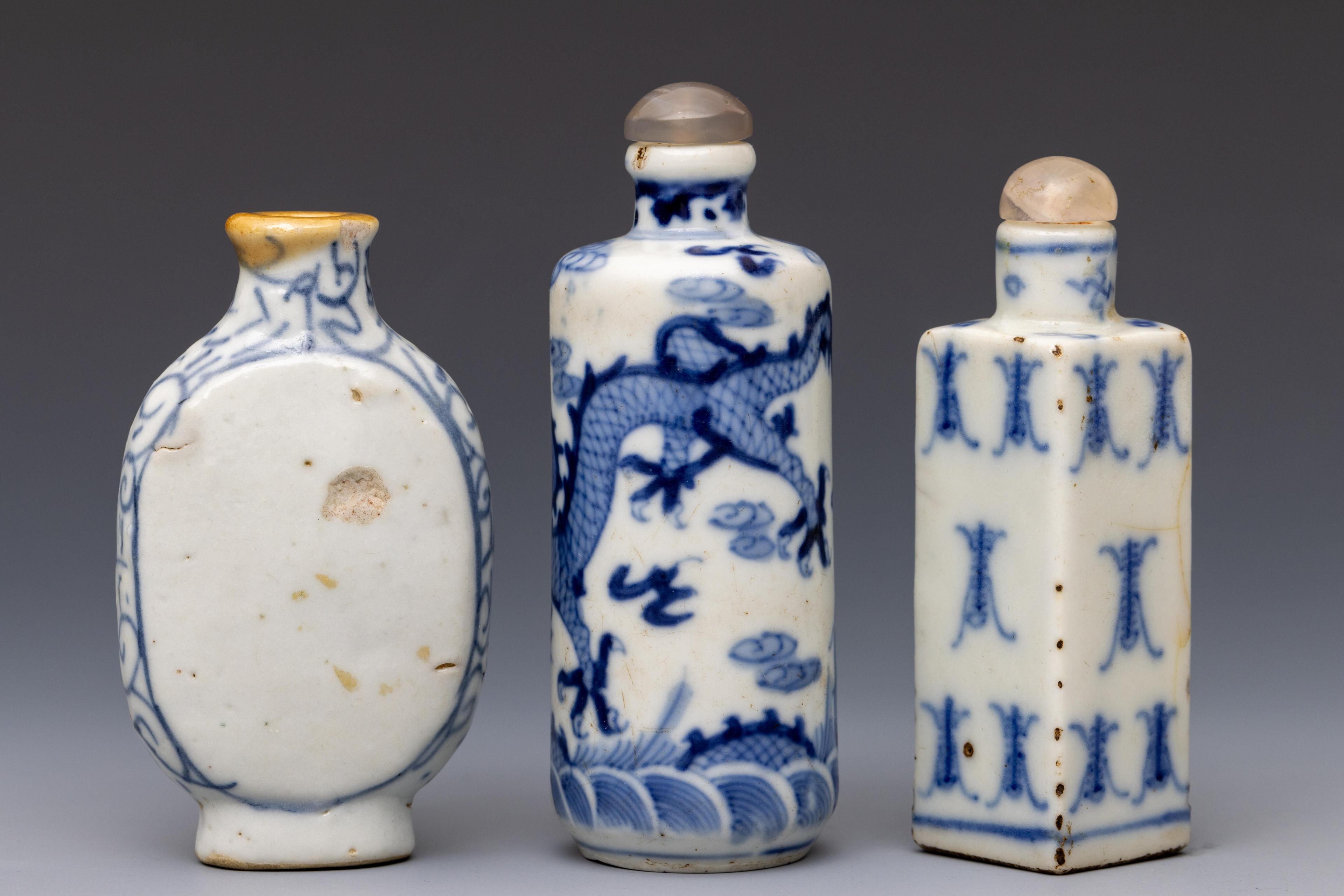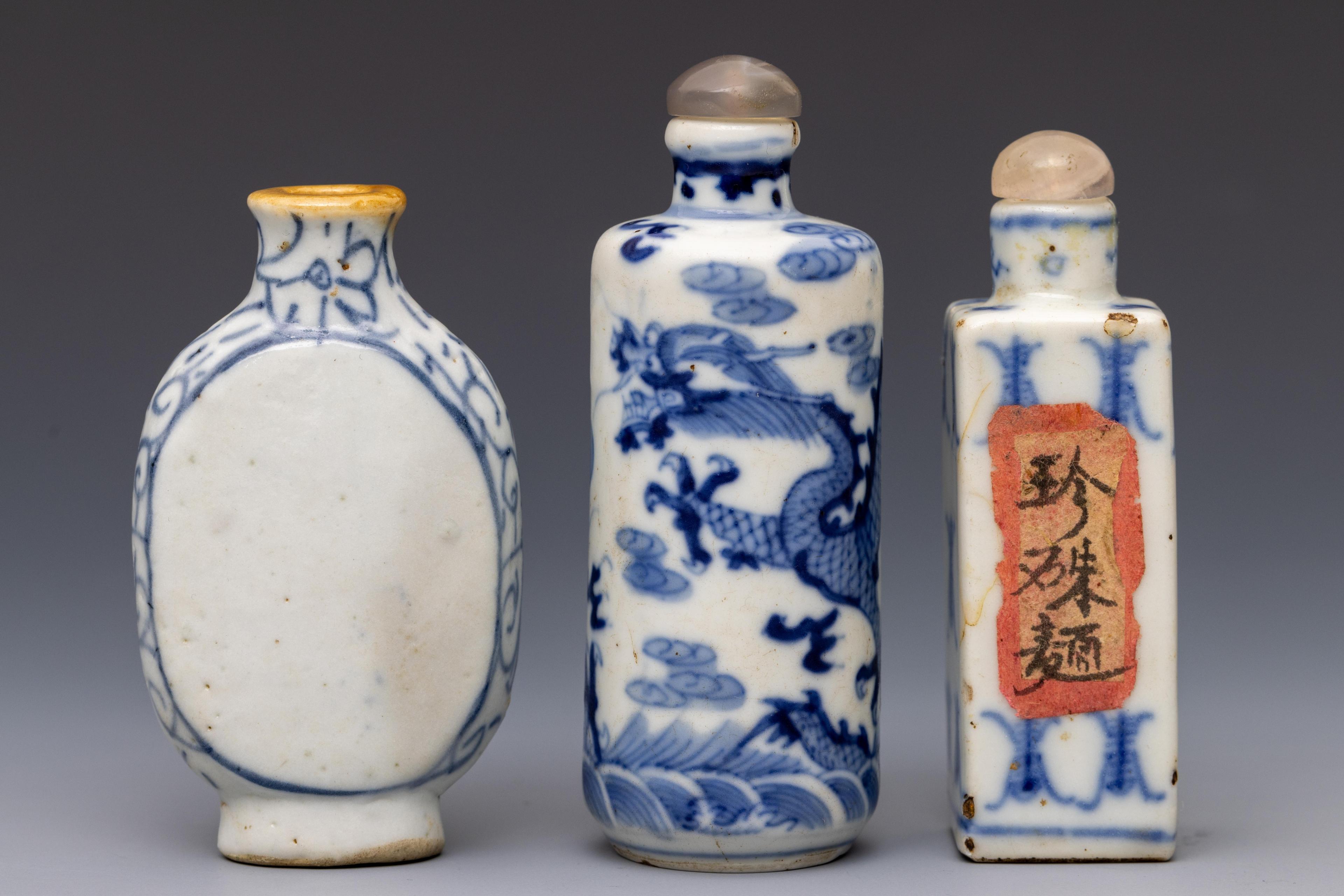 China, three blue and white porcelain snuff bottles and two stoppers, 20th century,