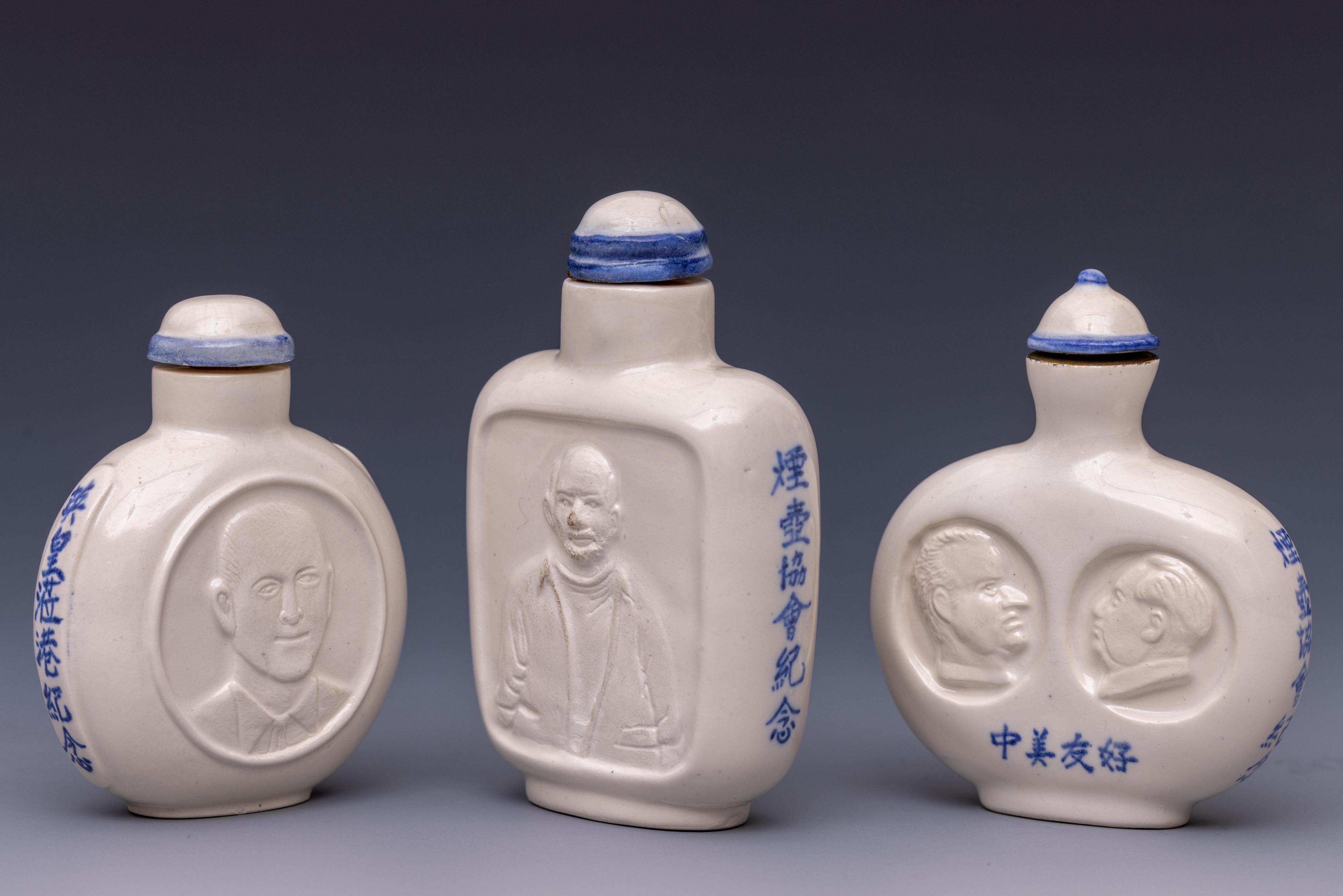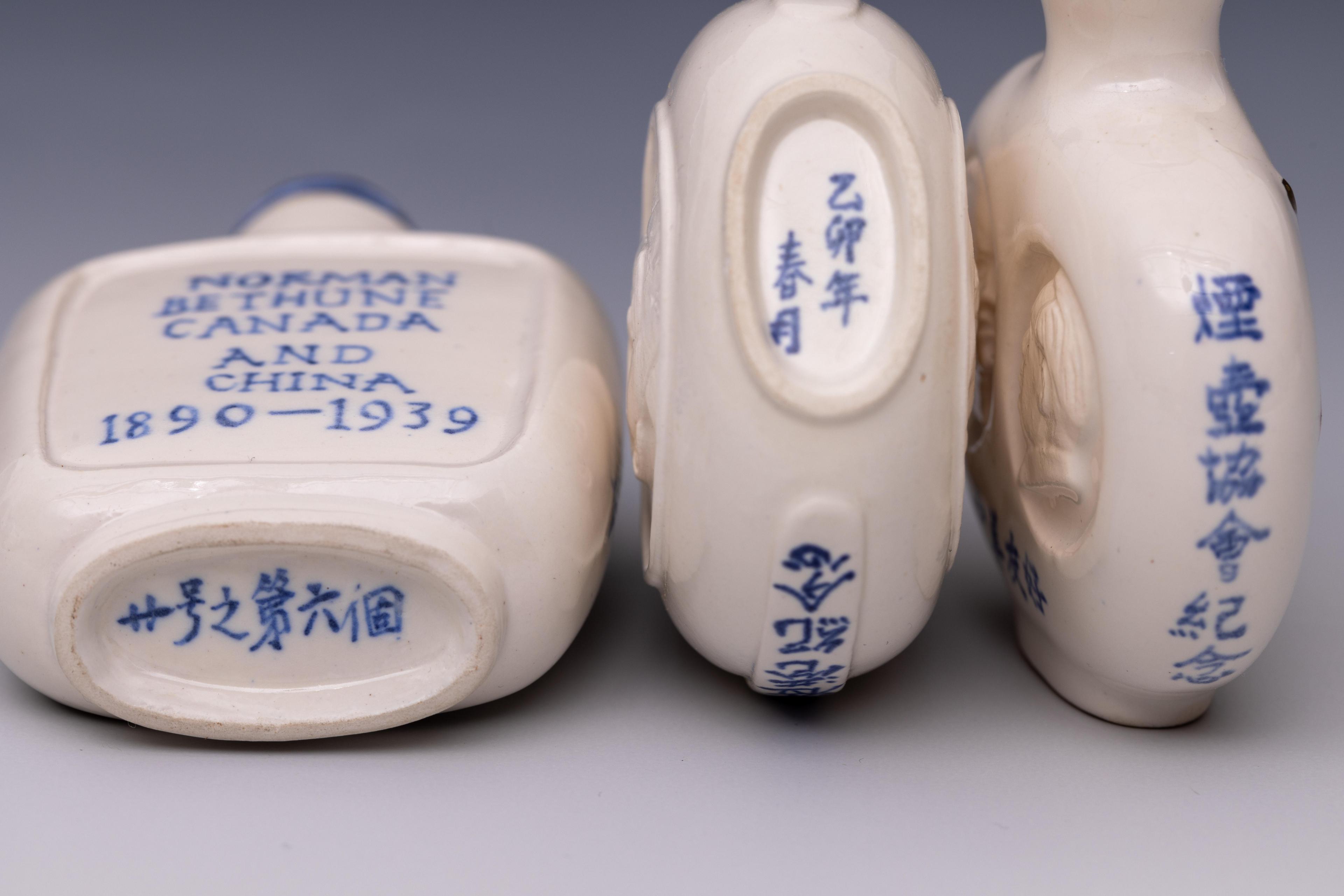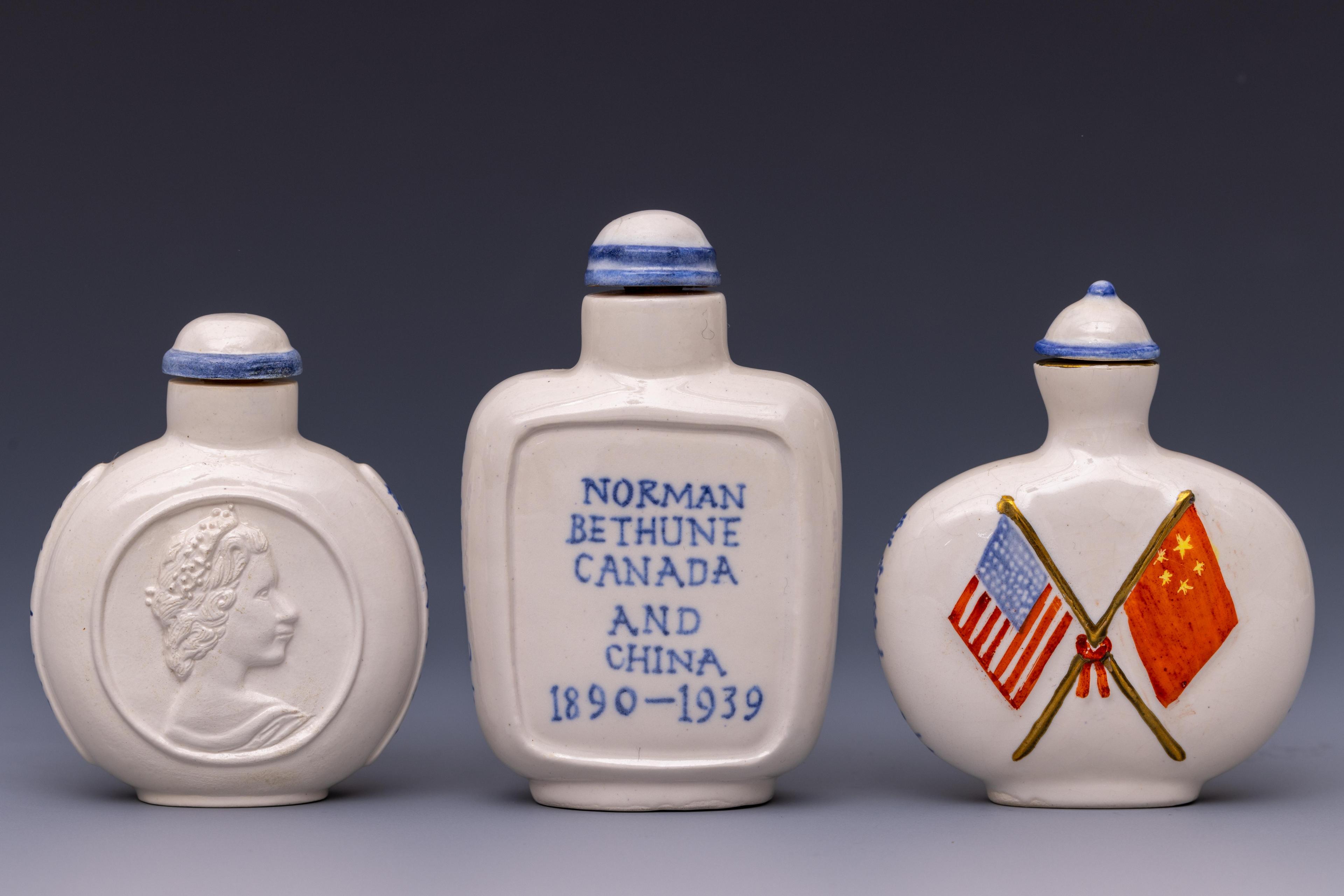 China, three Norman Bethune commemorative porcelain snuff bottles and stoppers, 20th century,