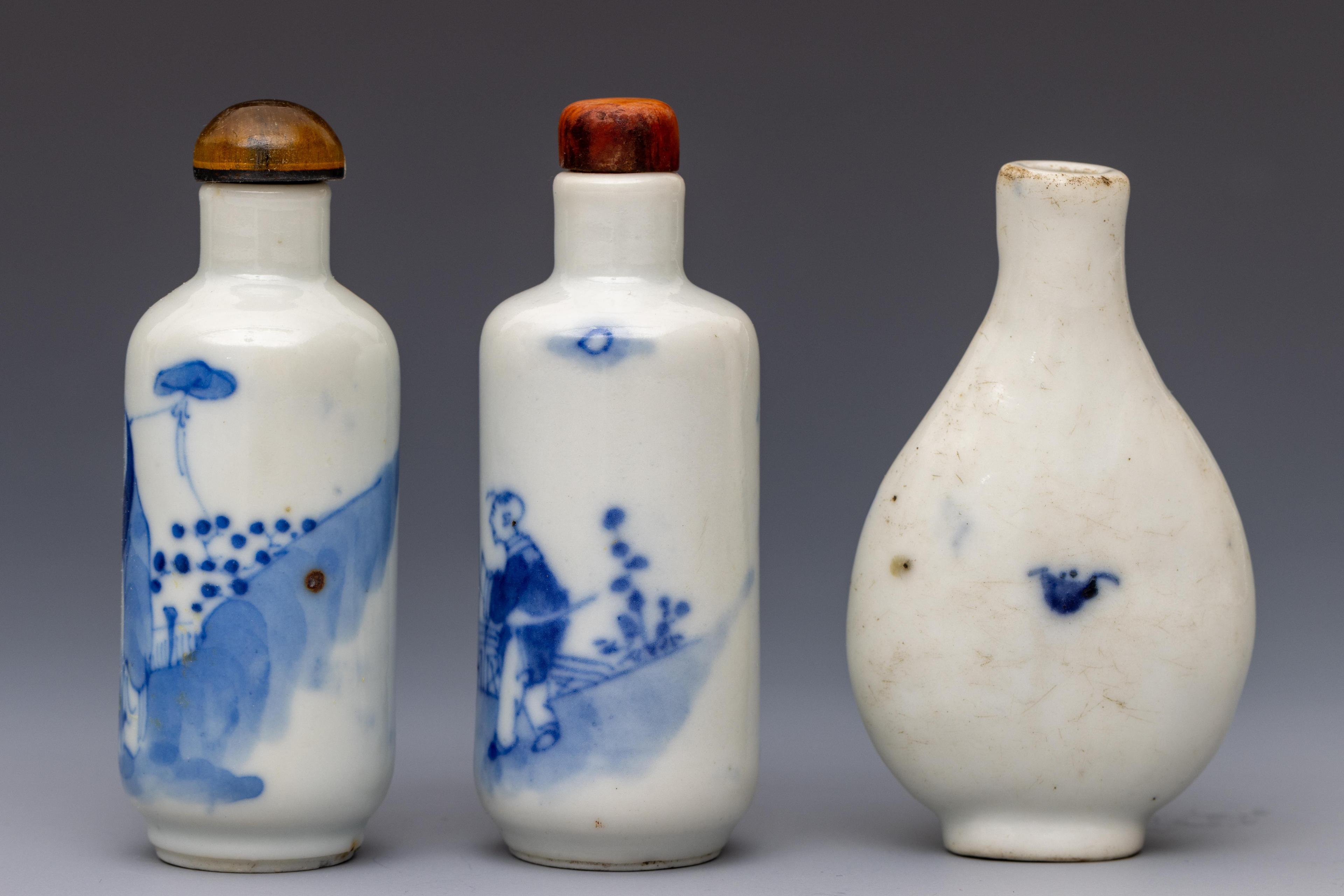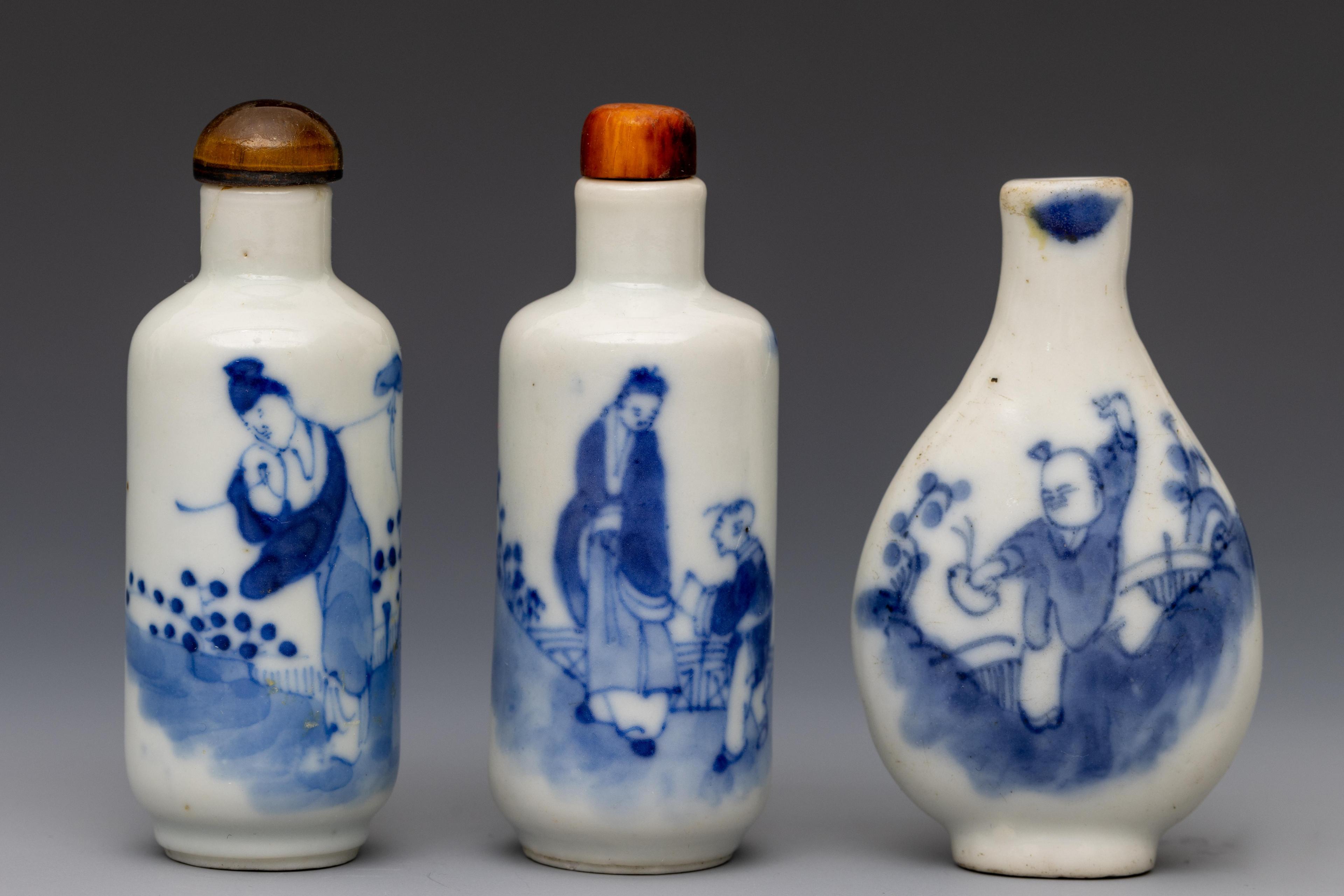 China, three blue and white porcelain figural snuff bottles and two stoppers, 19th-20th century,