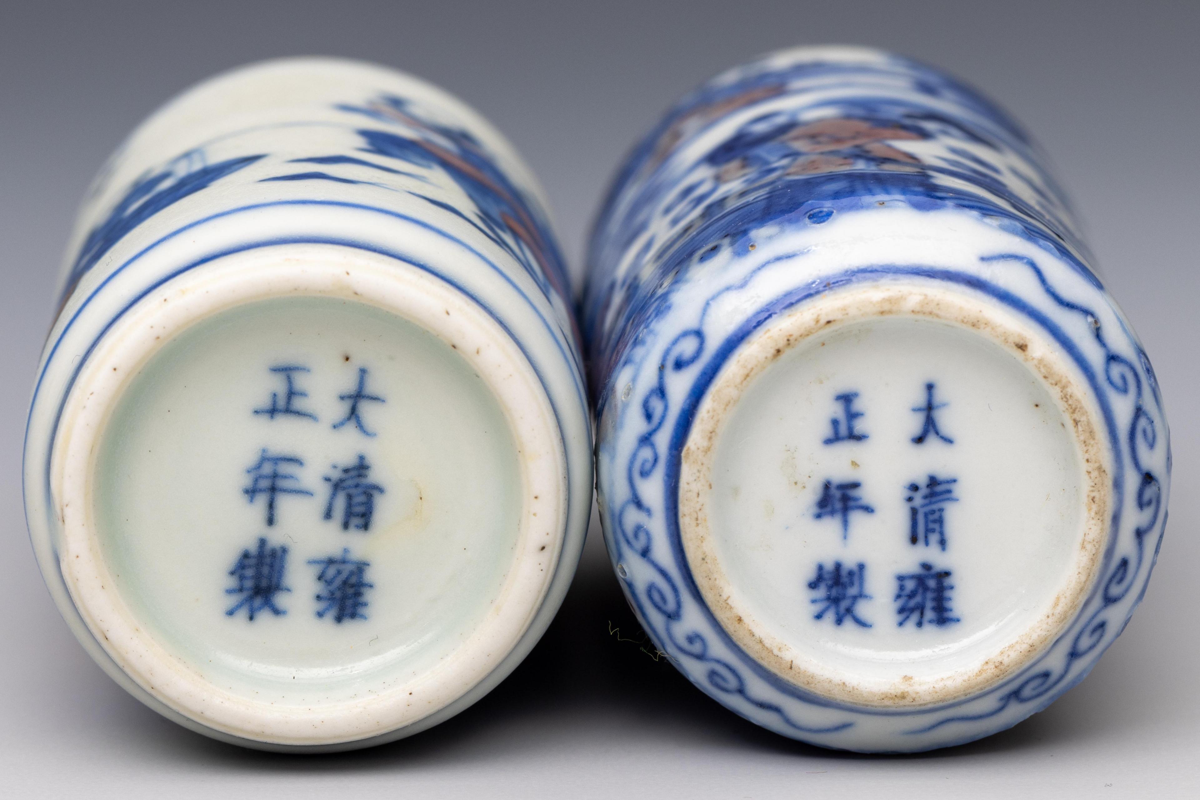 both cylindrical, one painted with scholars and boys and the other with ladies and boys at a lotus pond, both with apocryphal Yongzheng mark (minor frits)