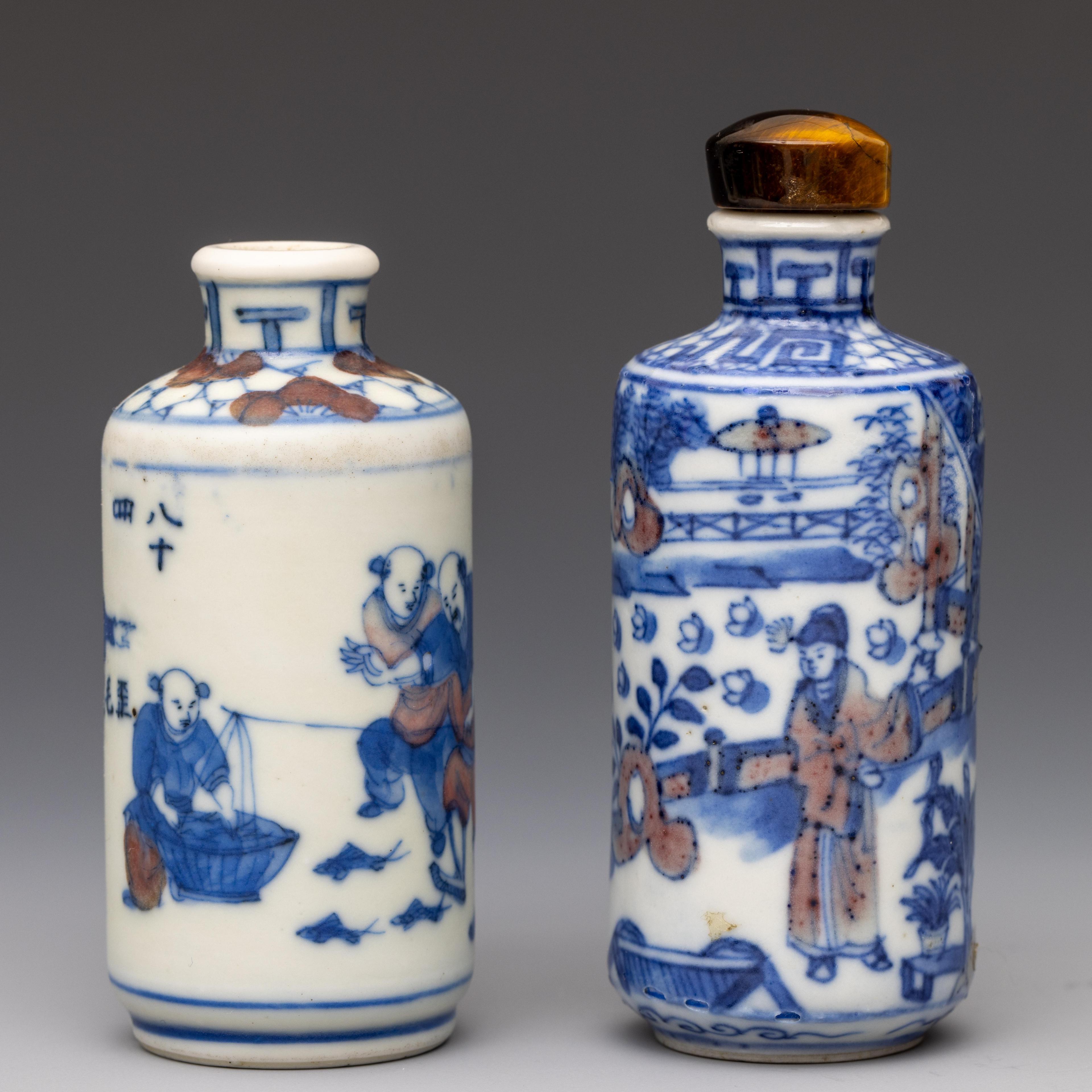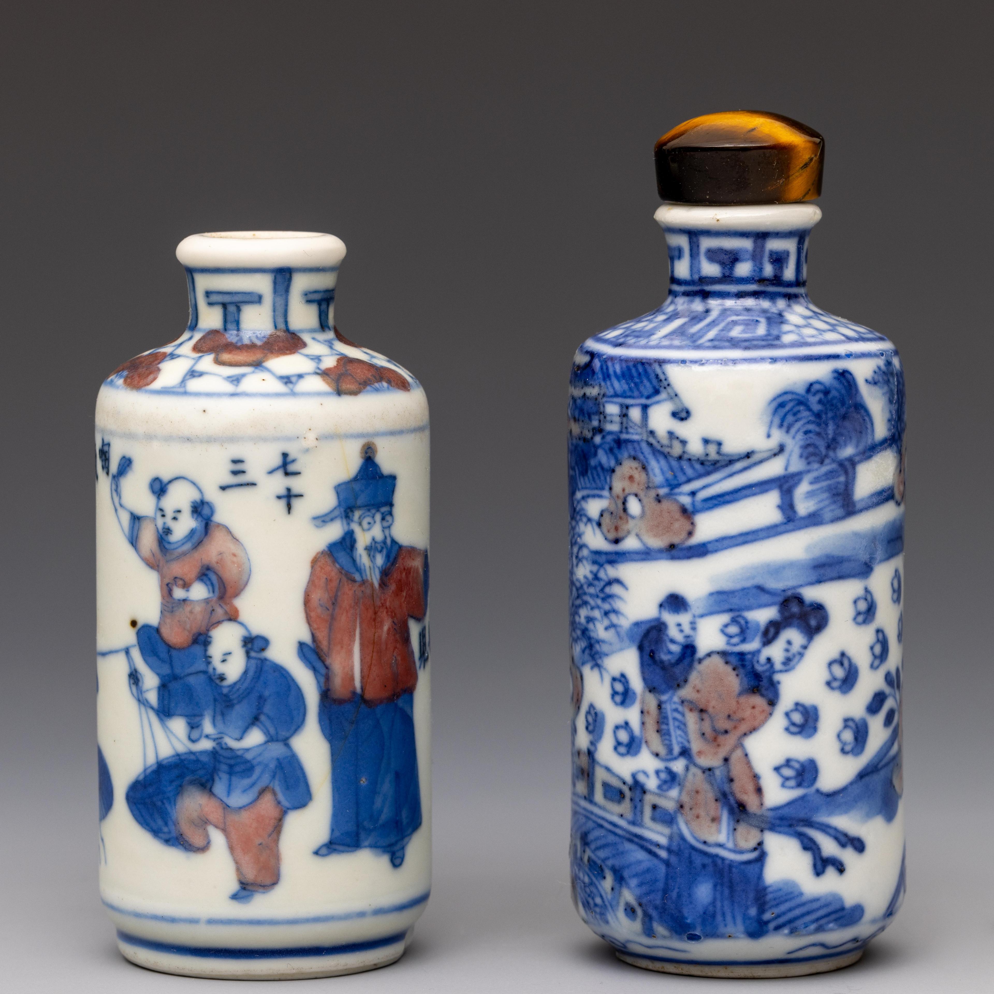 China, two blue and white and iron-red porcelain figural snuff bottles and one stopper, 19th century,