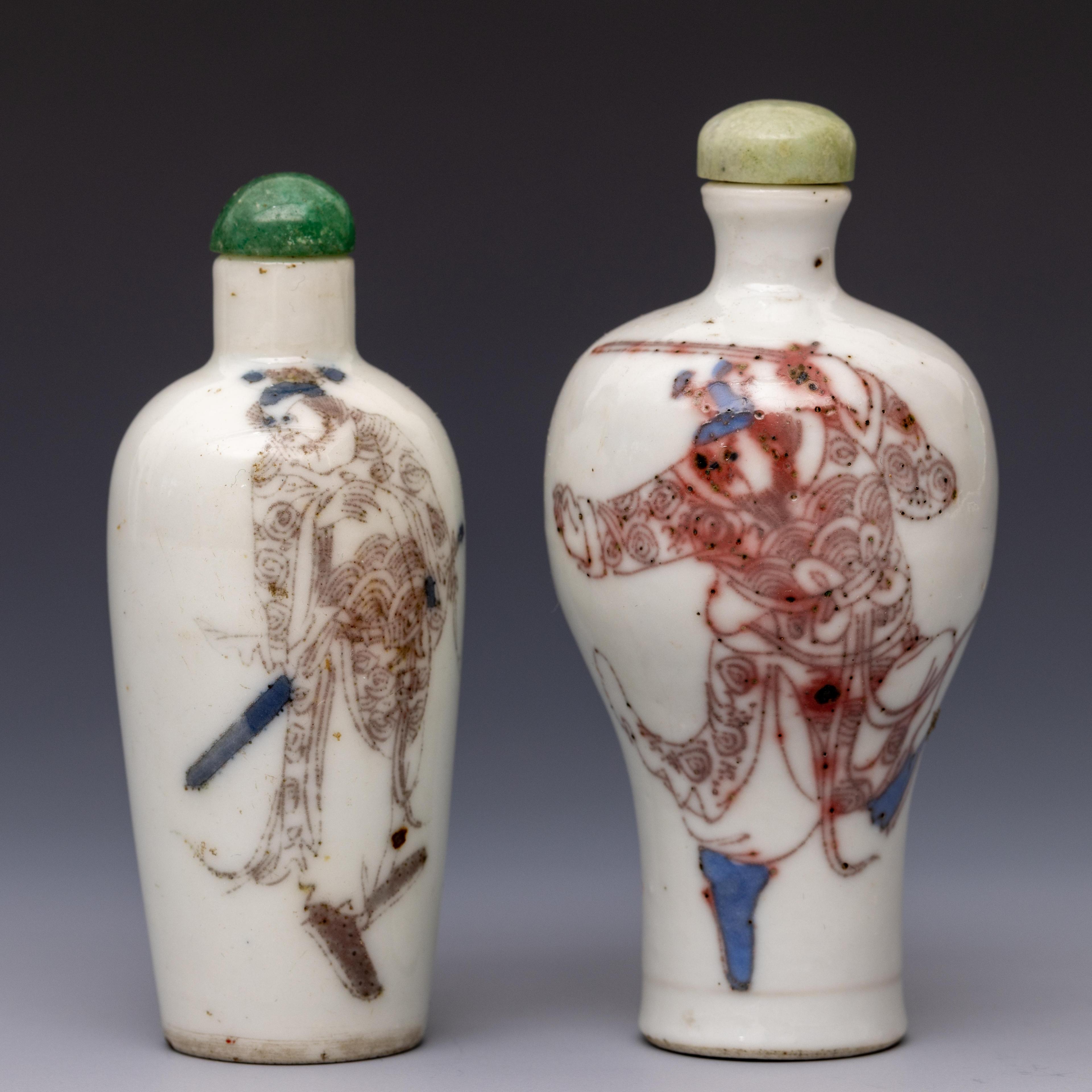 China, two blue and white and iron-red porcelain 'warrior' snuff bottles and stoppers, 19th century,