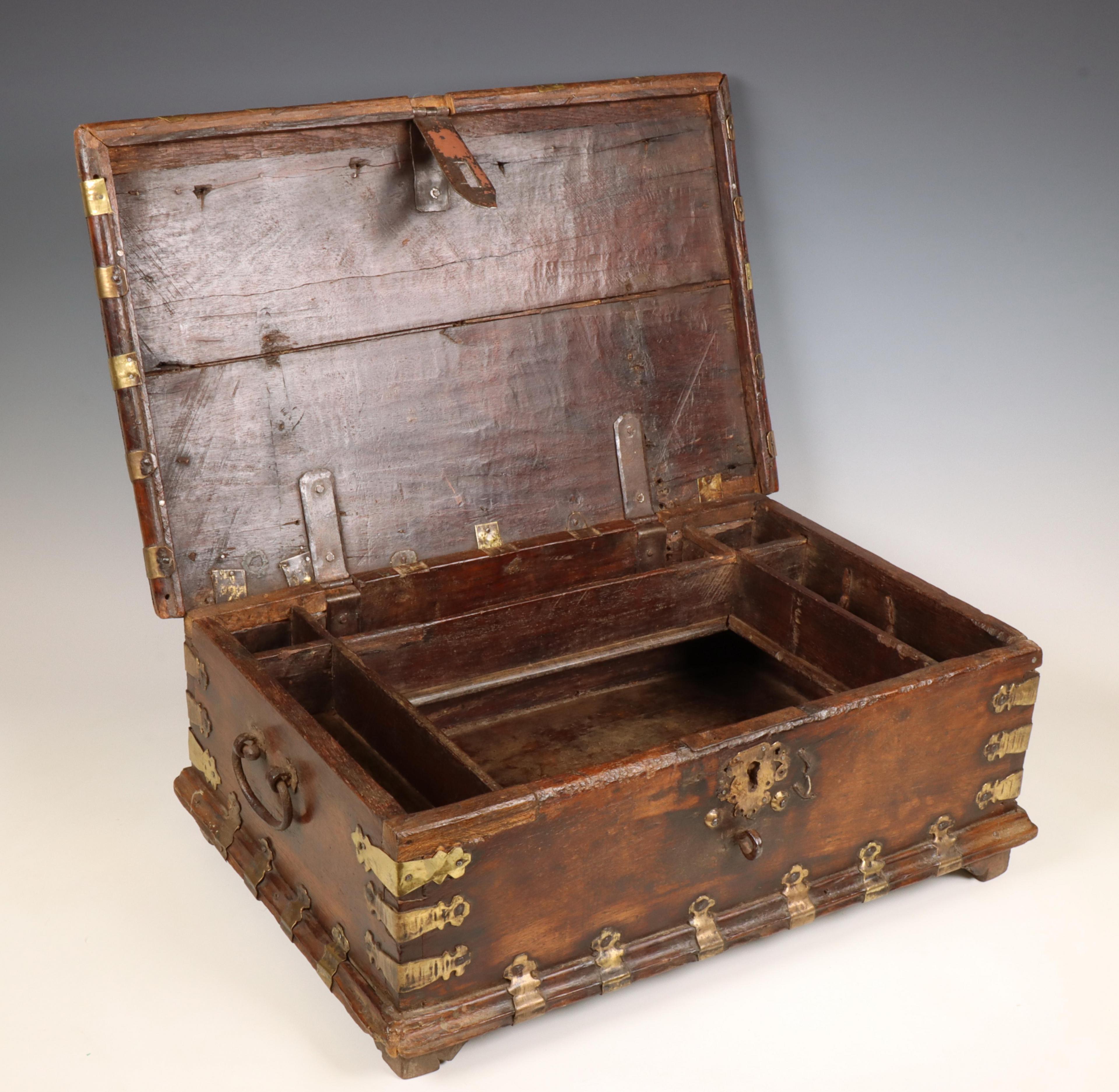 Interieur met verschillende vakken. Met deels later koperen beslag en handvatten.