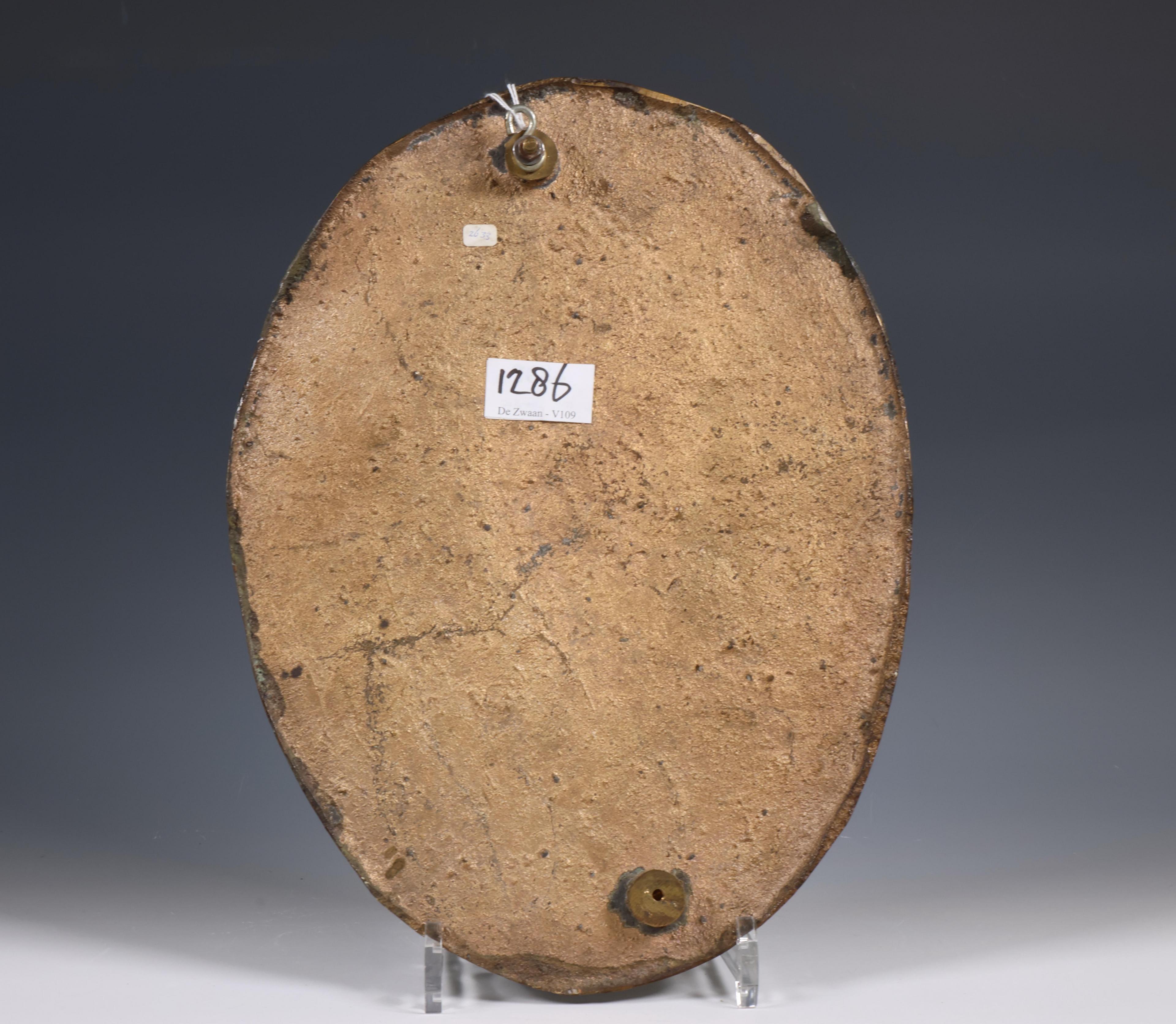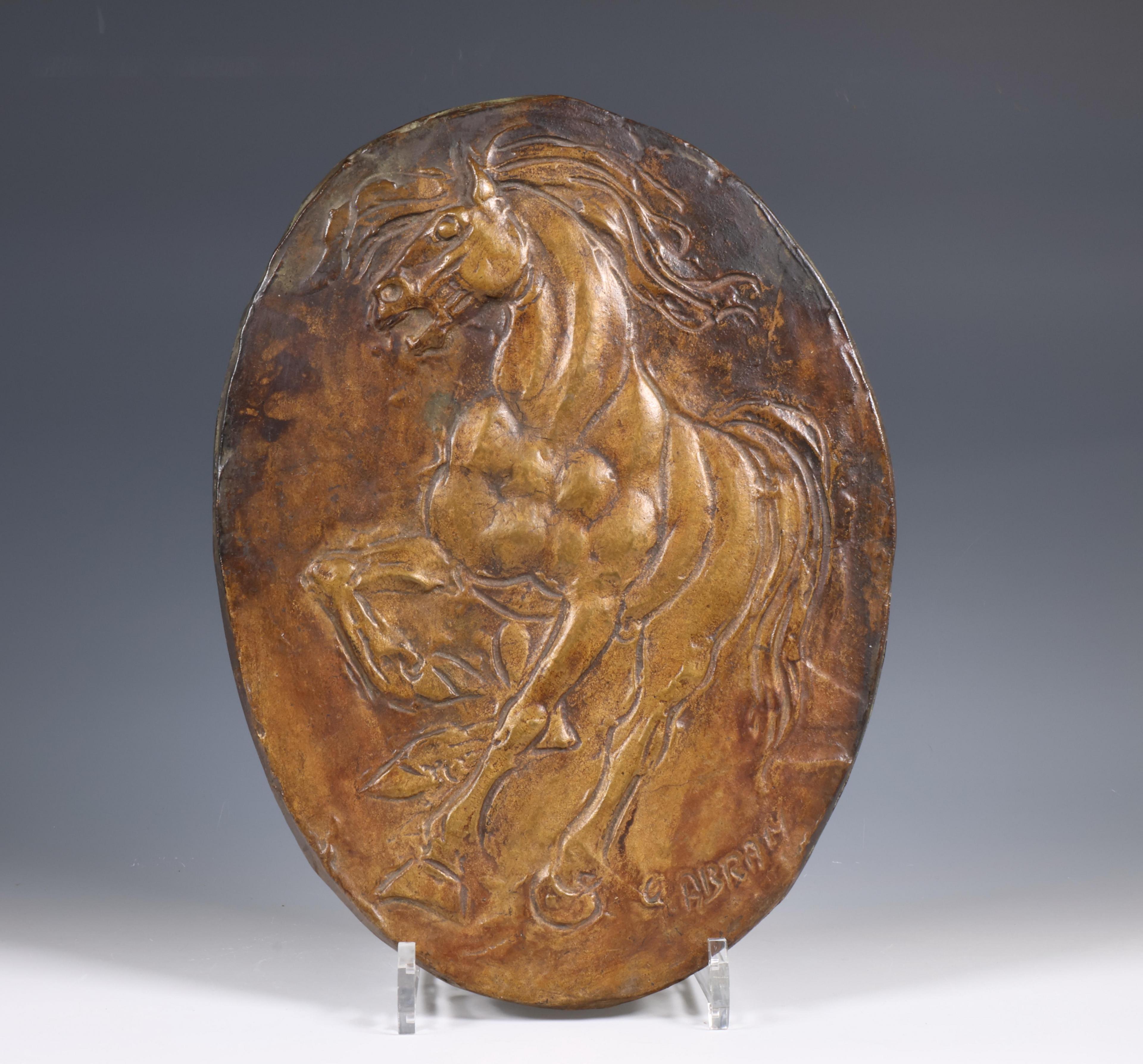 Ovale bronzen plaquette, galopperend paard. Gesigneerd r.o.