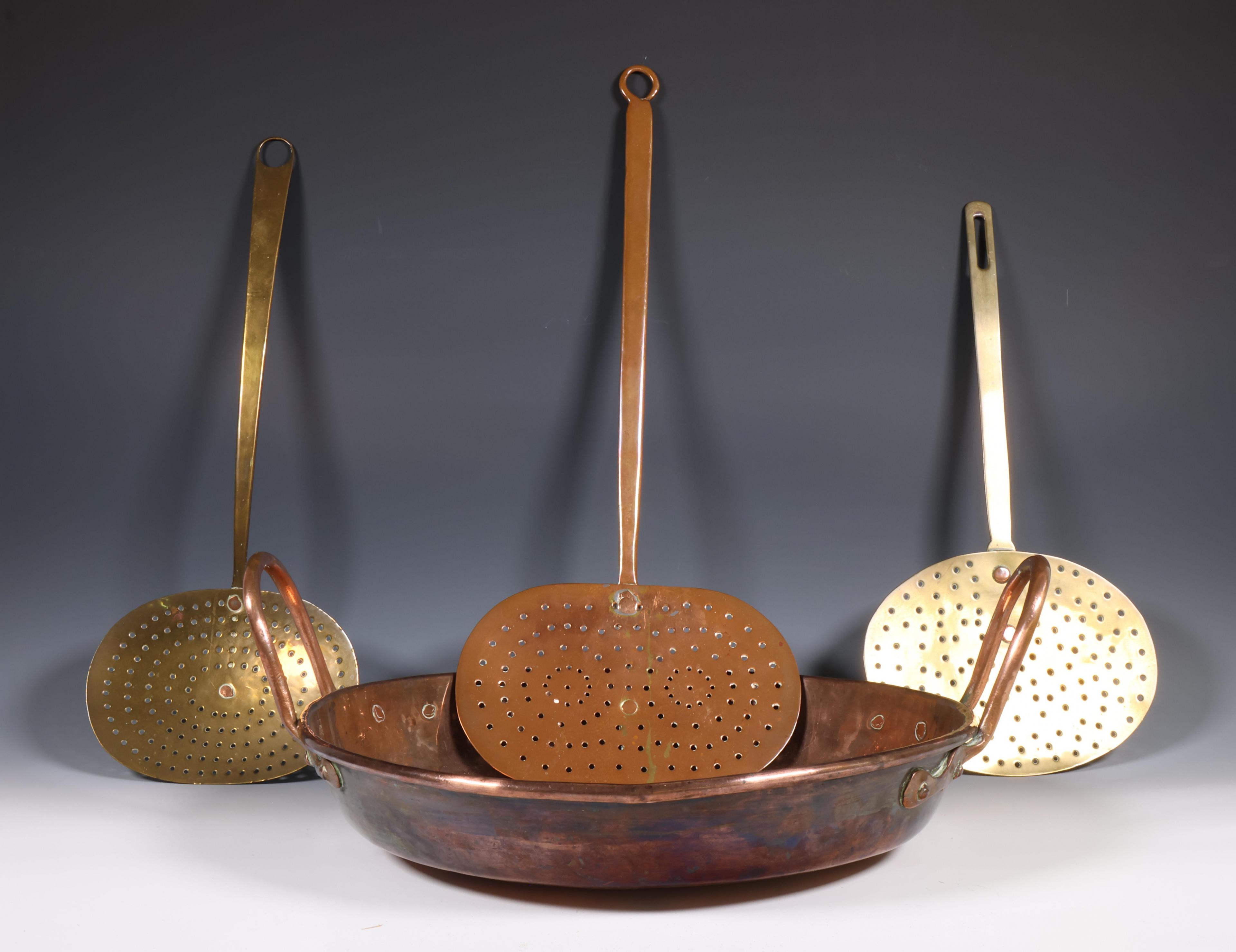 Roodkoperen spekpan en drie schuimspanen, 19e eeuw;