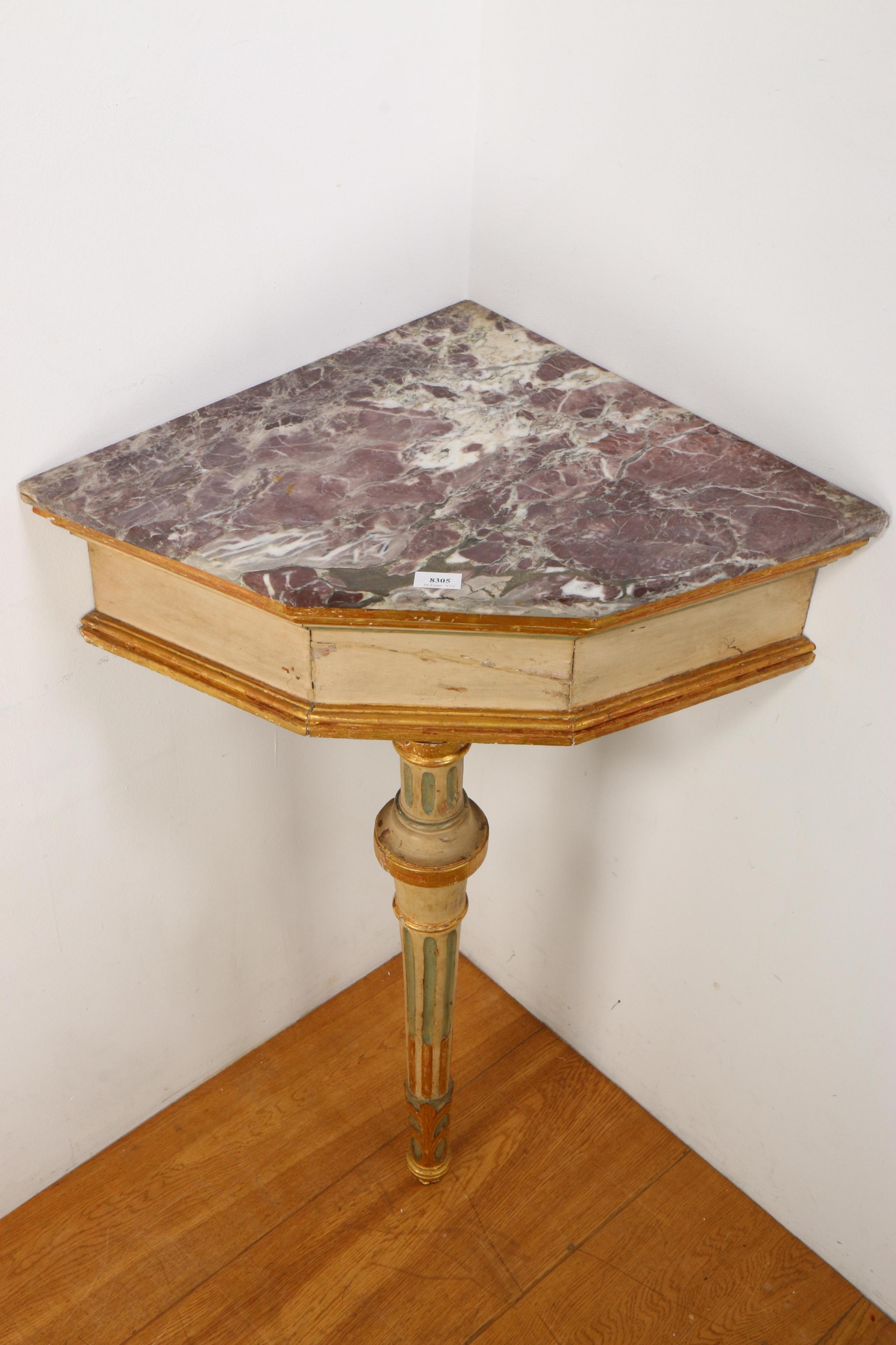 Polichroom geschilderde grenen- en beukenhouten hoekconsoletafel, Louis XVI,