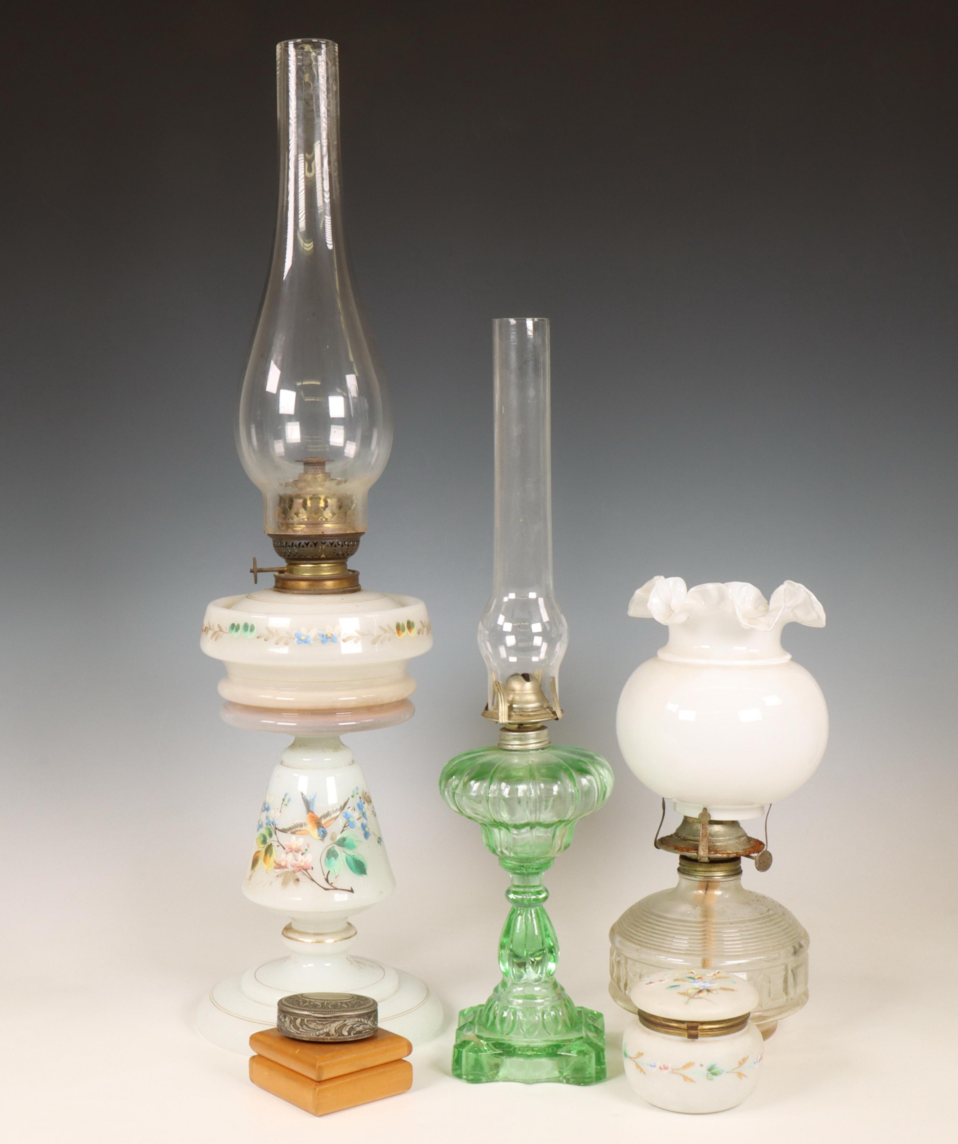 Samen met een beschilderde, opaline glas dekseldoos, en twee glazen olielampen.