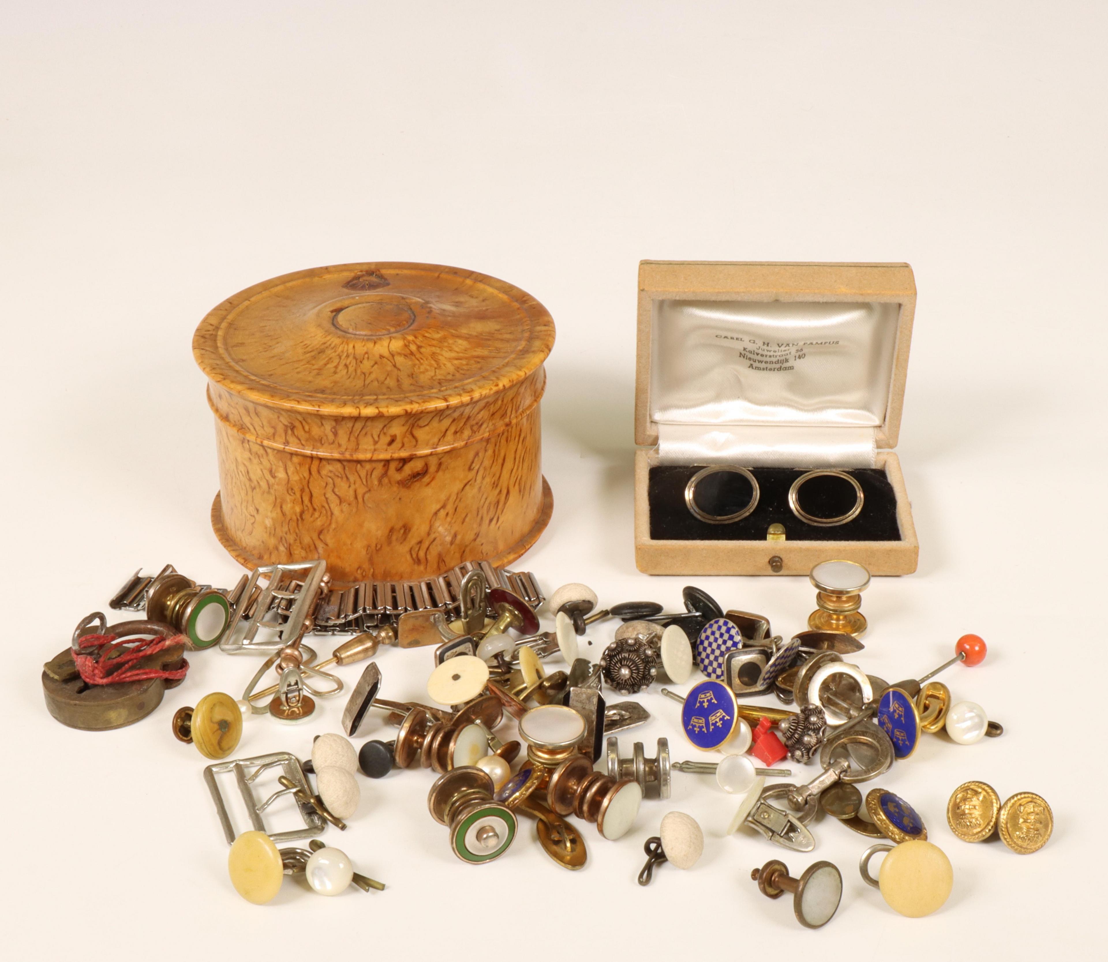 Gedraaid esdoornhouten doosje met diverse paren manchetknopen.