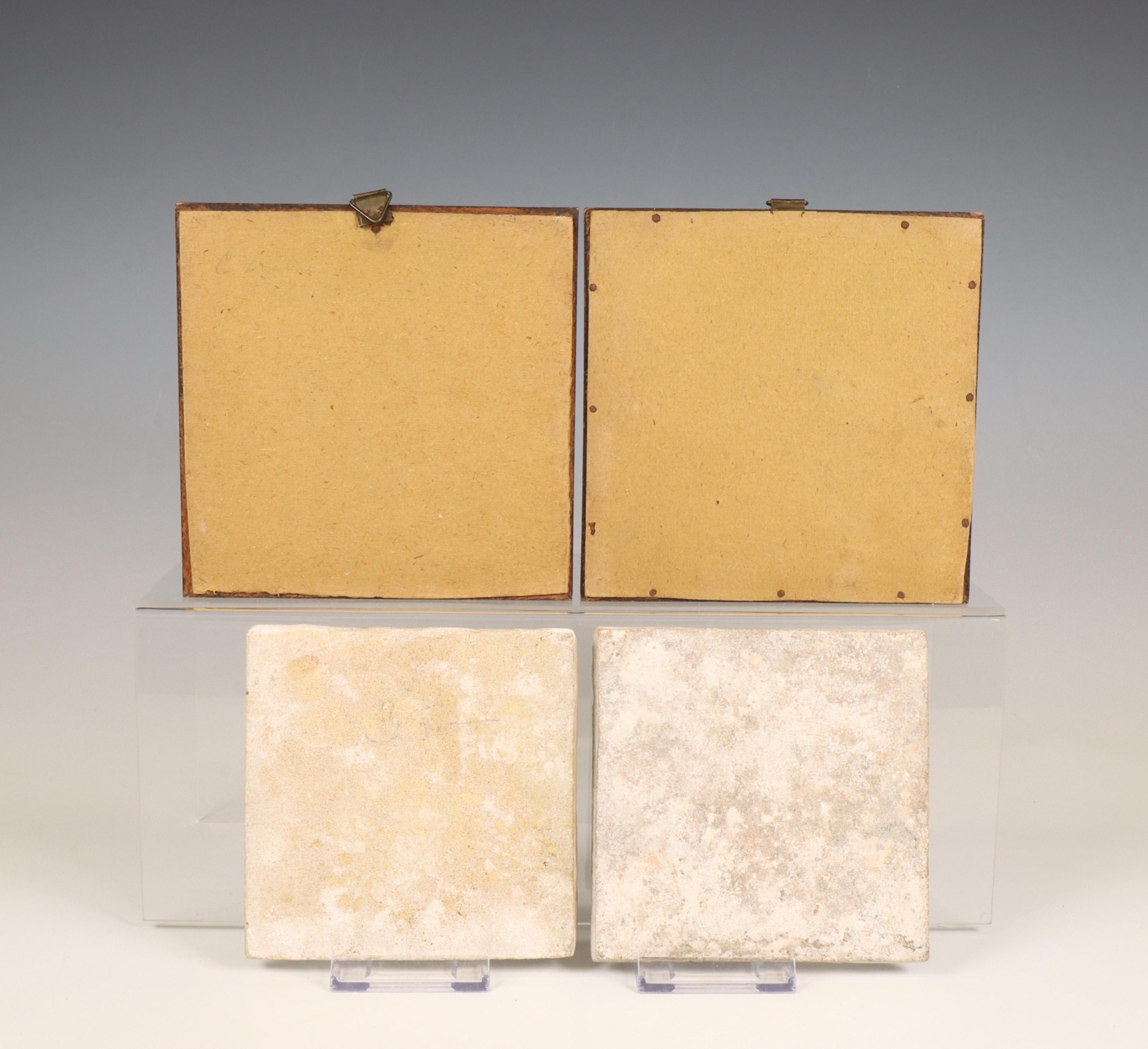 Delft, vier blauw-wit geschilderde tegels, 17e eeuw.