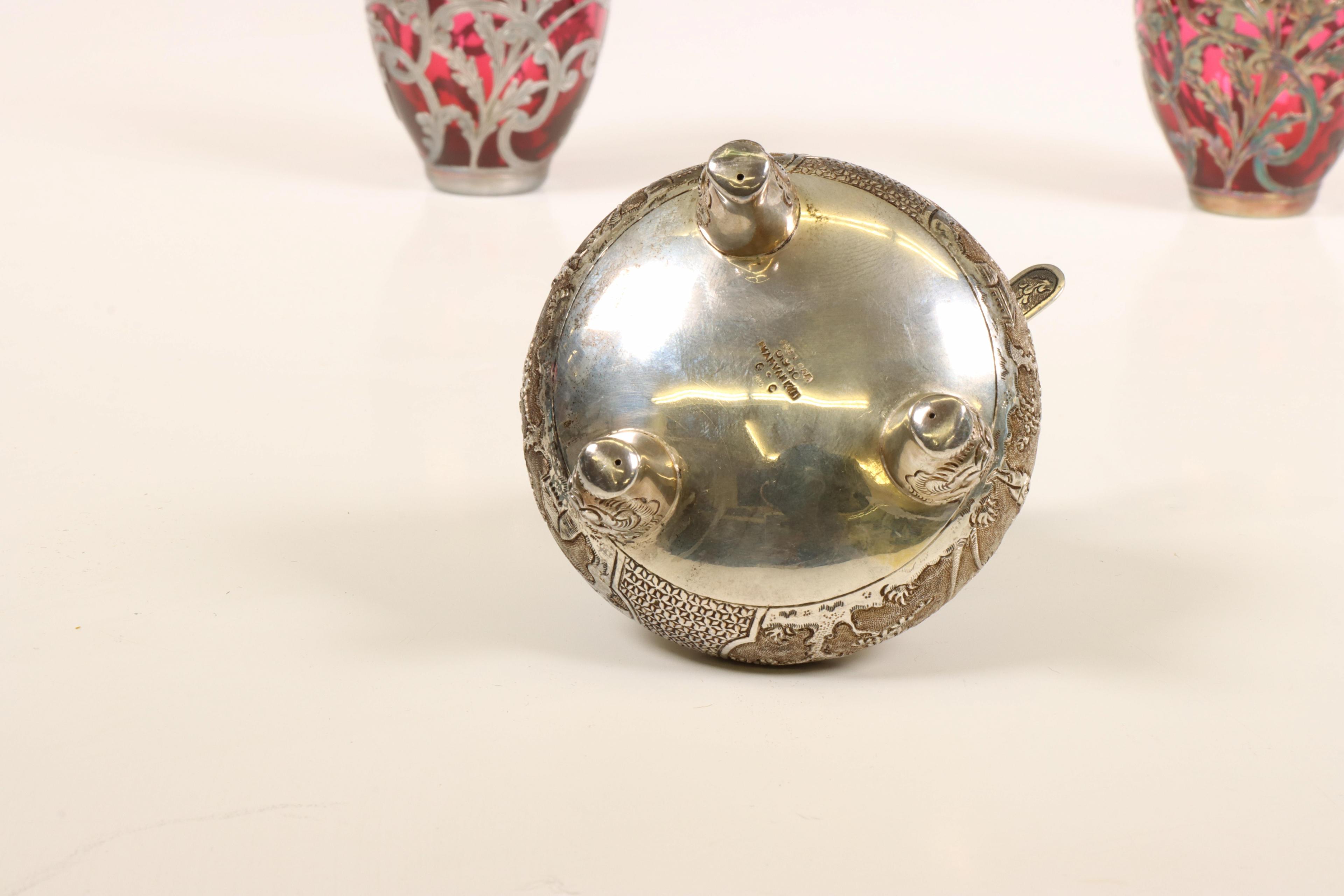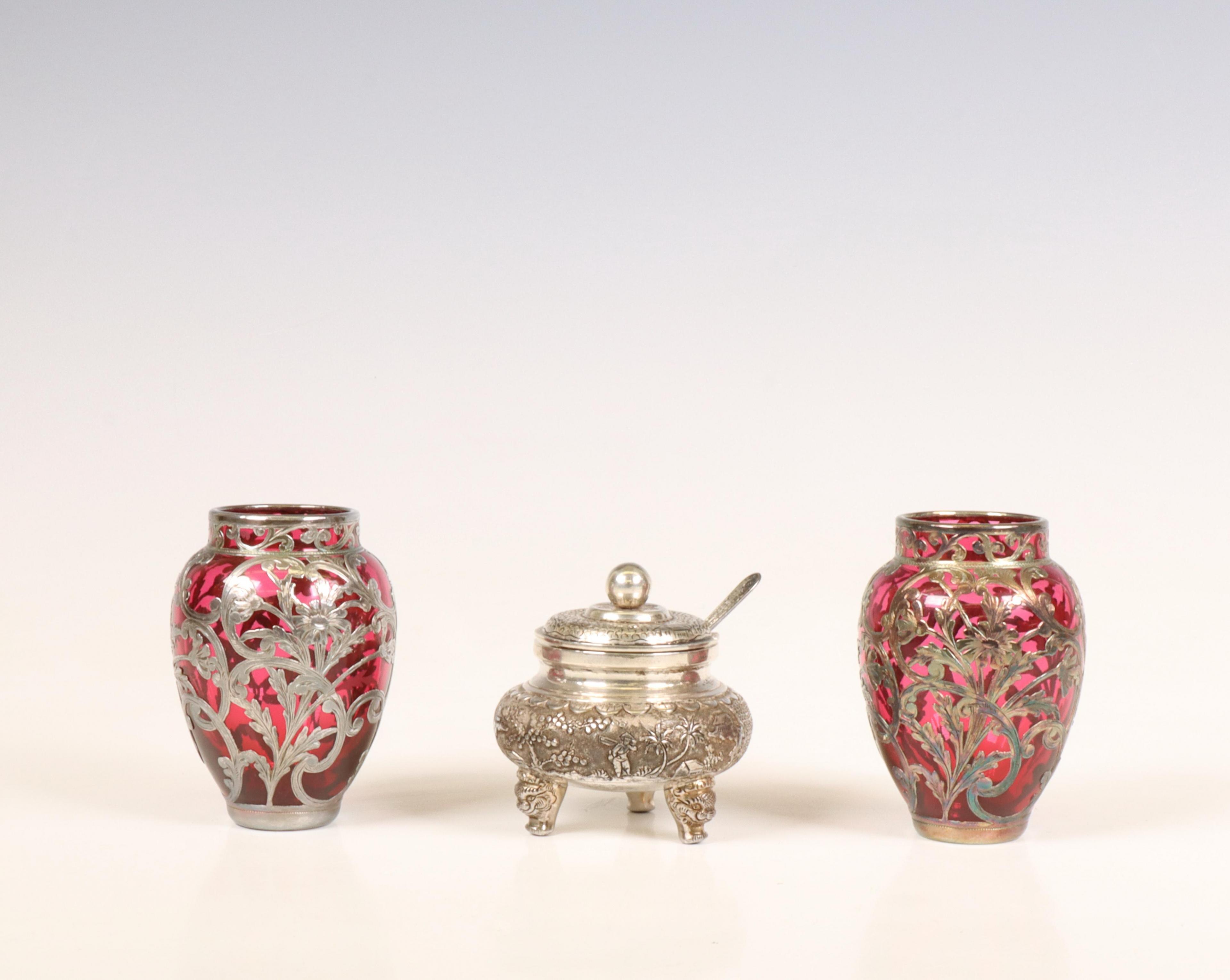 Paar cranberry glazen vaasjes met floraal gegraveerde zilveren monturen, ca. 1900;