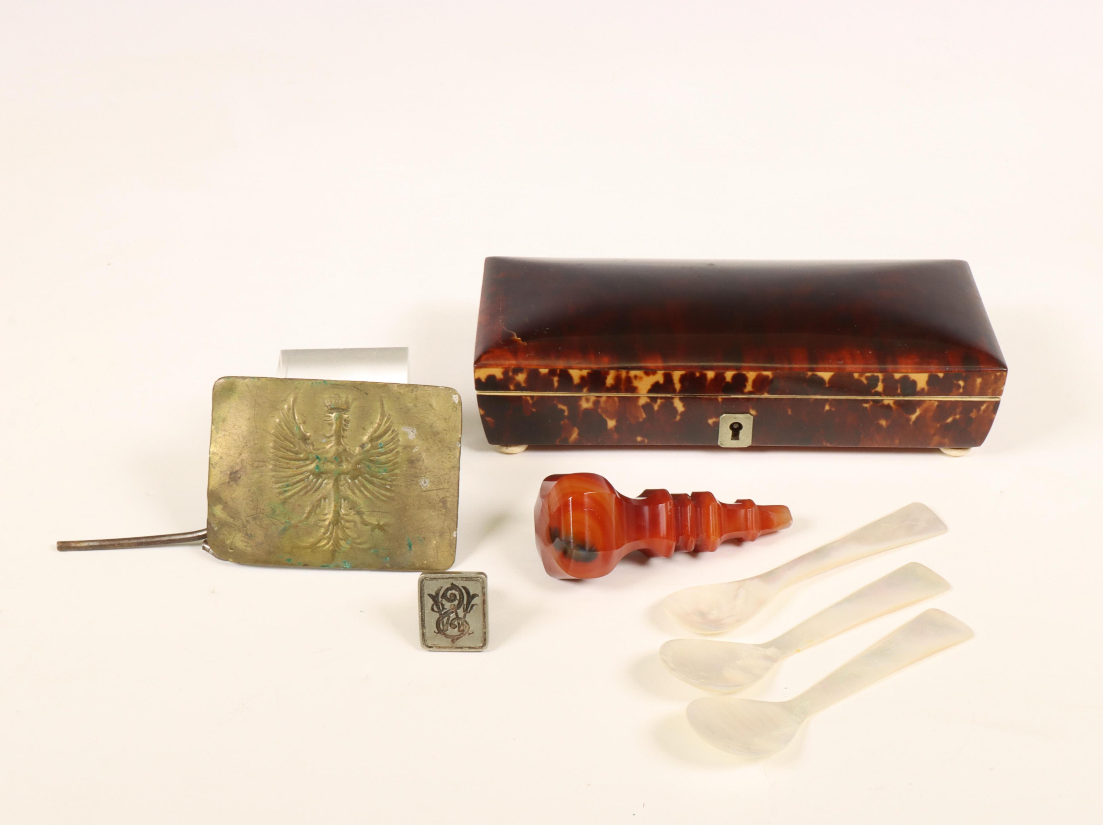 Schildpad lepeldoosje, cachet met agaten heft en koperen riemgesp;