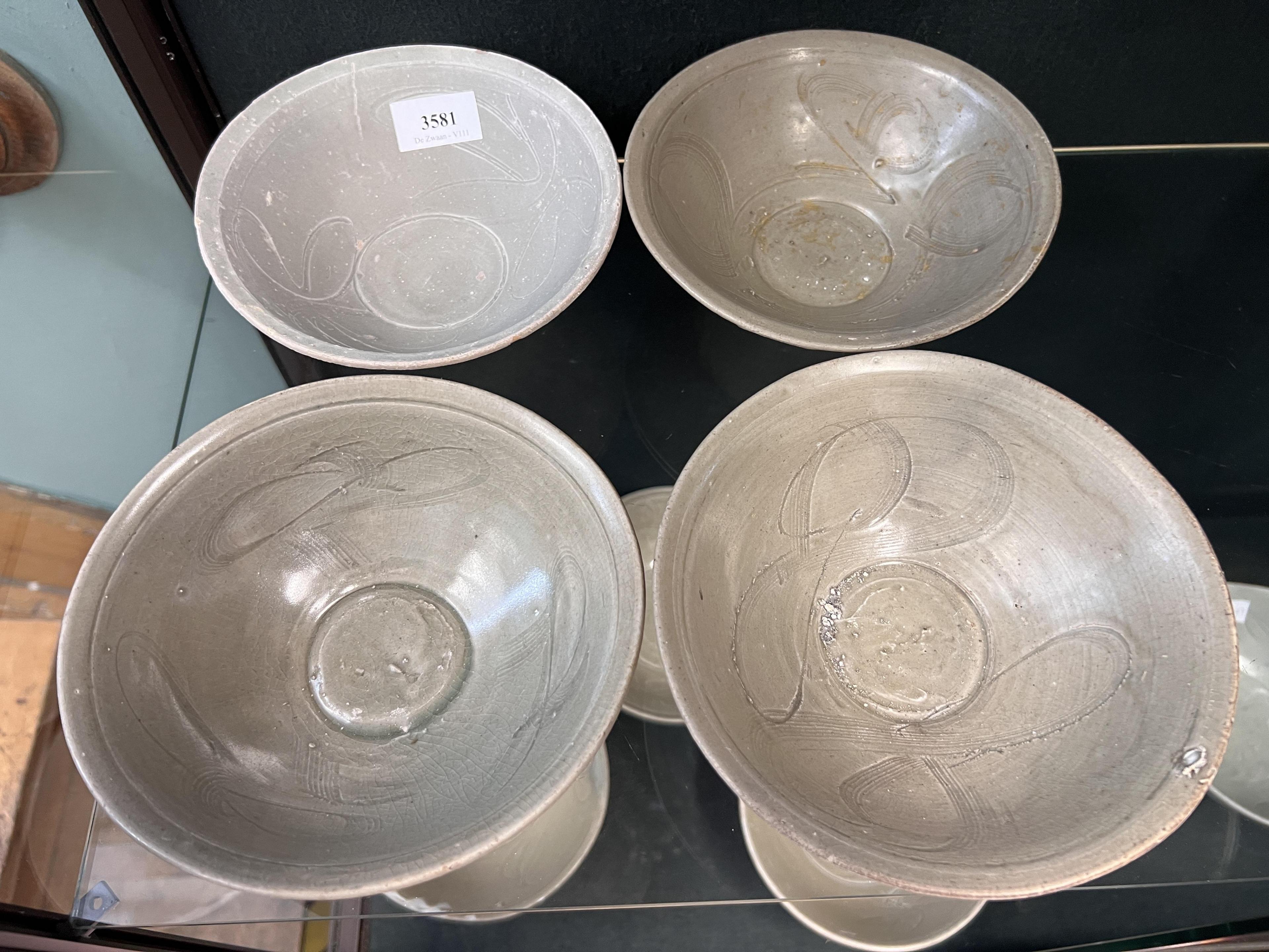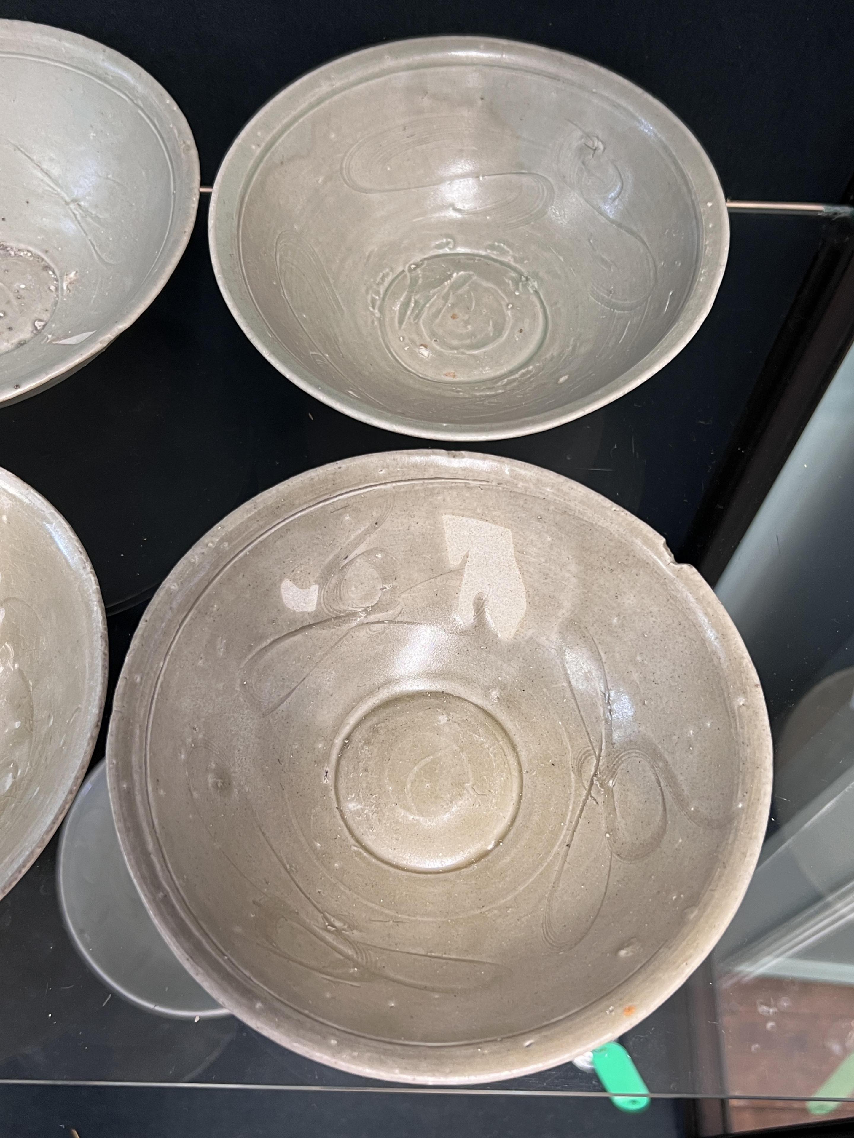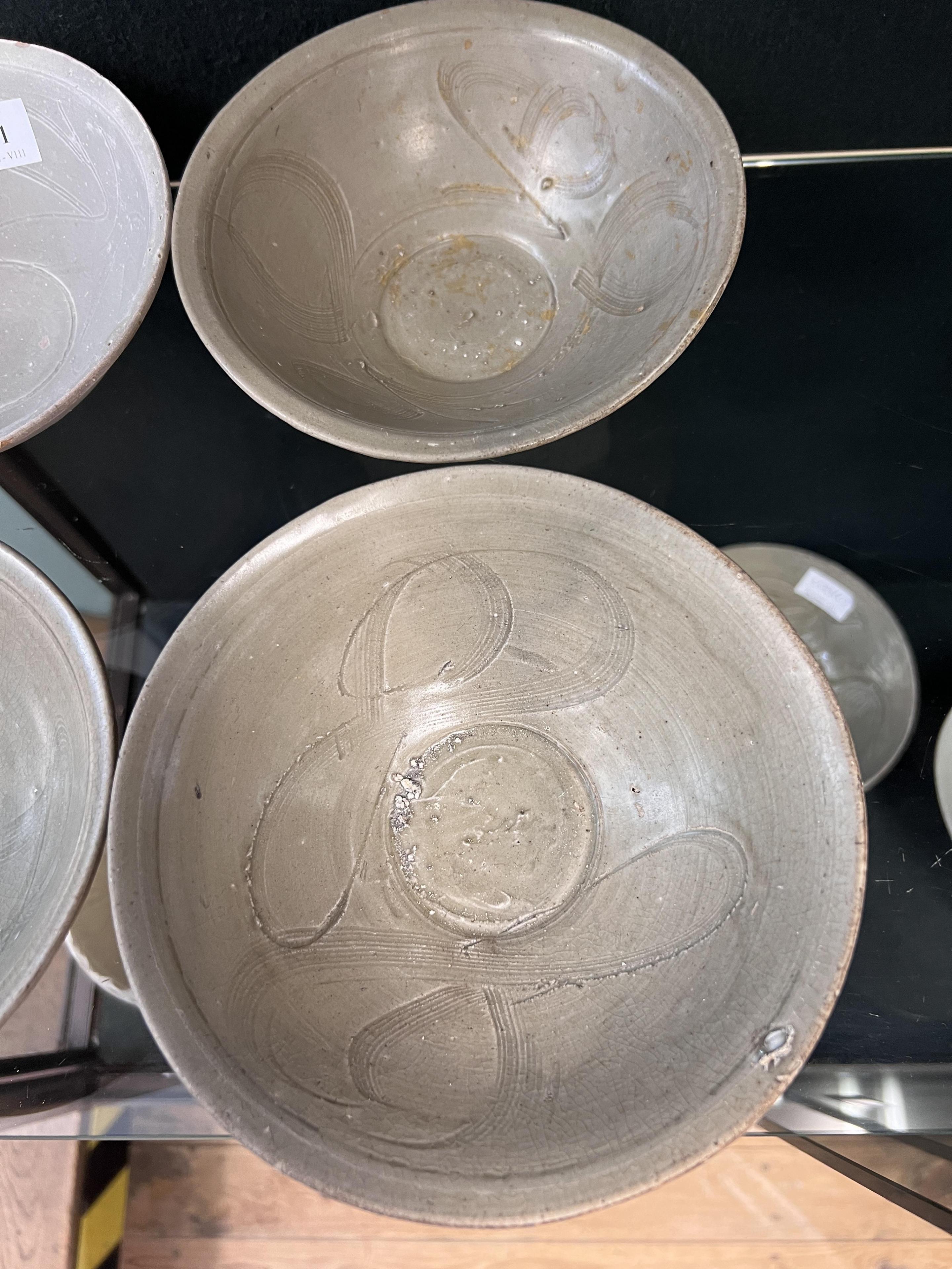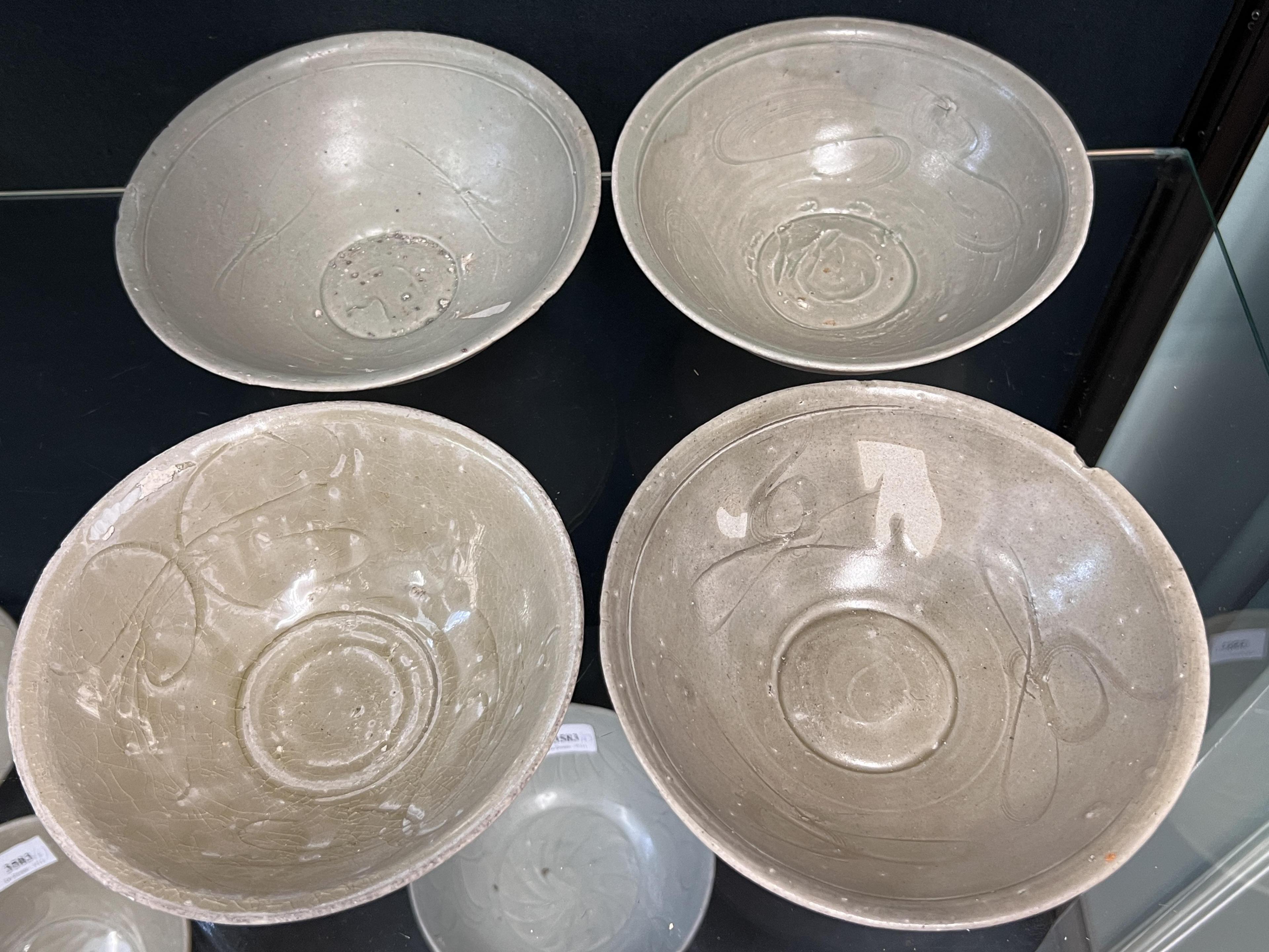 each with incised flowing decoration and covered with various tones of even greenish grey glazes (some small chips and light wear due to exposure to sea water)