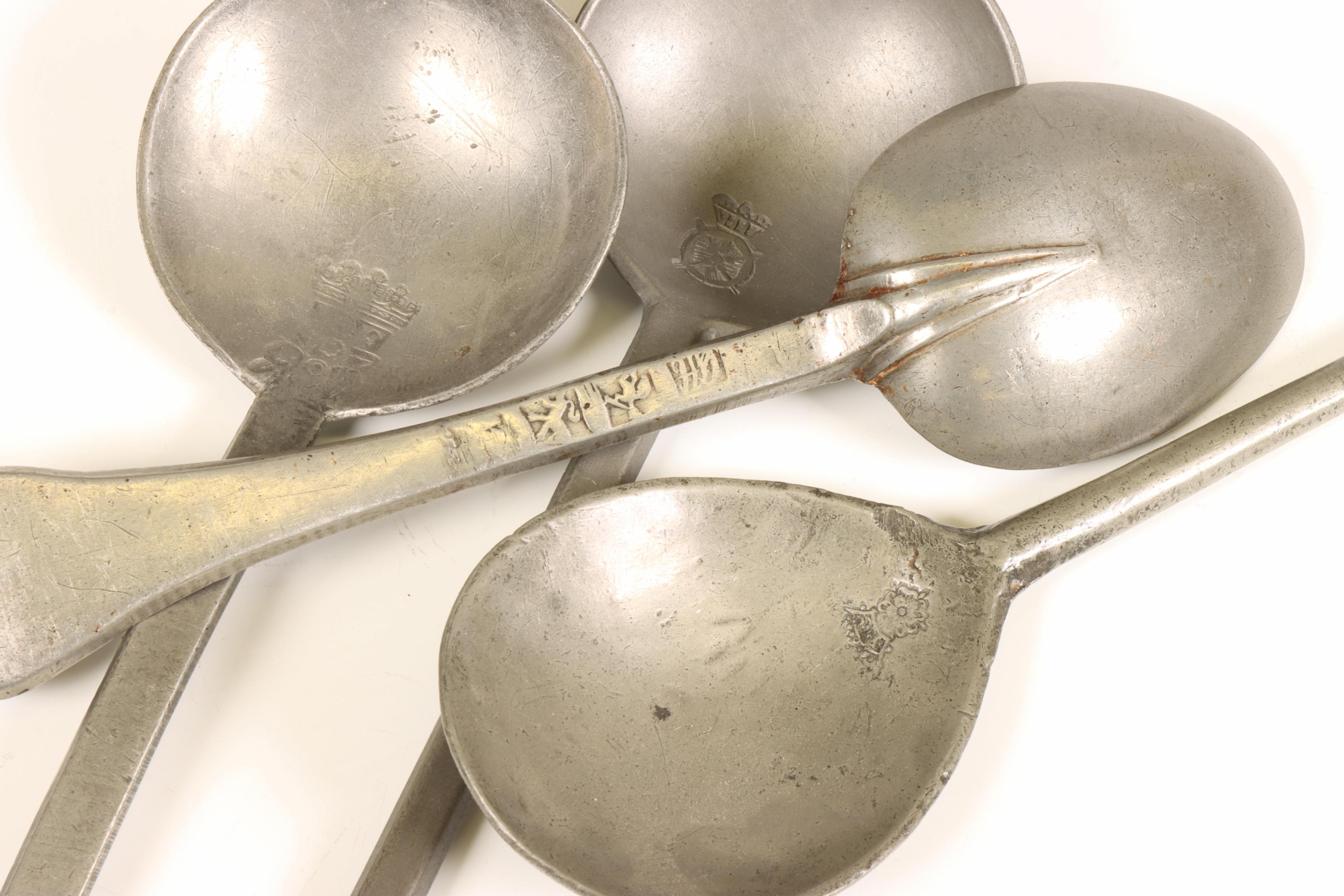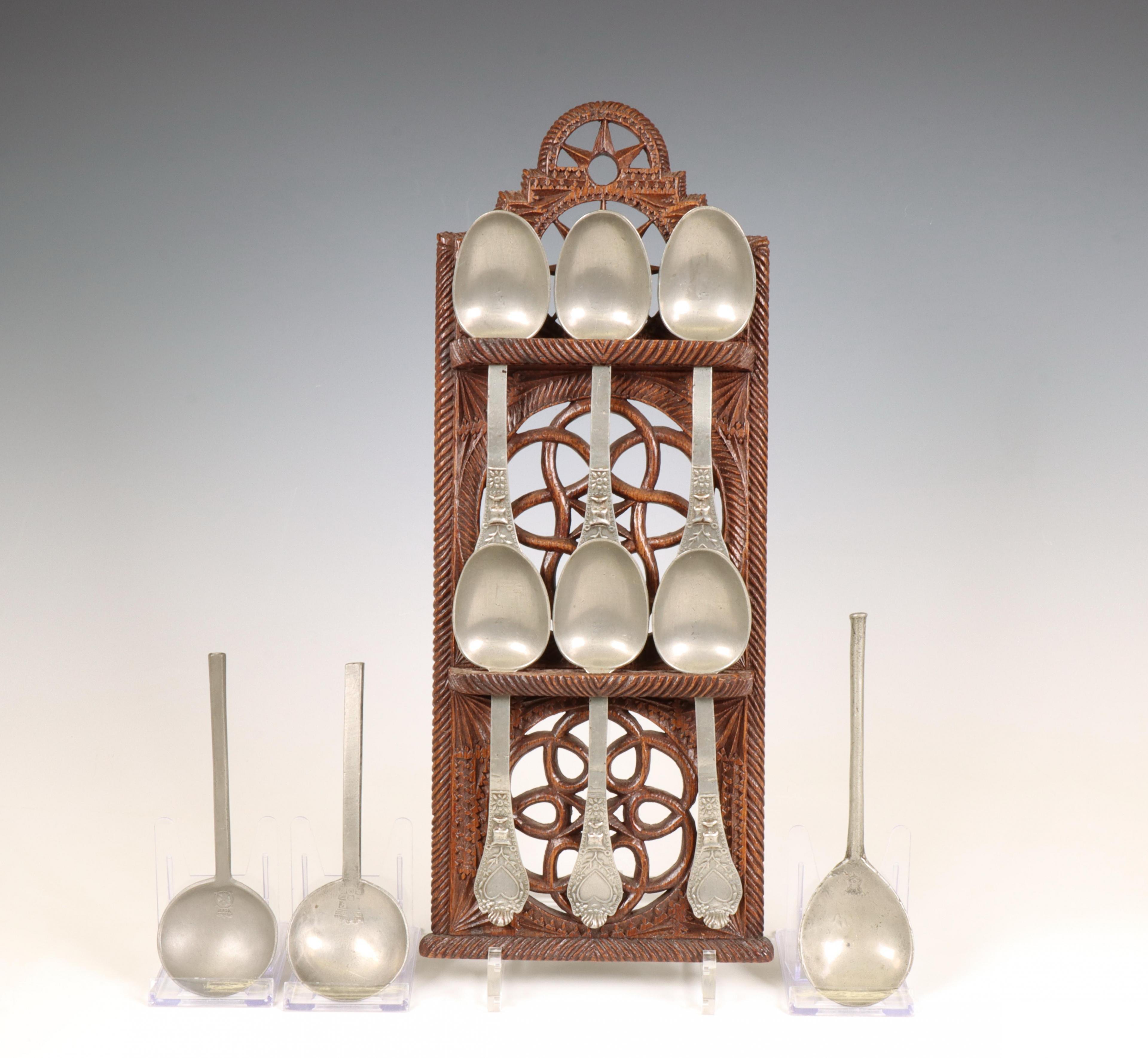 Het lepelrek met kerfsnede decoratie. De lepels met ovale bak en geprofileerde rattenstaart, allen gemerkt. Hierbij drie tinnen lepels met ovale bak en gietersmerk.