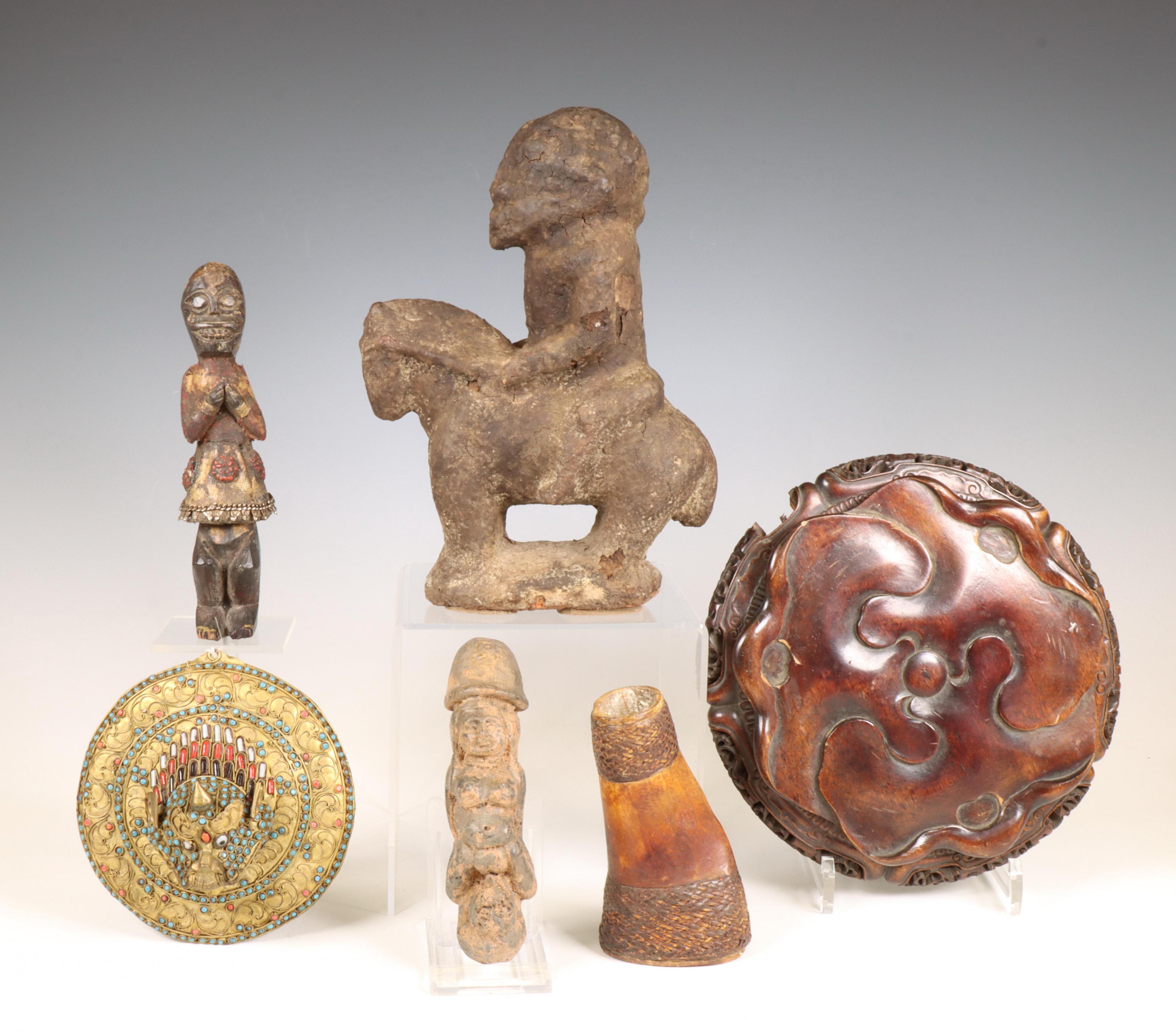 Tibetaans sierstuk, houten koro voet, en Afrikaanse sculptuur.