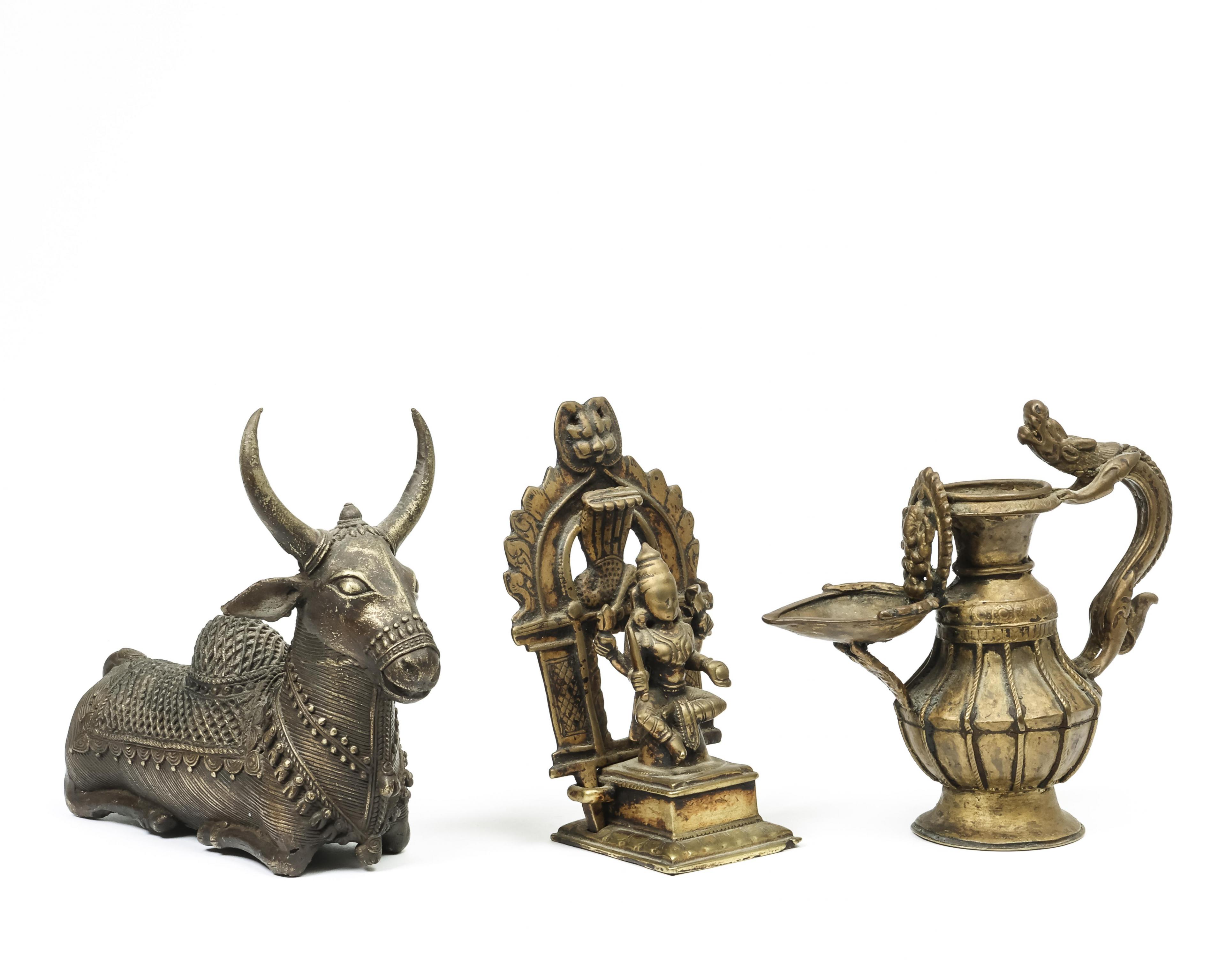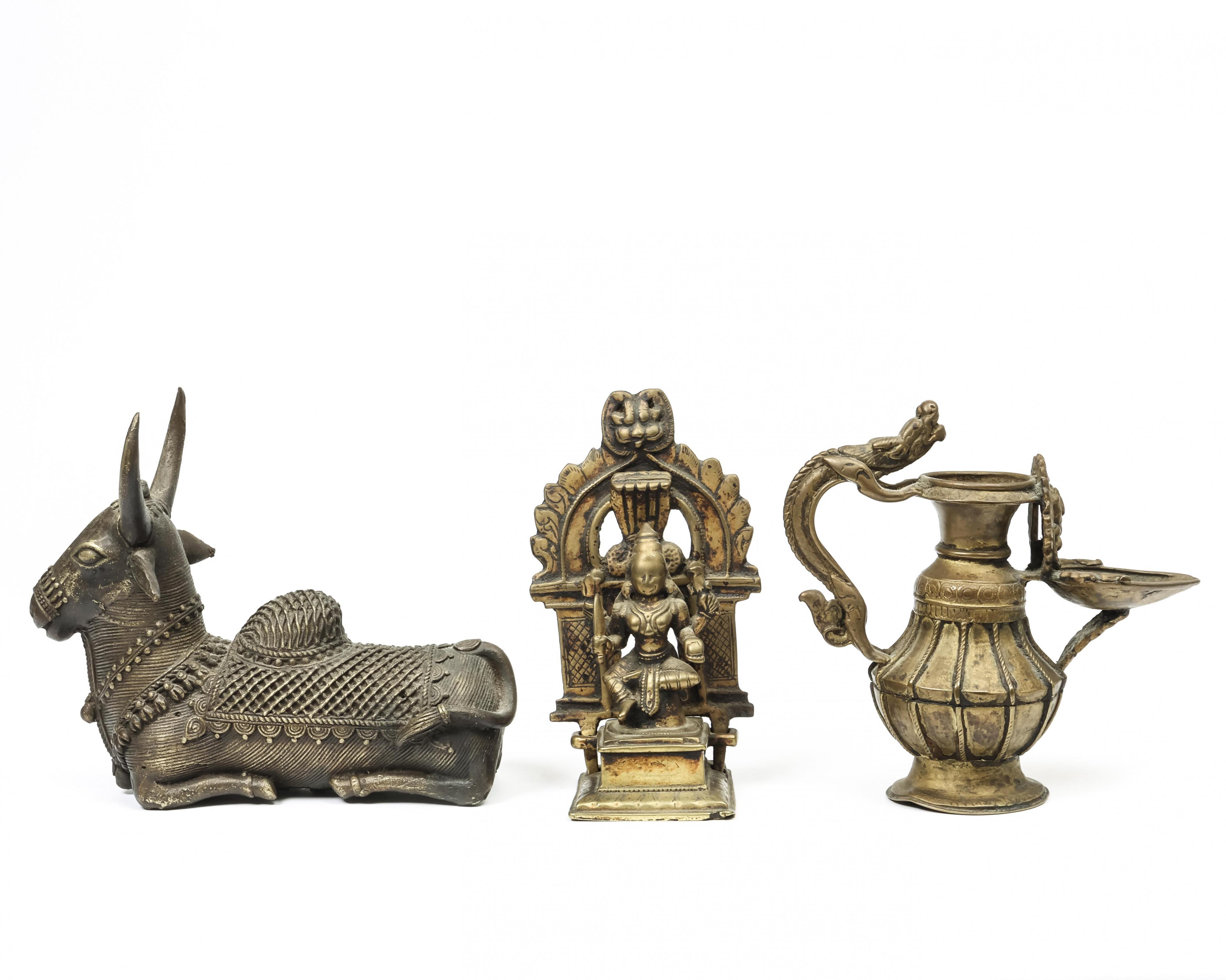 een beeldje voorstellende Durga gezeten op een troon voor een mandorla, het andere beeldje in de vorm van een koe, de olielamp met drakengreep (slijtage en kleine beschadigingen)