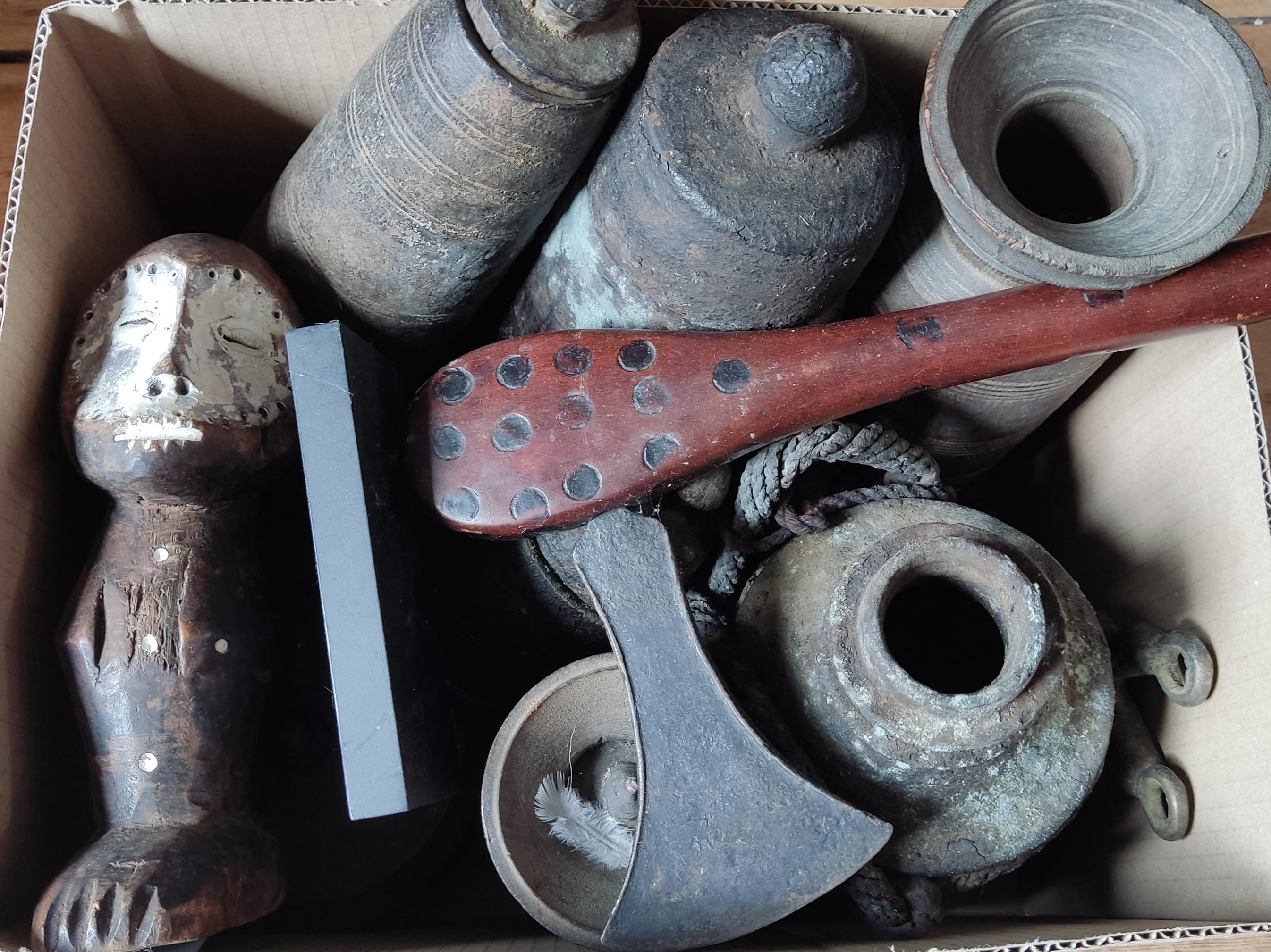 Samen met zeven koperen olielamp lepels en decoratieve Afrikaanse objecten.