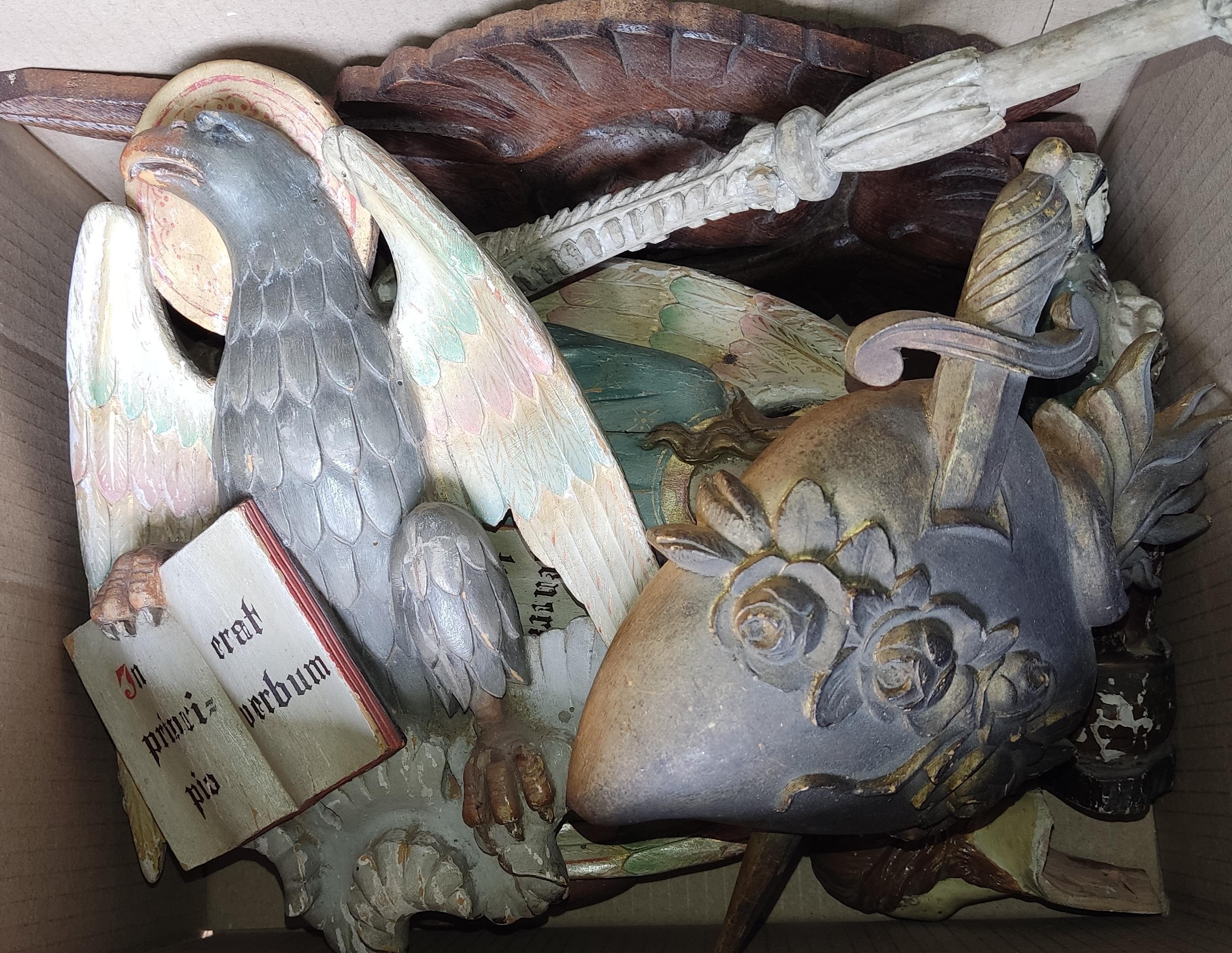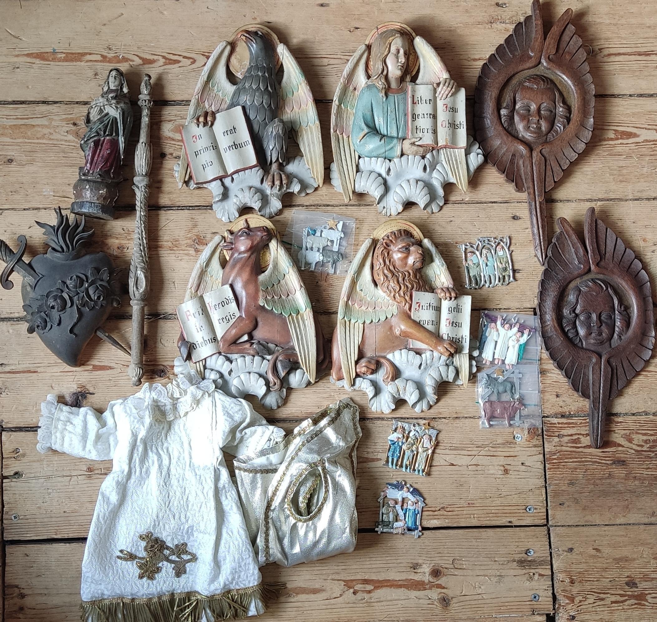 Waaronder polychrome, houten gestoken appliques met symbolen van de apostelen.