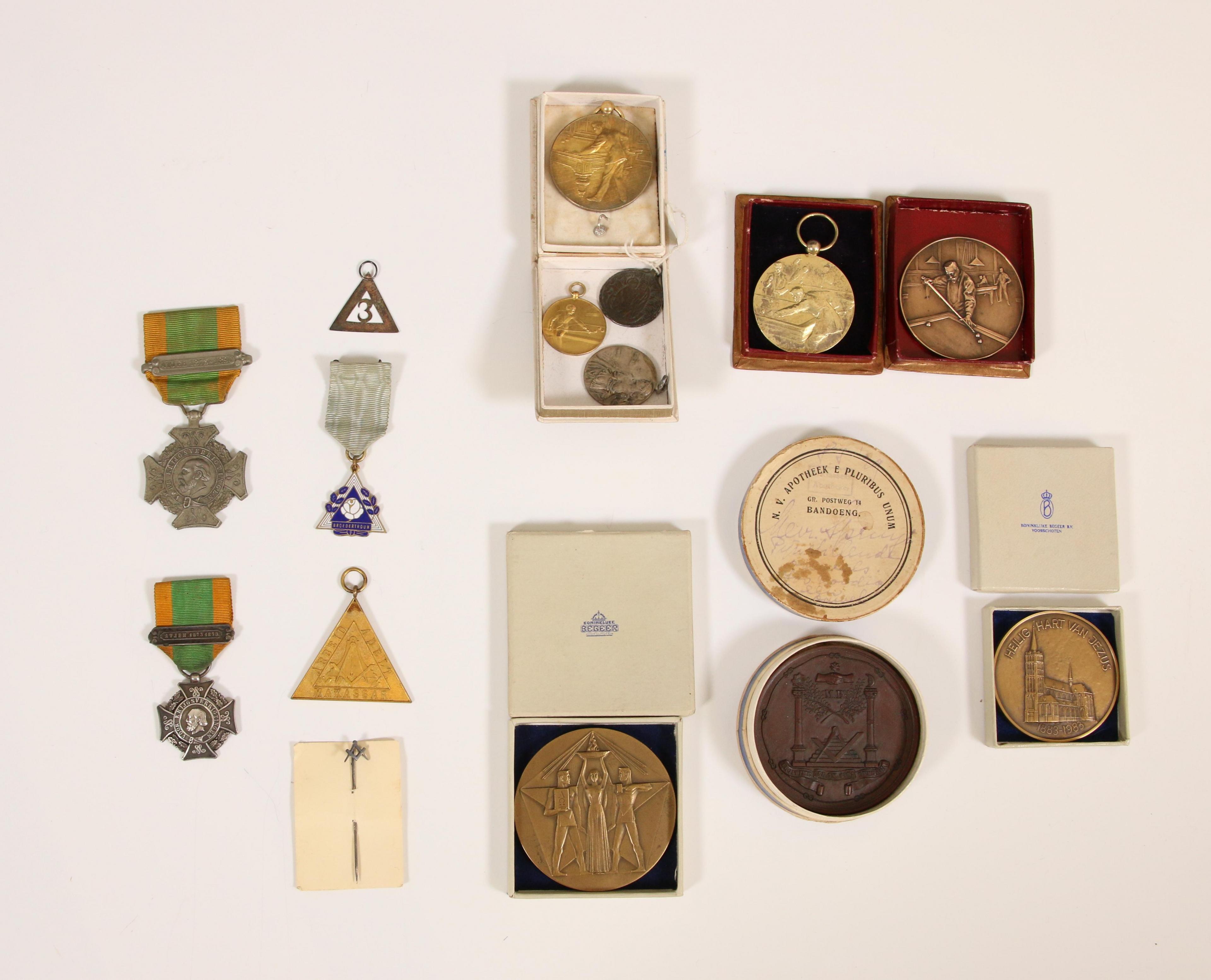 Diverse penningen mbt vrijmetselarij e.a. en twee medailles Krijgsverichtingen Atjeh 1875-1890;