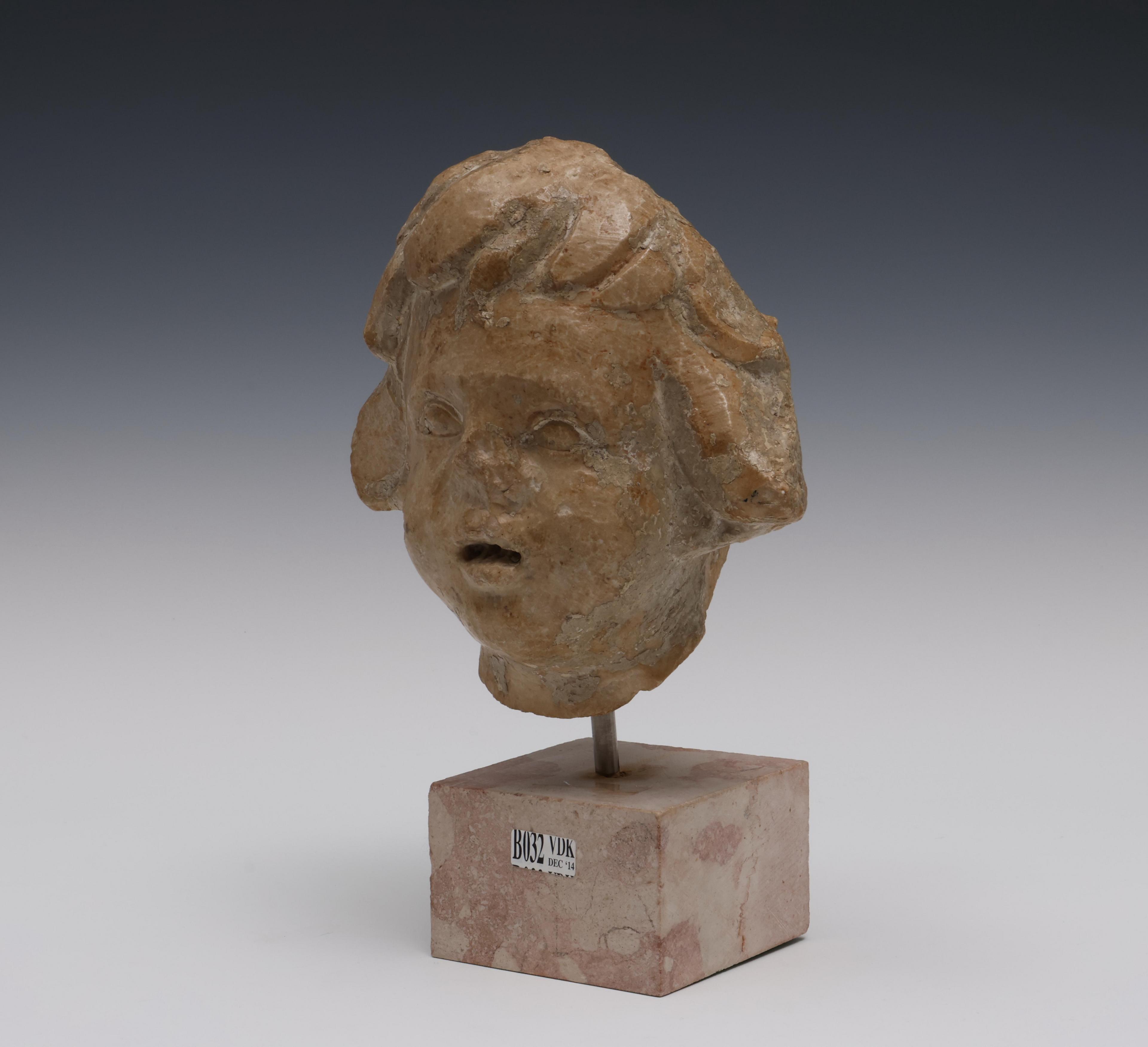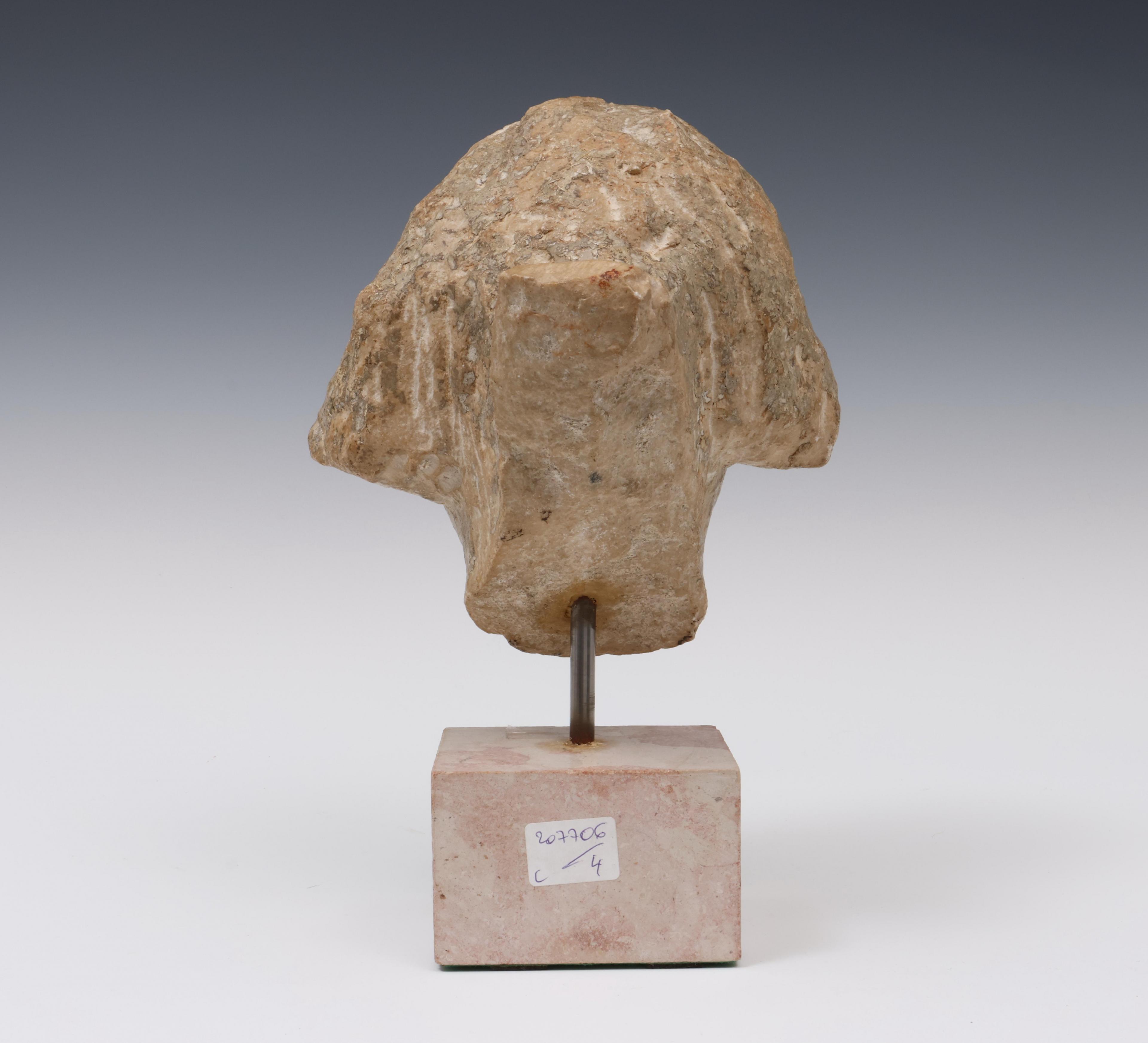 with remnants of a pigment layer and at the backside a protrusion, possibly once part of a larger figure group.