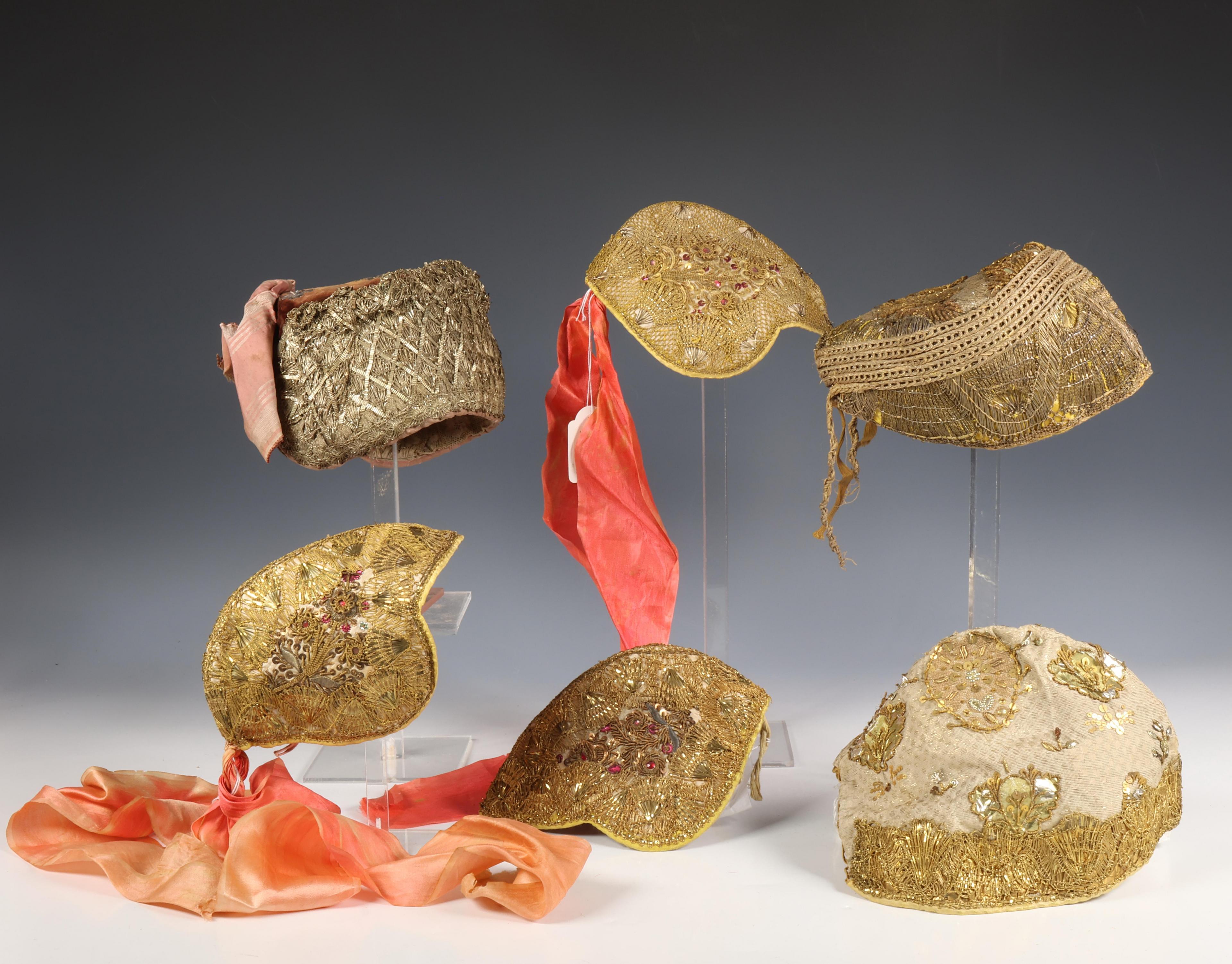 Diverse goudbrokaat en fluwelen hoeden, 18e eeuw en later