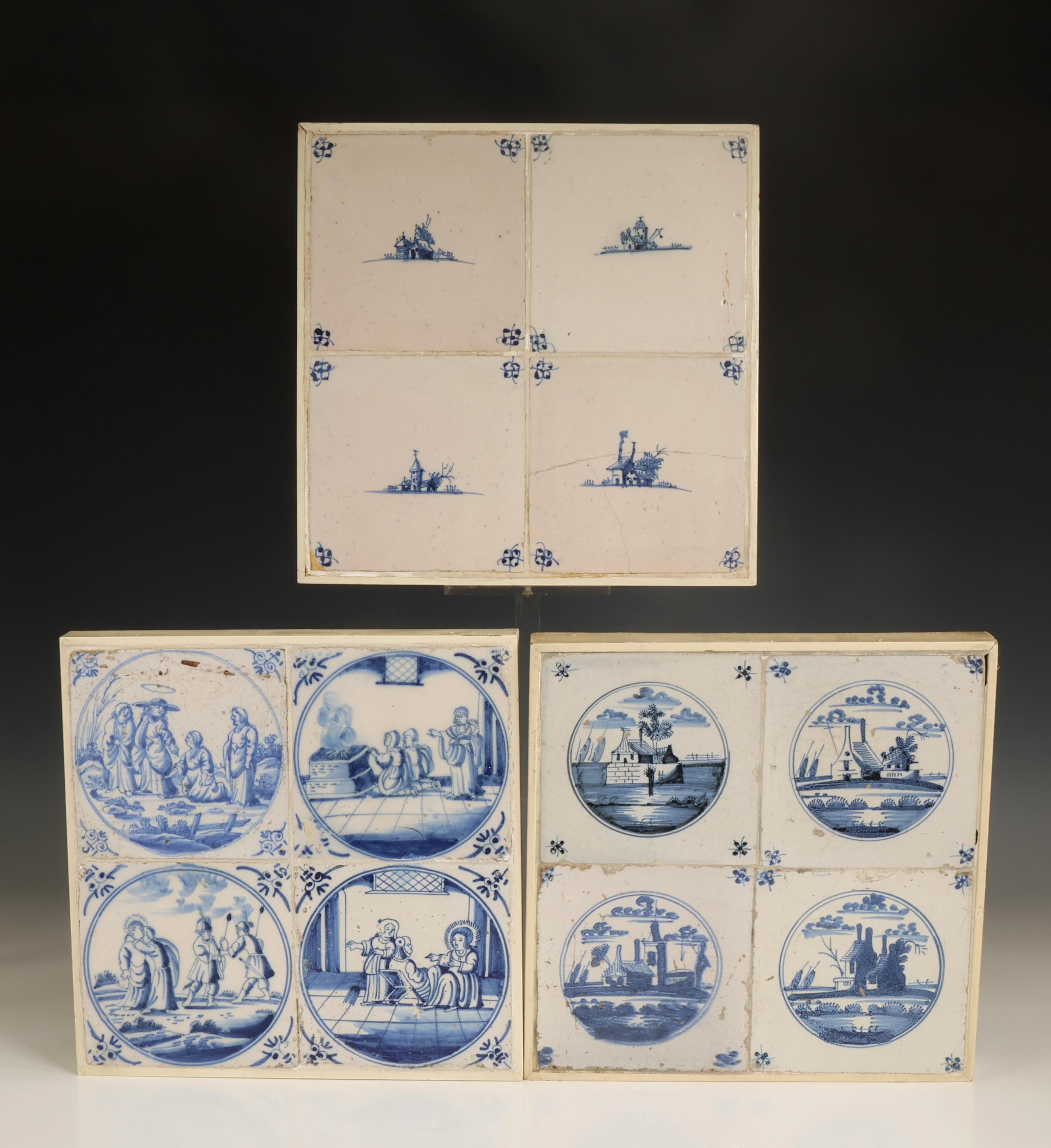 Twee sets met voorstellingen van landschappen, hoekmotief spin. Een met religieuze scenes in cirkel, hoekmotief ossekop. Gemonteerd in houten lijst. (fritting)