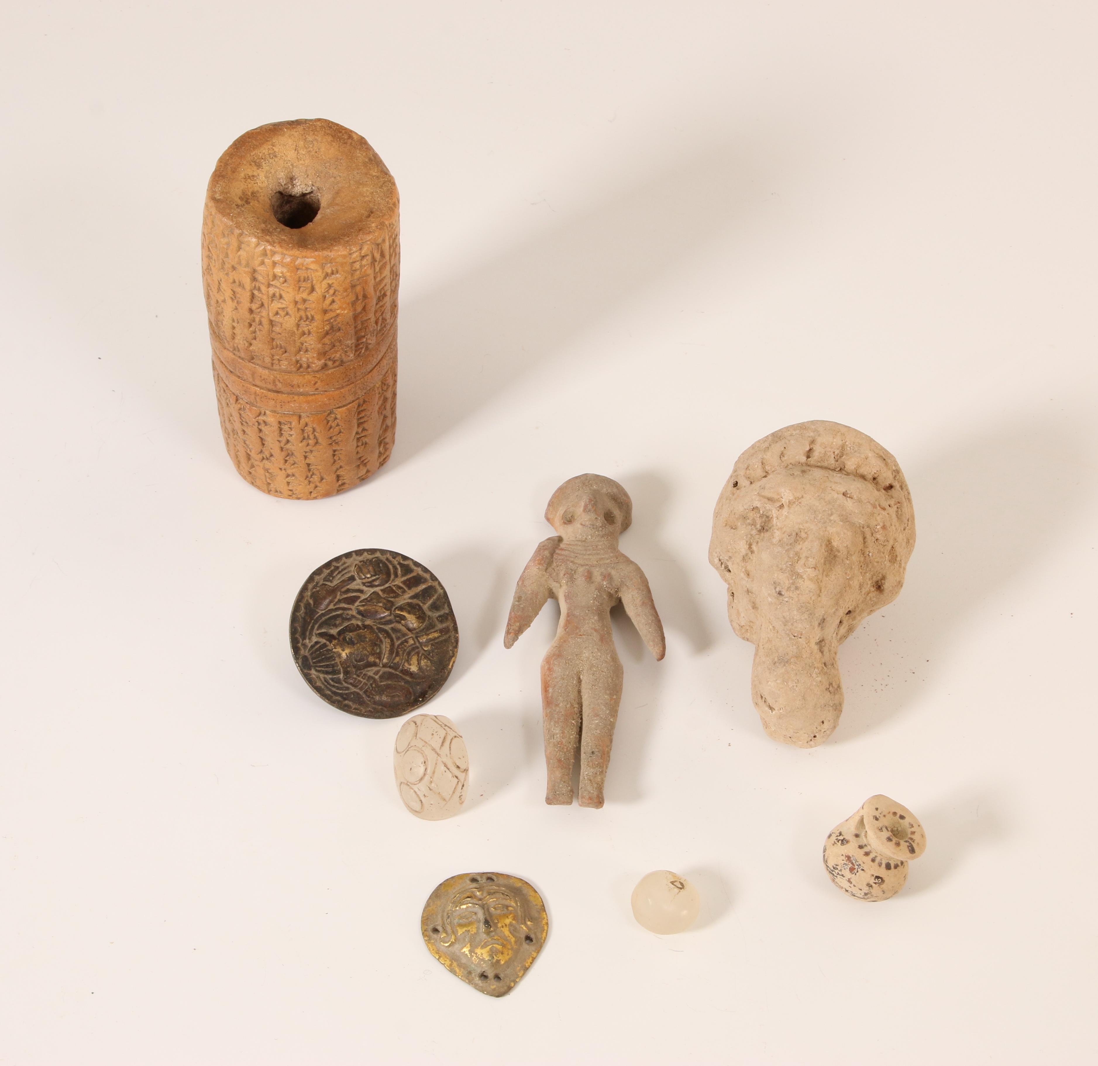 a collection of antique metal coins in a pouch, a round bronze ornament with a figure in relief, a gilded metal ornament with a head in relief. Herewith two glass beads, three terracotta objects and a cilindrical seal.