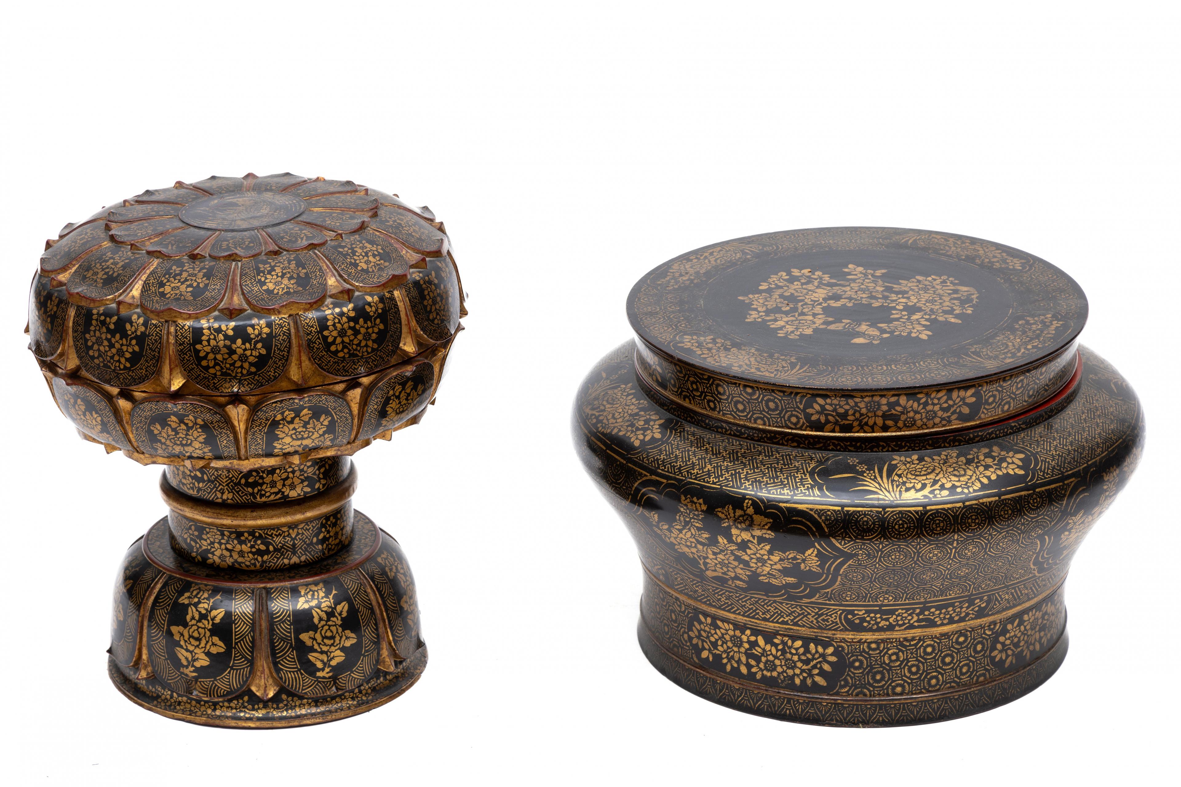 Beide uitgevoerd in zwart lakwerk met vergulde florale decoratie. Een twee-delig, de ander drie-delig.