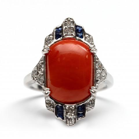 14 k. White gold ring in Art Deco style. Set with a cabochon cut oval red coral (14 x 10 mm), calibrated blue sapphire and single cut diamonds with a total weight of approx. 0.14 ct.