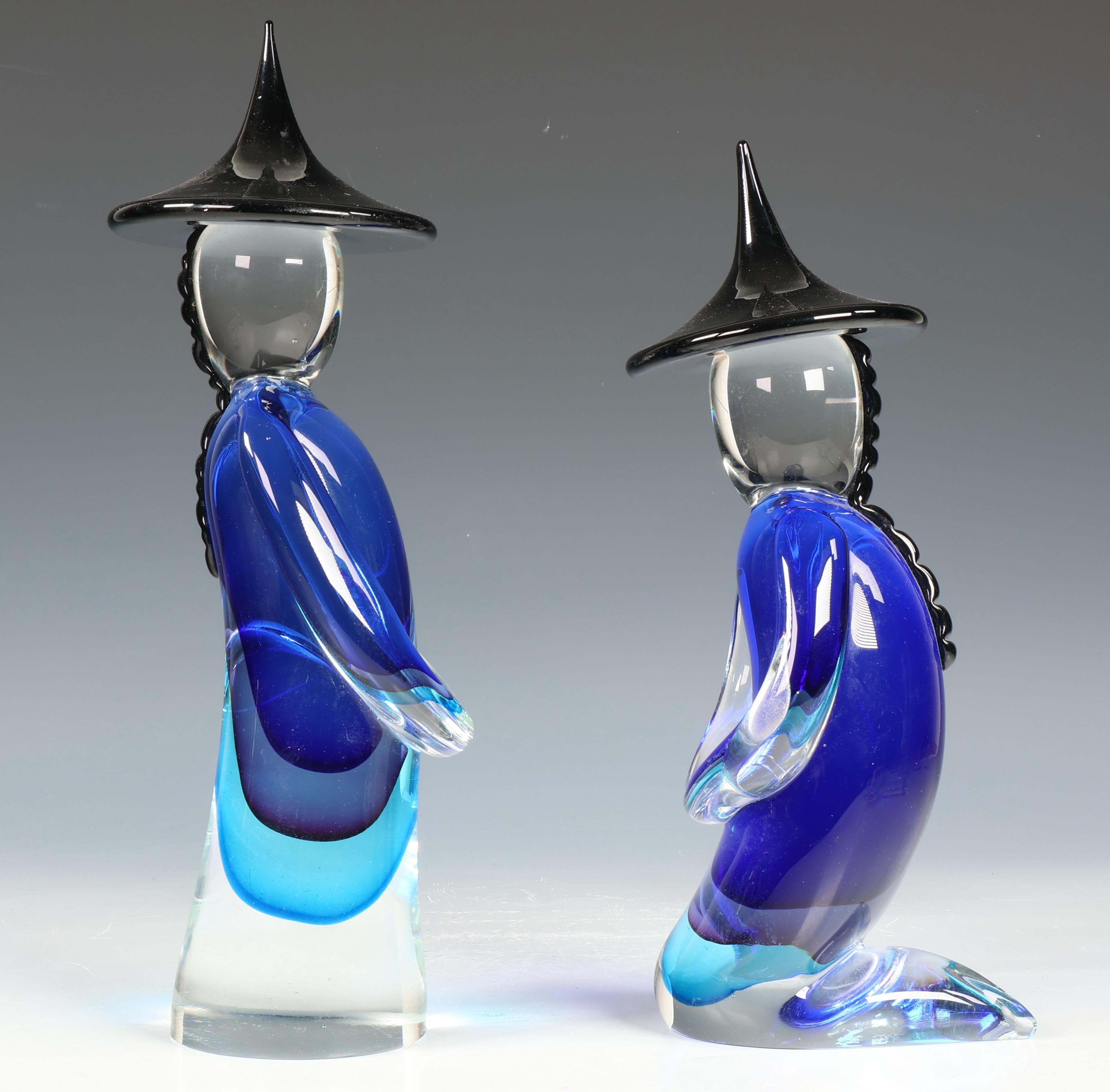 staand en geknield Chinees figuur in helder, blauw en zwart glas