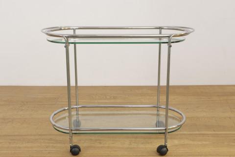 Verchroomd messing met twee kristallen glasplaten. Op zwenkwielen