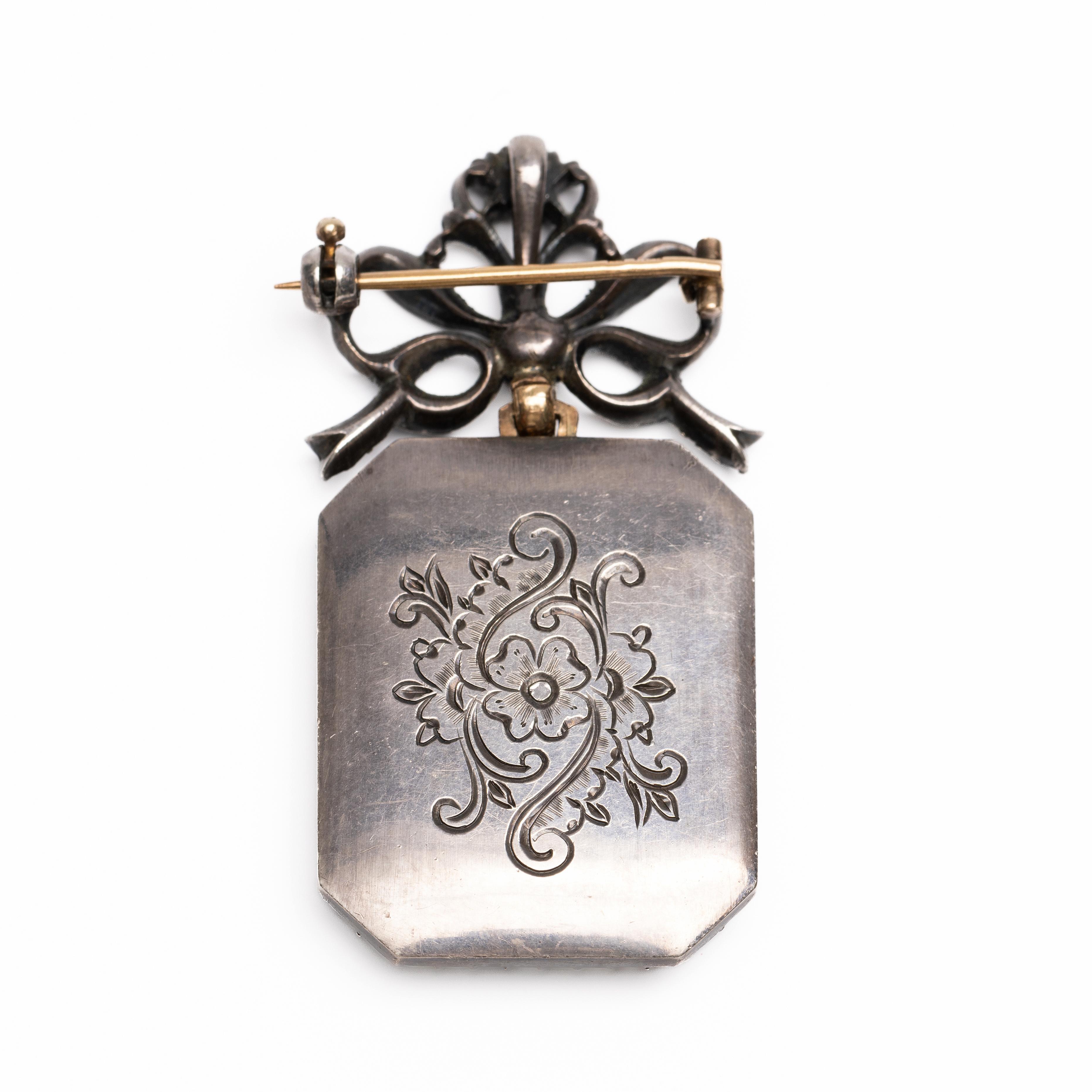 Silver and 18 k. gold brooch, with miniature portrait of a lady in an entourage of split pearls. The top in the shape of a bow, also set with split pearls. The back decorated with flowers