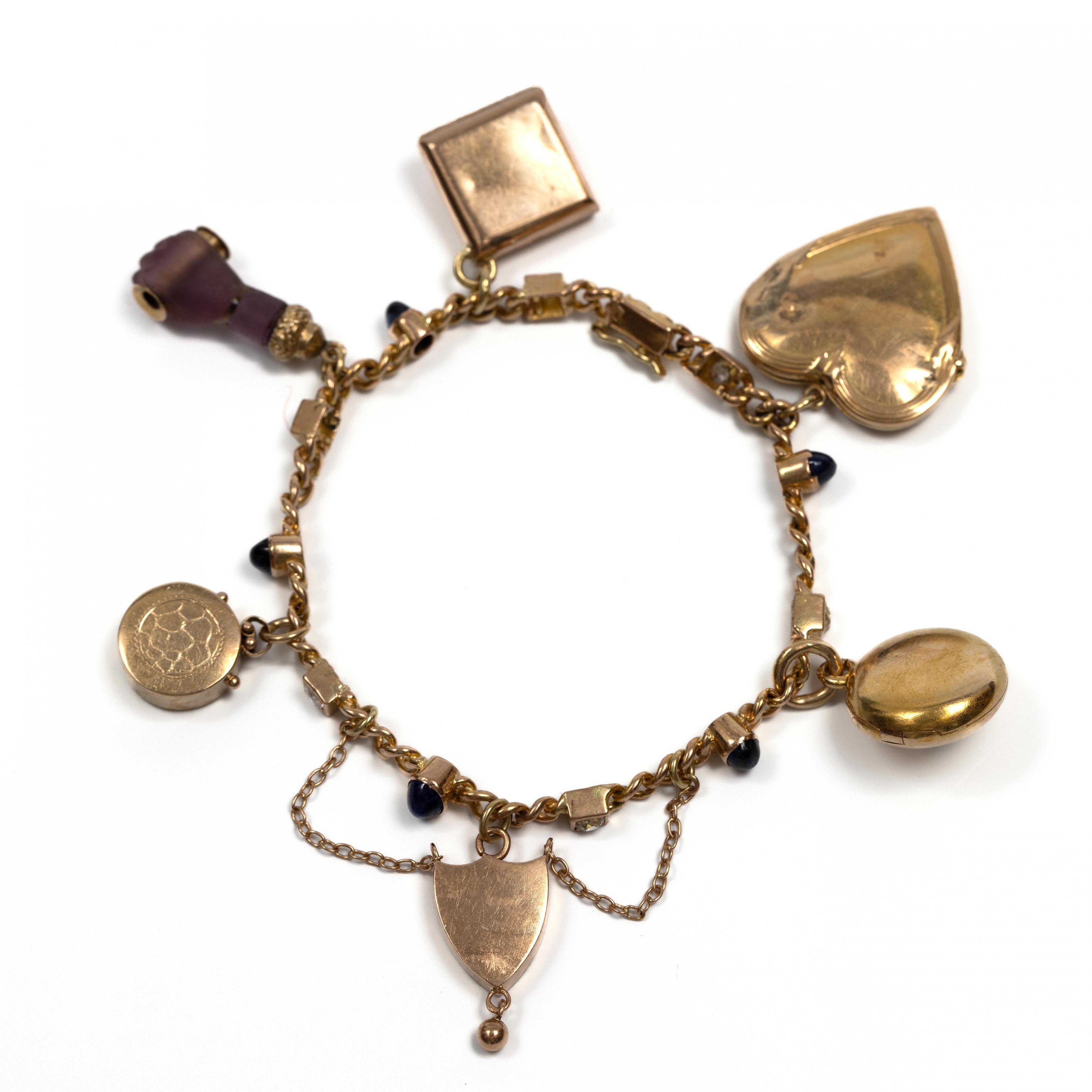 Poland, 14 k. gold charm bracelet, first half 20th century. Constructed from a curb link, alternately set with an old brilliant cut diamond (each approx. 0.10 ct.) and an oval cabochon cut blue sapphire (each approx. 5 x 4 mm), between which a charm: heart-shaped locket set with sapphire (chips) and rose-cut diamond, round locket with star-shaped applique set with old brilliant cut diamond and red enamel, shield-shaped charm set with seed pearls (some missing), round charm set with a seed pearl, amethyst charm in the shape of a hand (broken), in which a stanhope (image missing) and a diamond-shaped locket set with a split pearl.