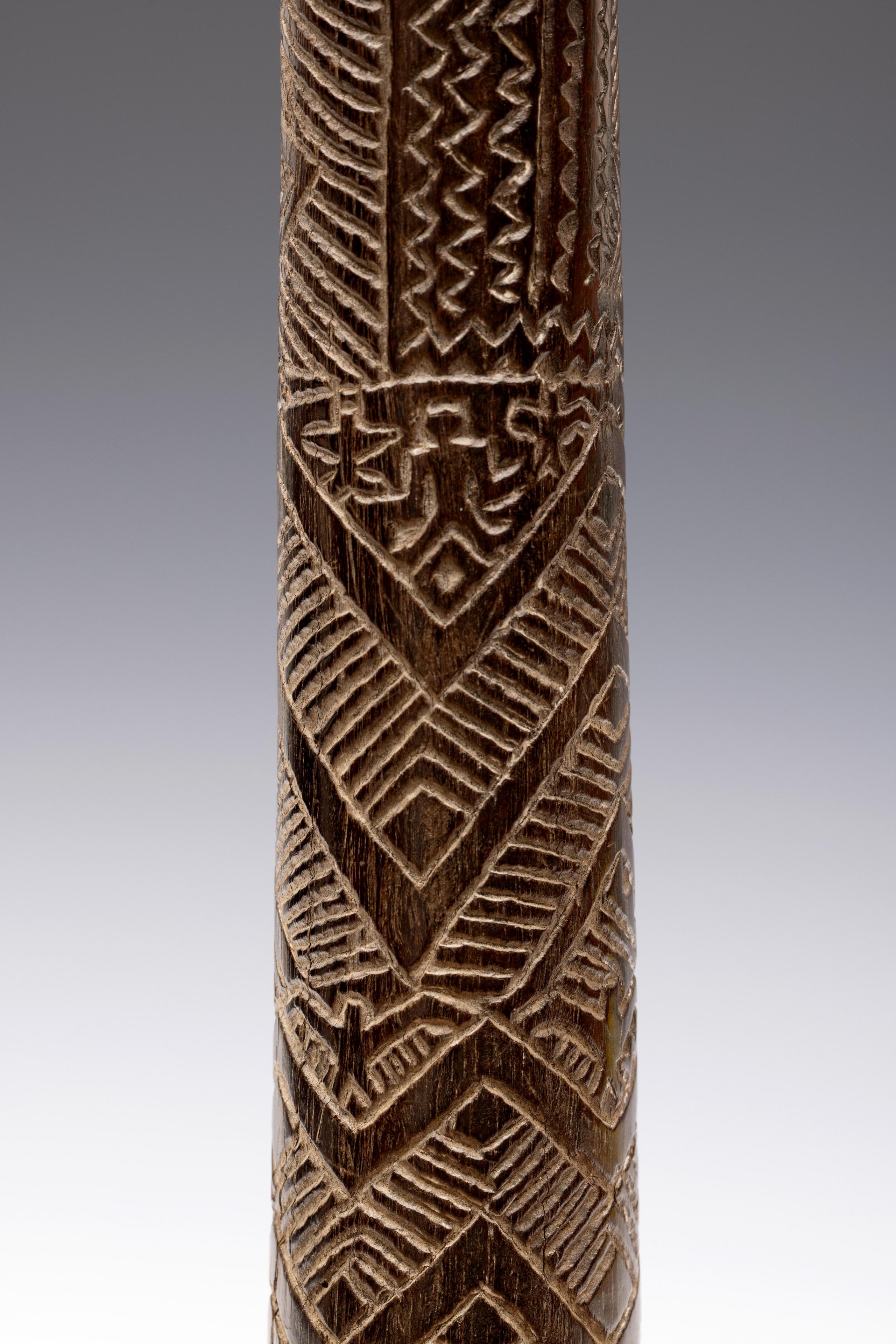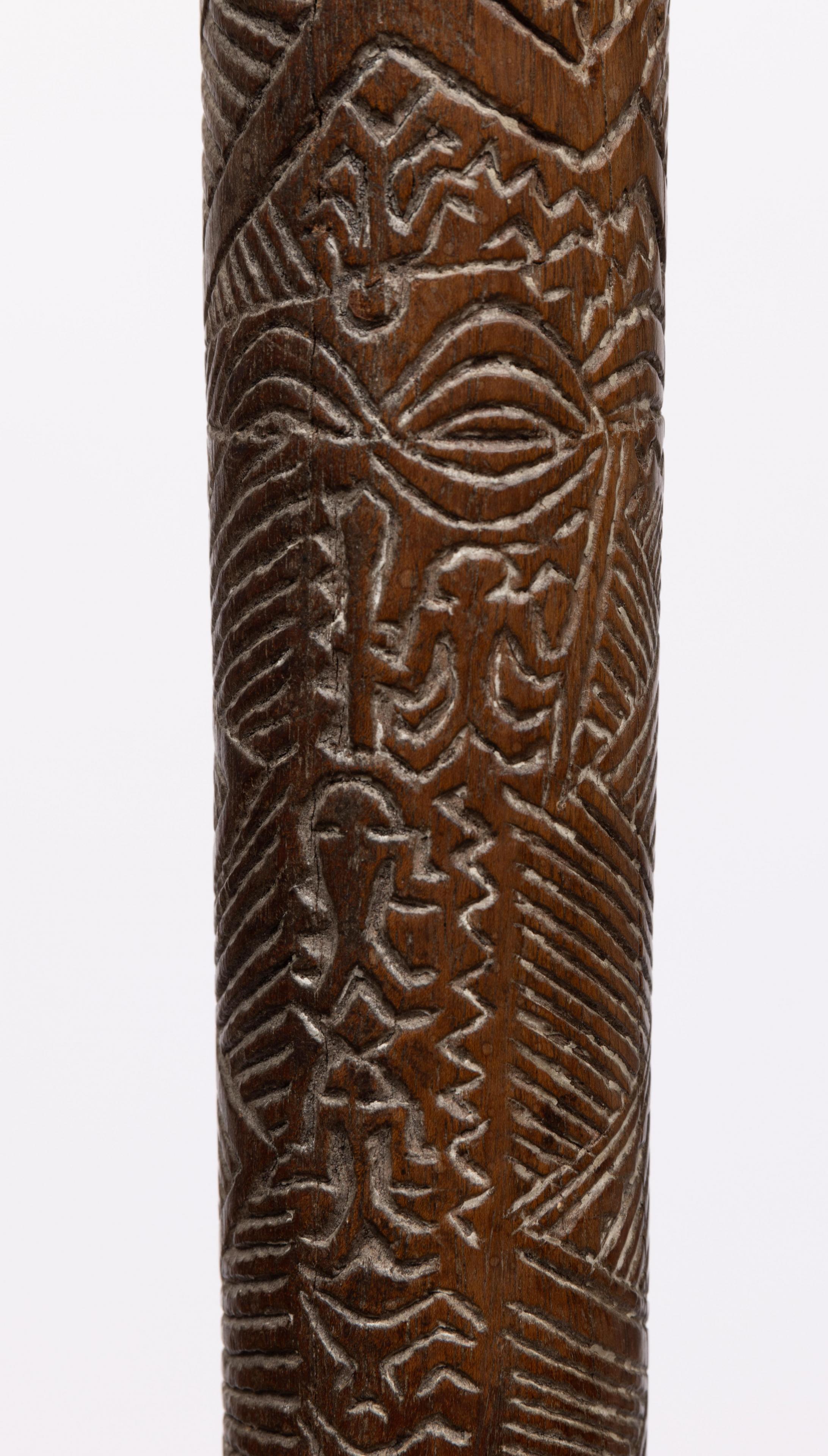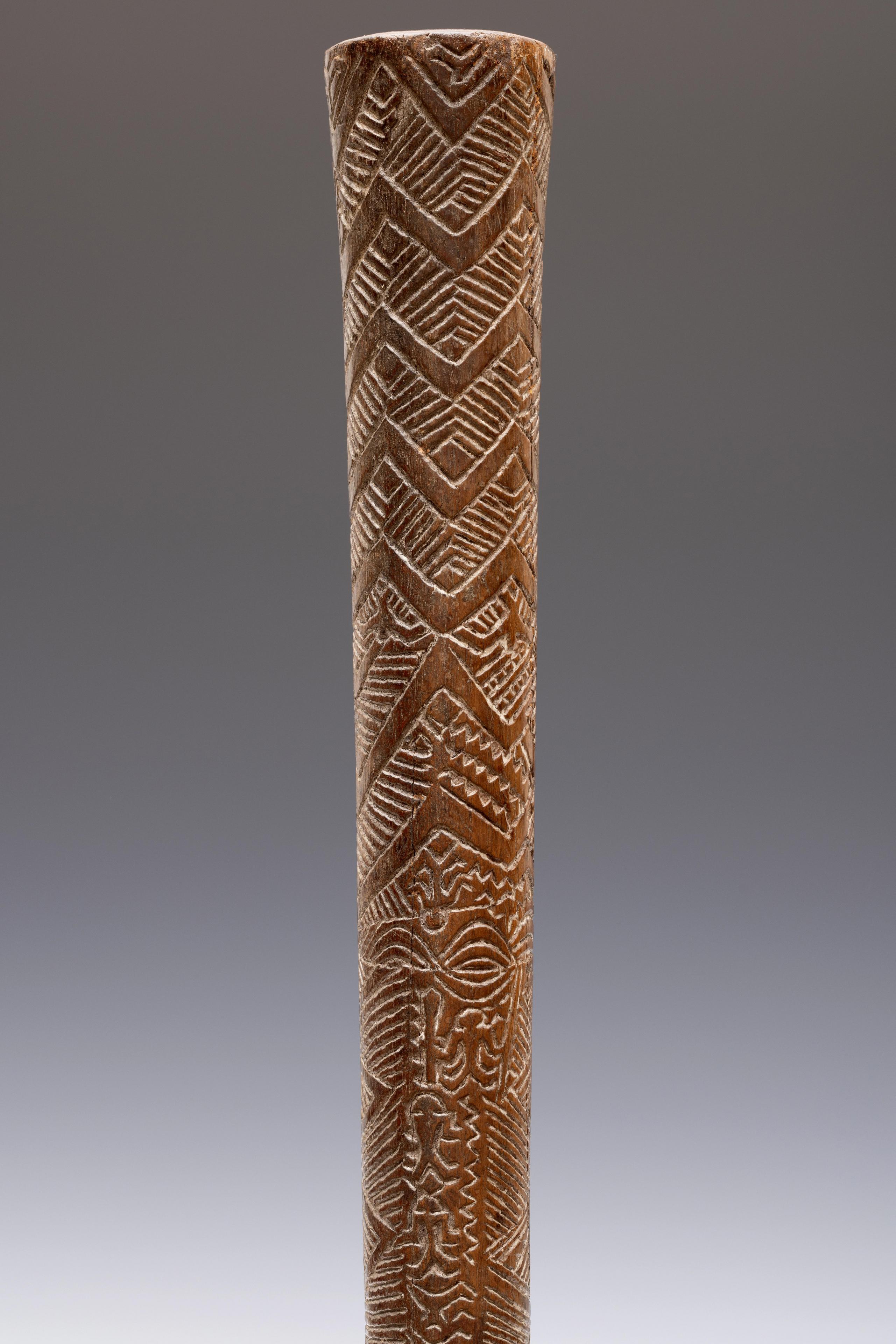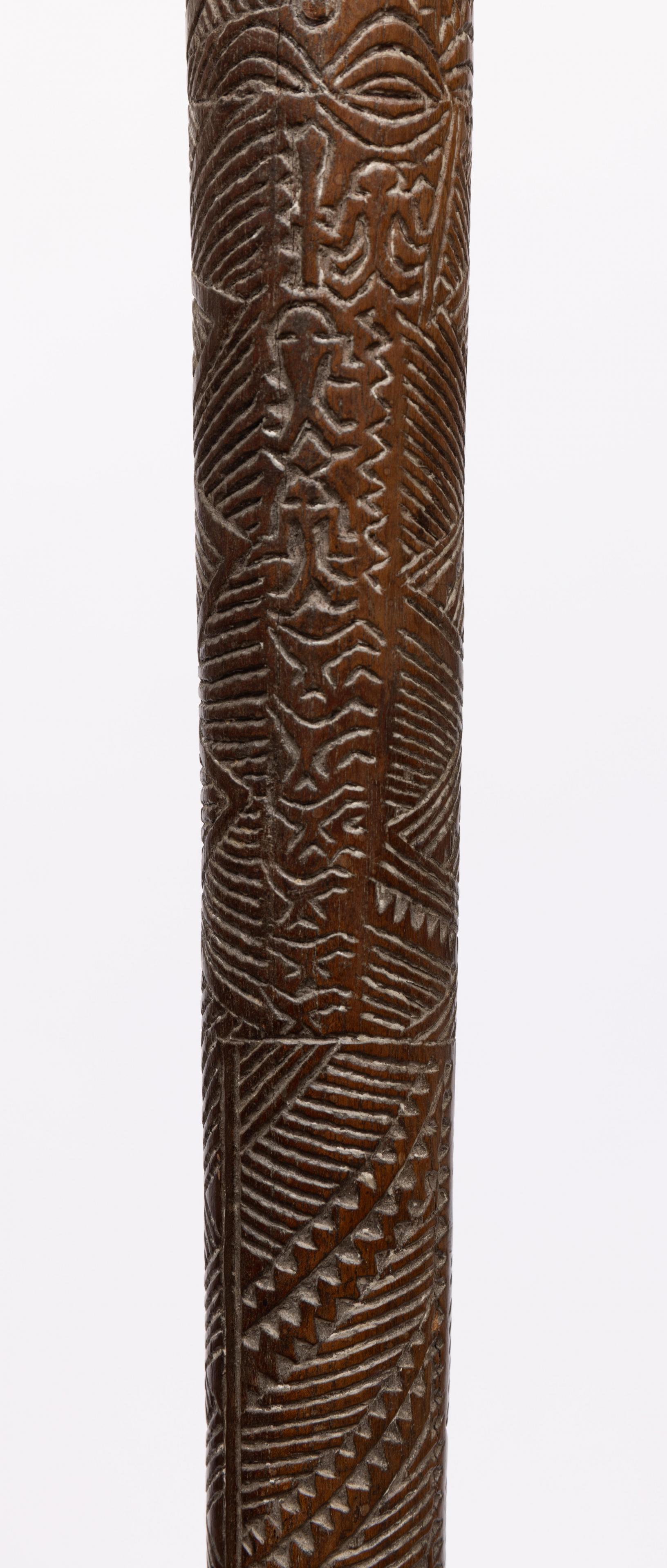 the surface elaborately carved with various anthropomorphic figures, some wearing a club, birds and geometric patterns; the tip showing a standing anthropomorphic figure below a serrated crescent.