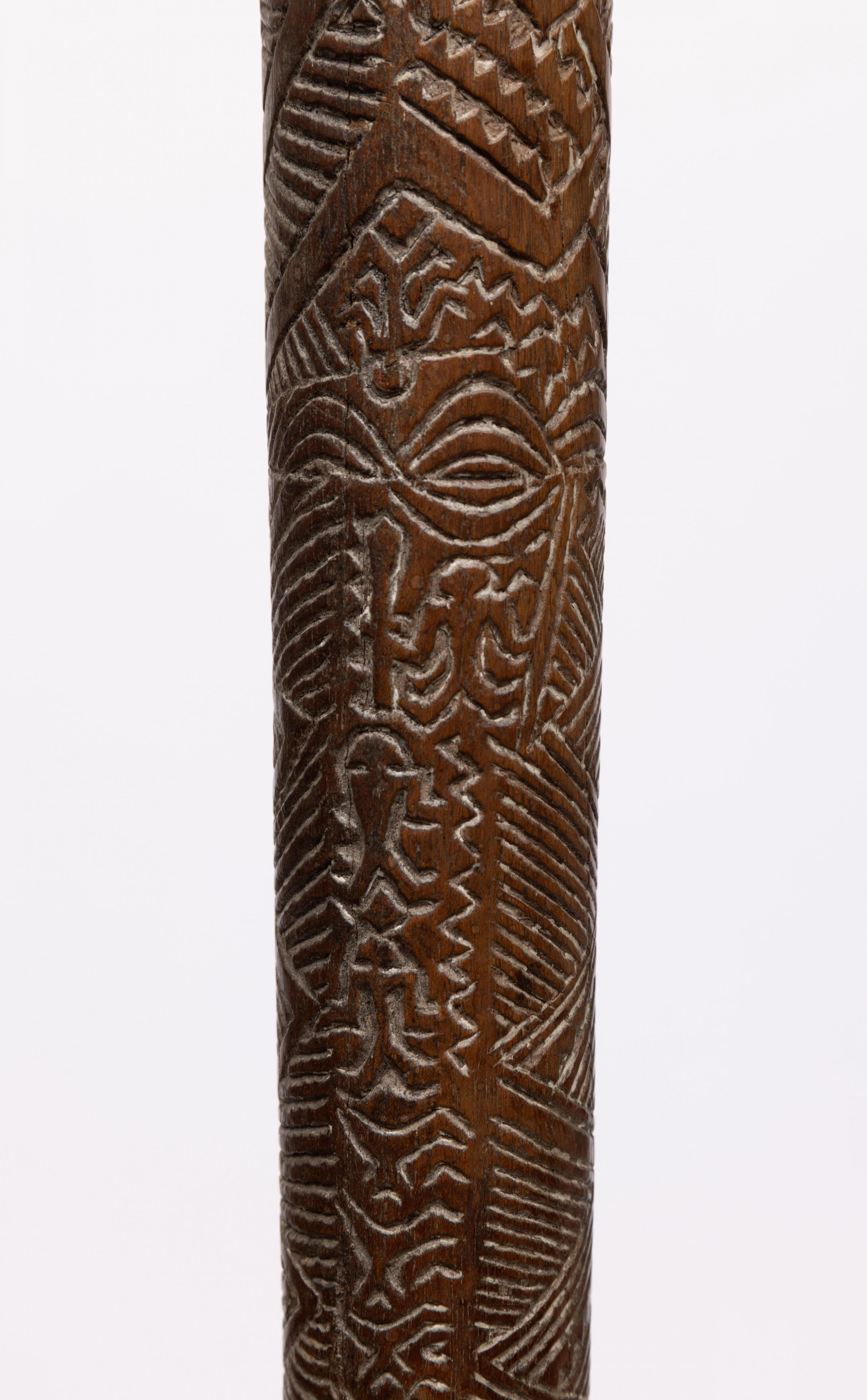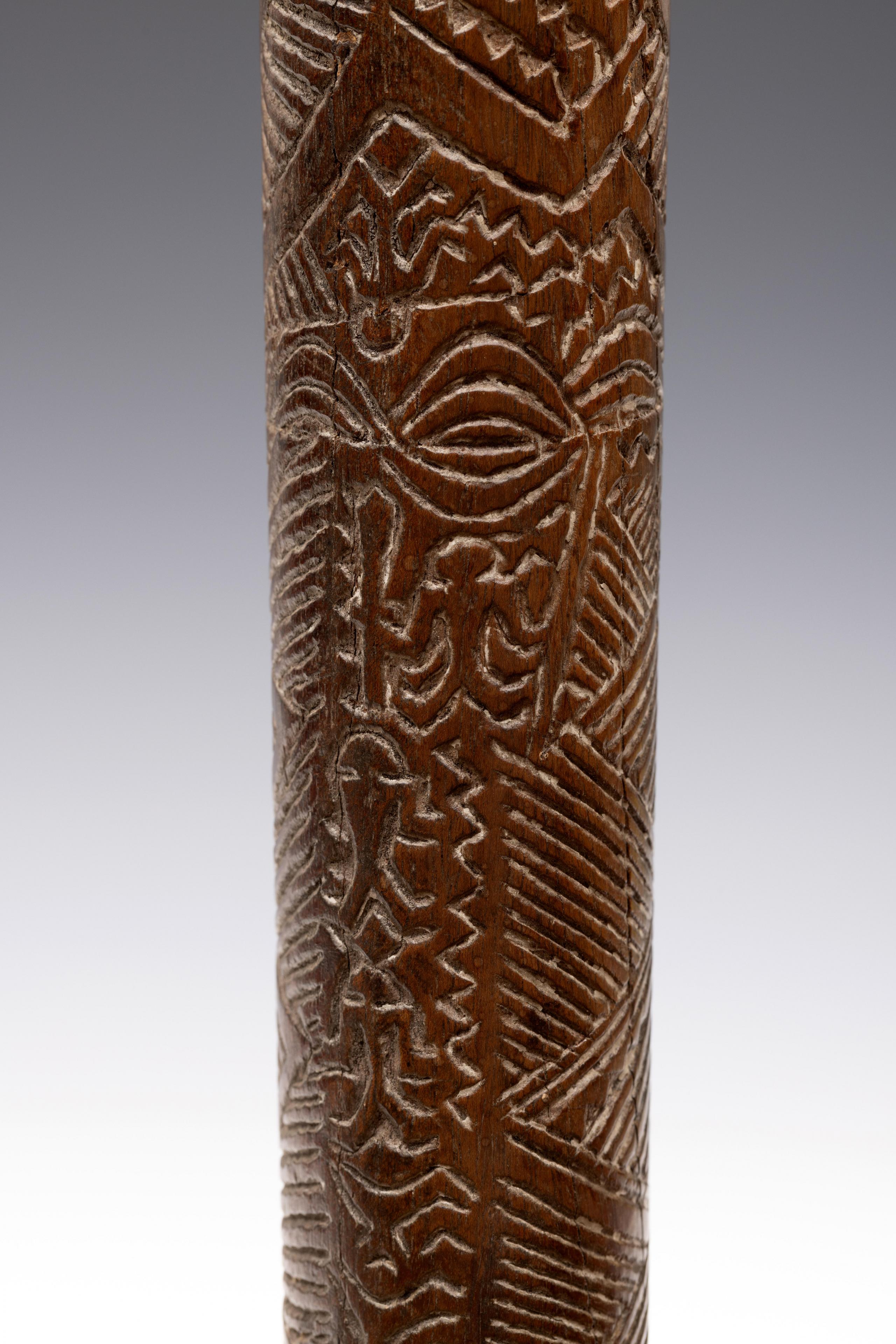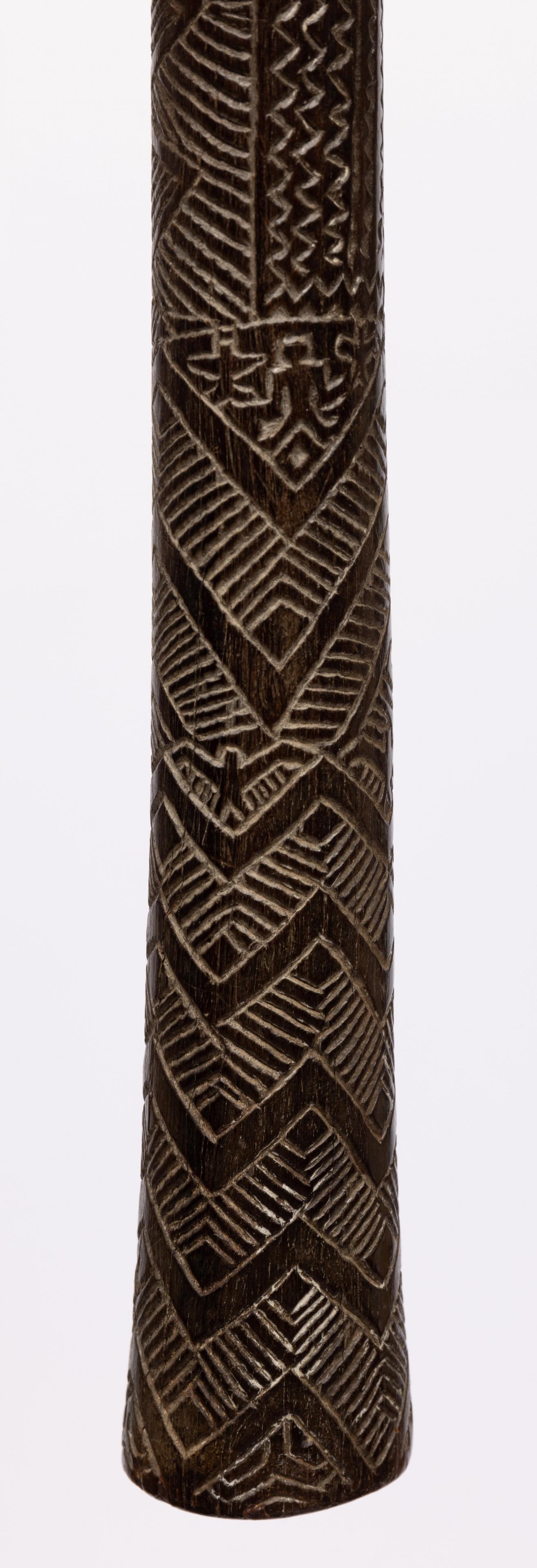 the surface elaborately carved with various anthropomorphic figures, some wearing a club, birds and geometric patterns; the tip showing a standing anthropomorphic figure below a serrated crescent.