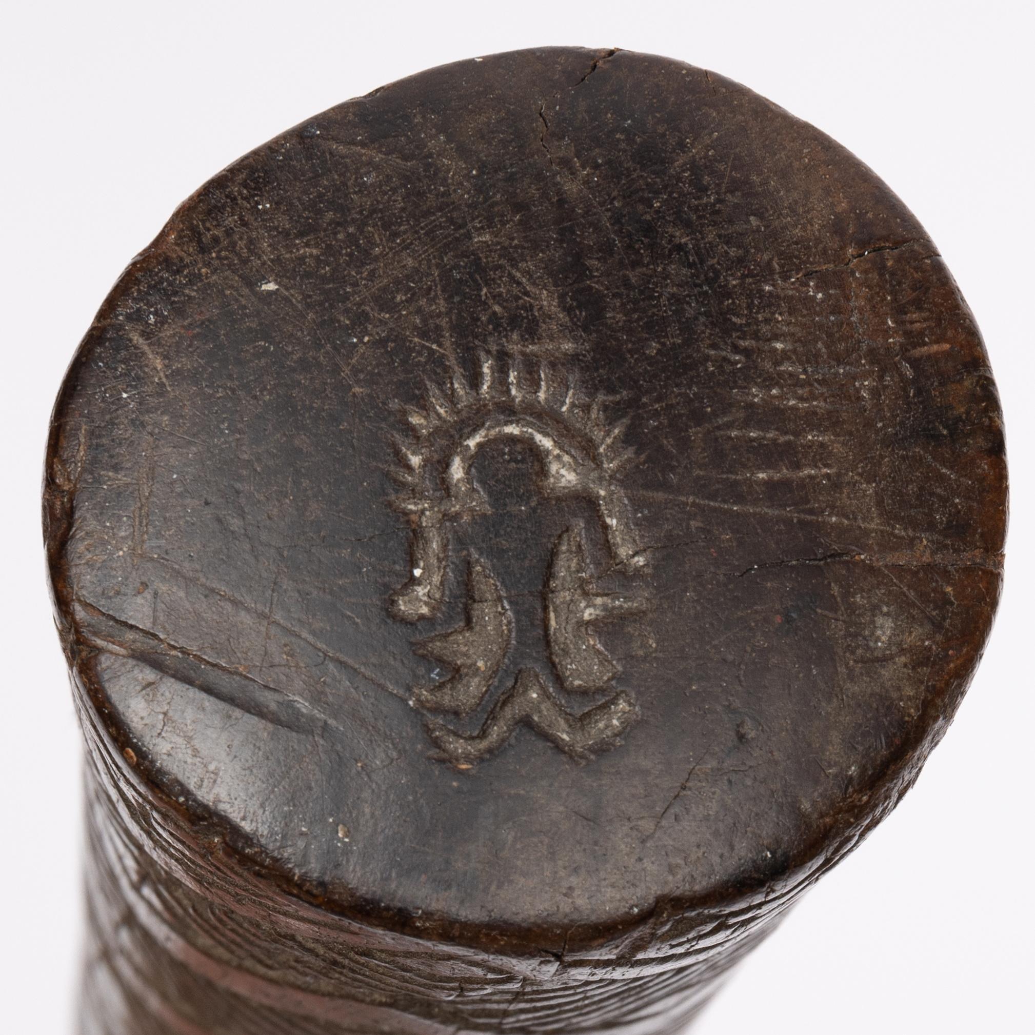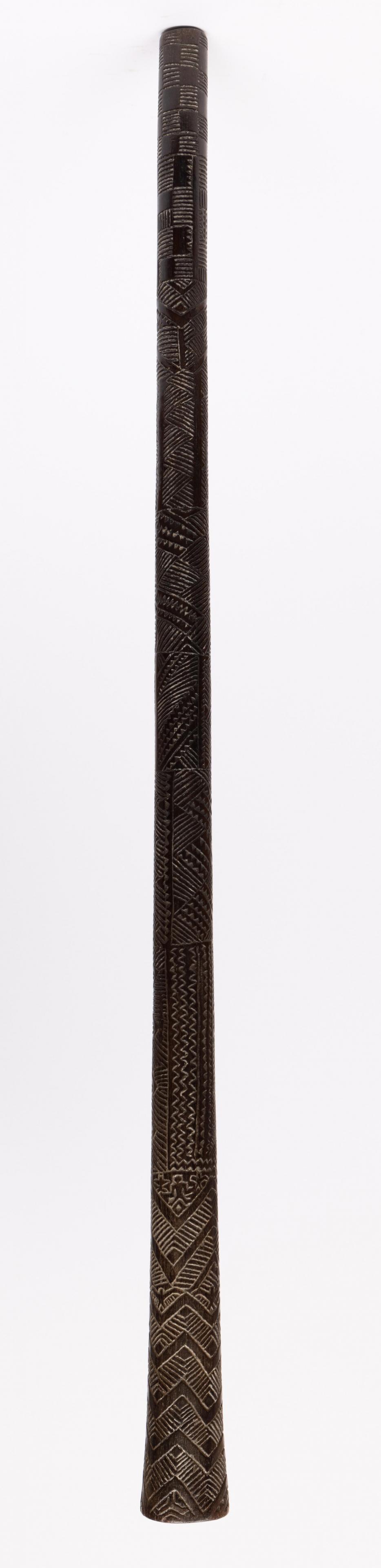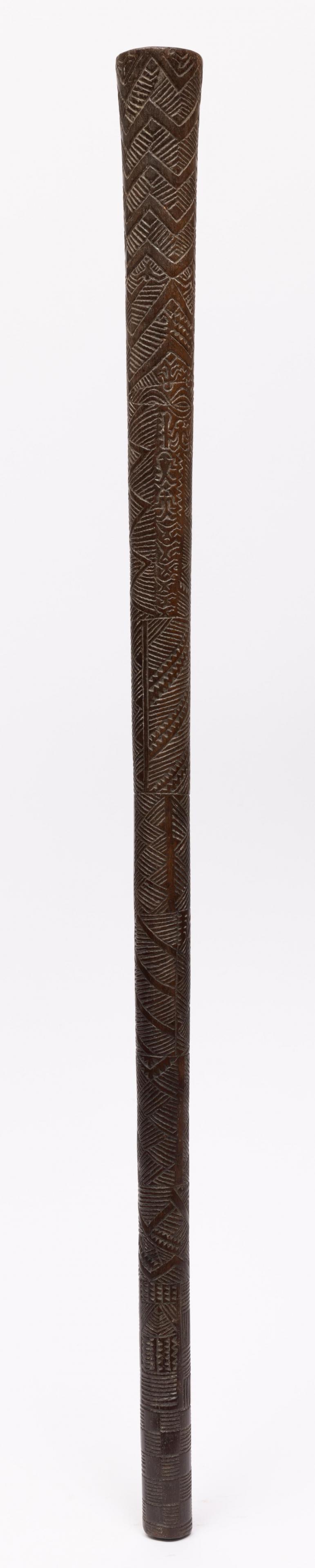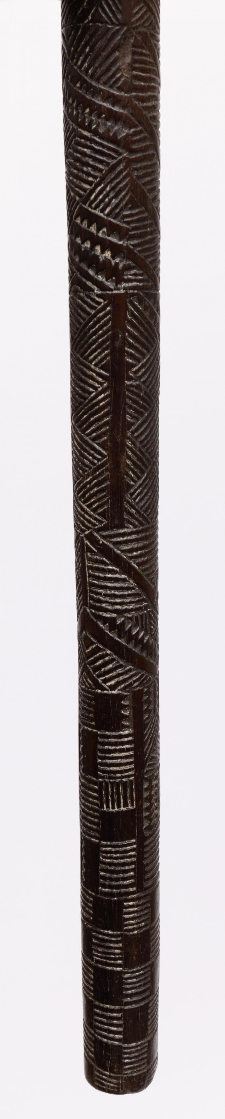 the surface elaborately carved with various anthropomorphic figures, some wearing a club, birds and geometric patterns; the tip showing a standing anthropomorphic figure below a serrated crescent.