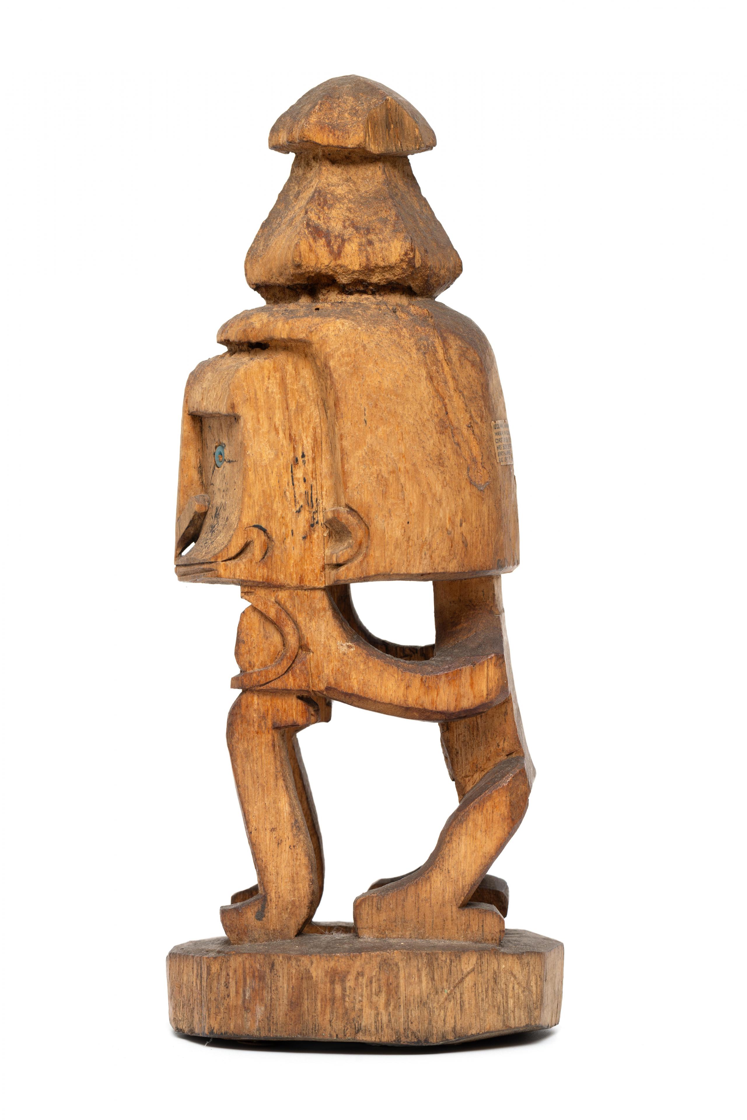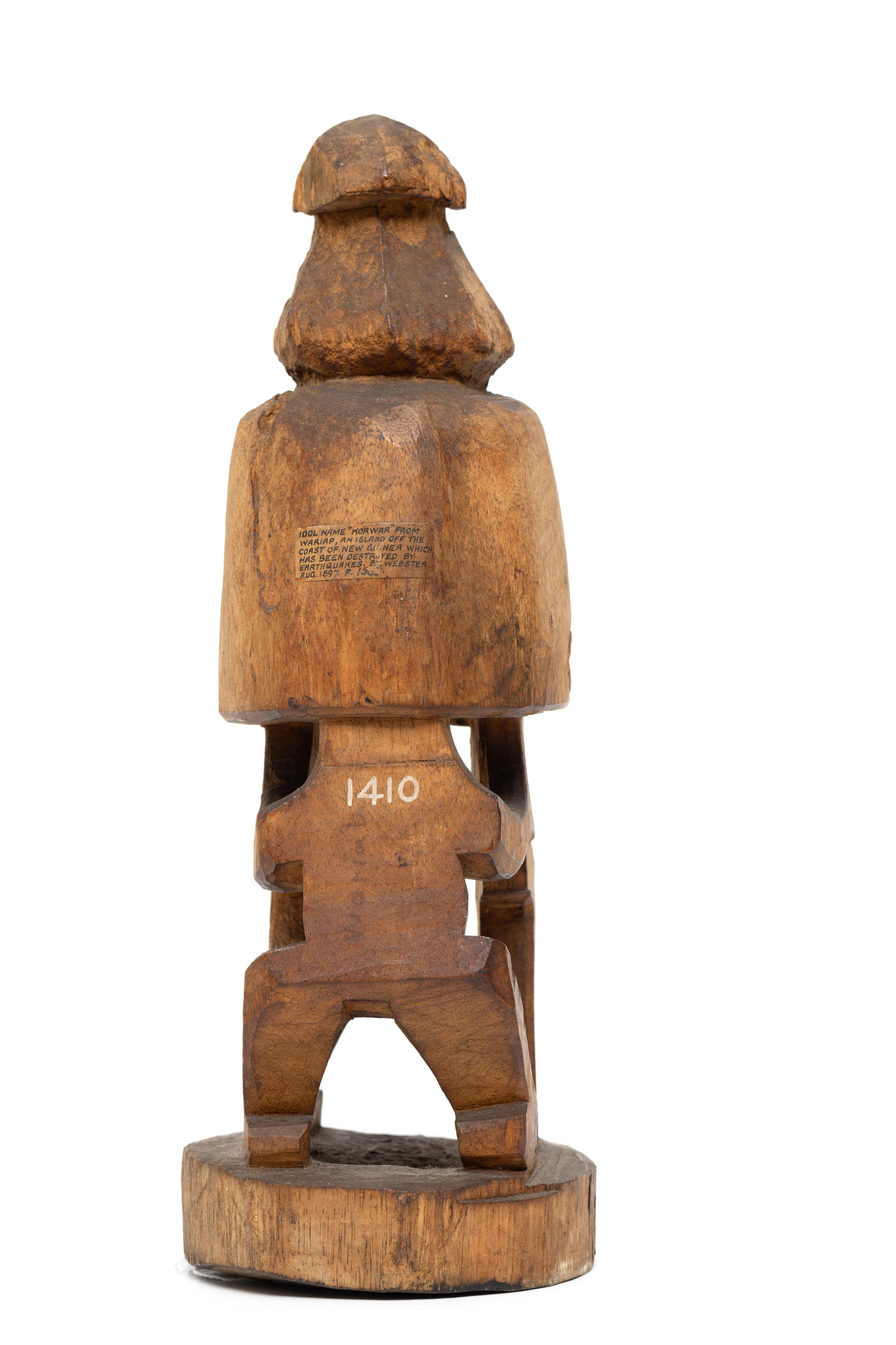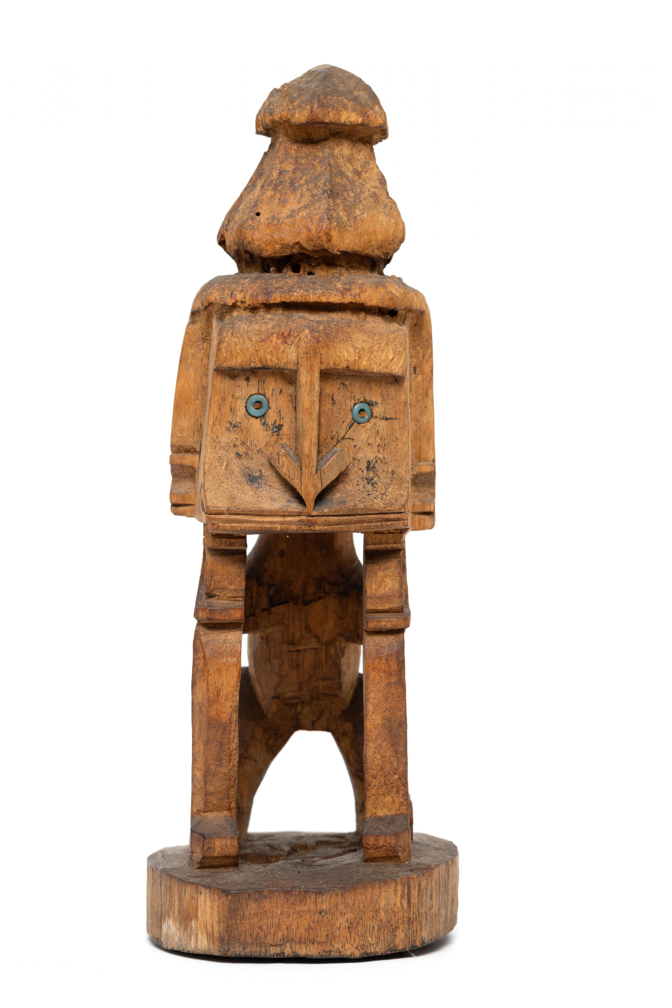 standing behind a pair of S-shaped sticks, the rectangular shaped face below a conical headdress, with blue inset glass bead eyes, arrow-shaped nose, partly carved free, broad narrow mouth, the hands and ears carved likewise. On the back inscribed in black 'Wariab'.