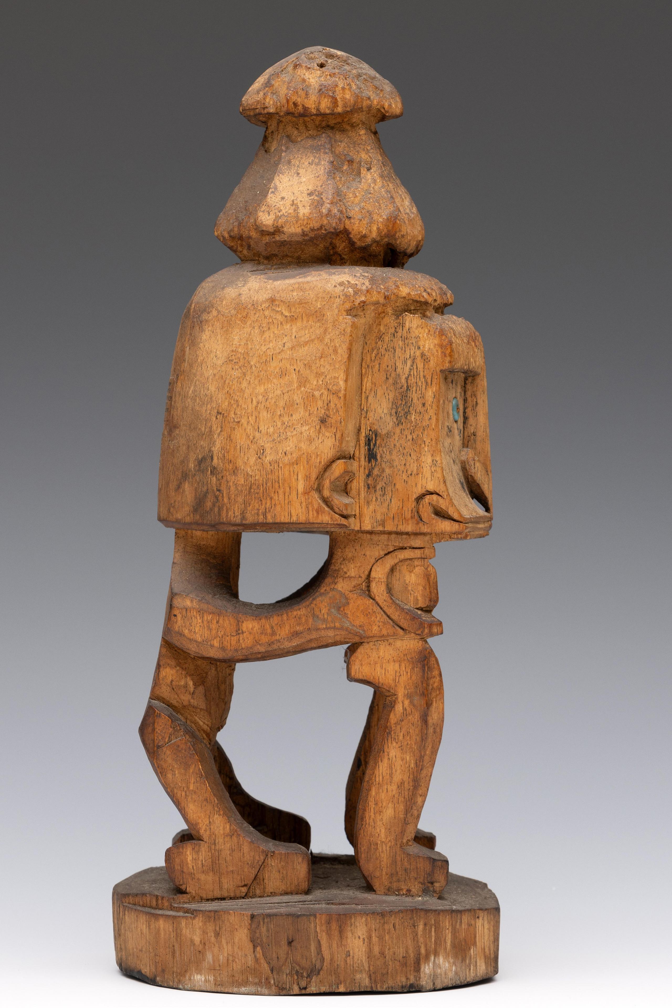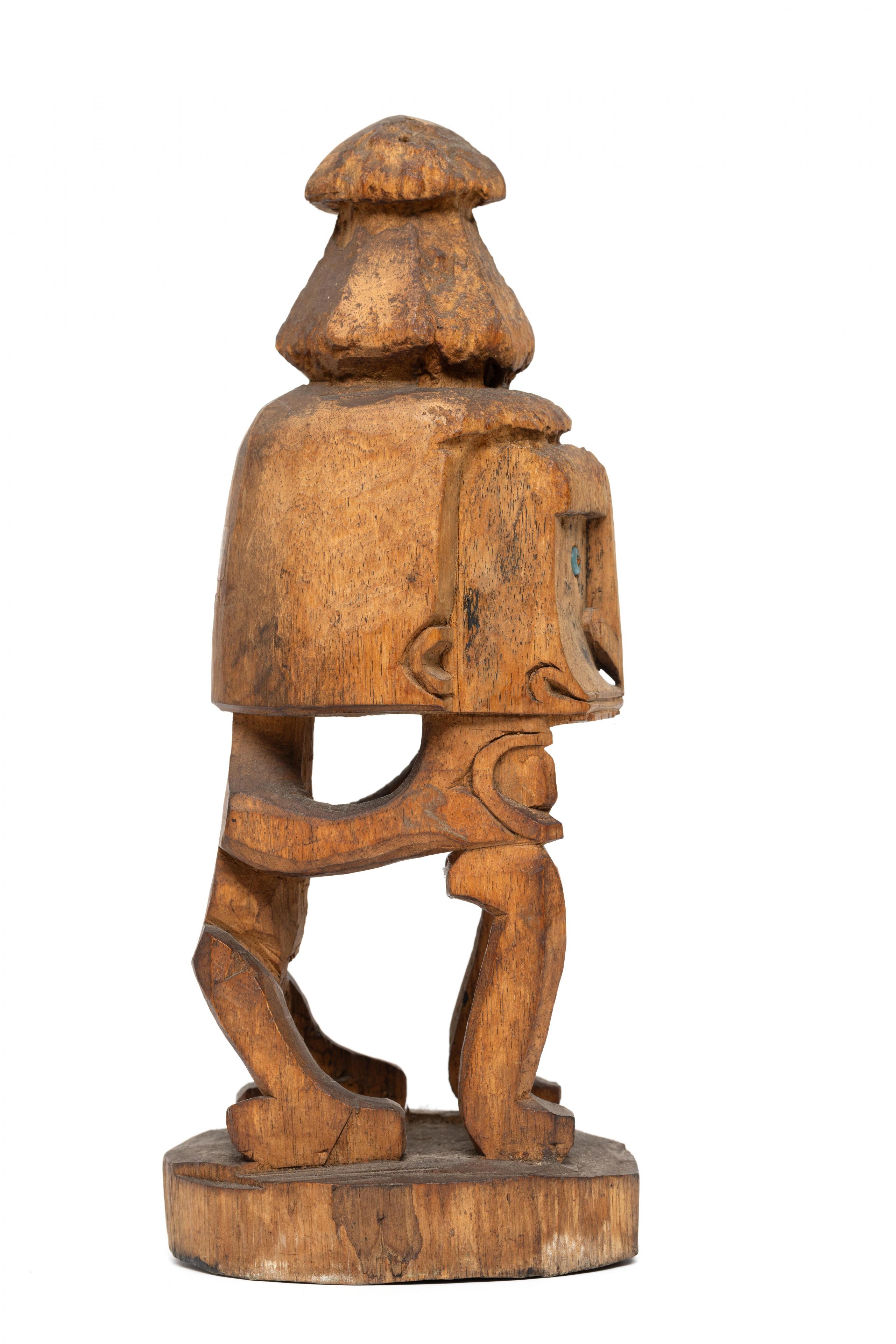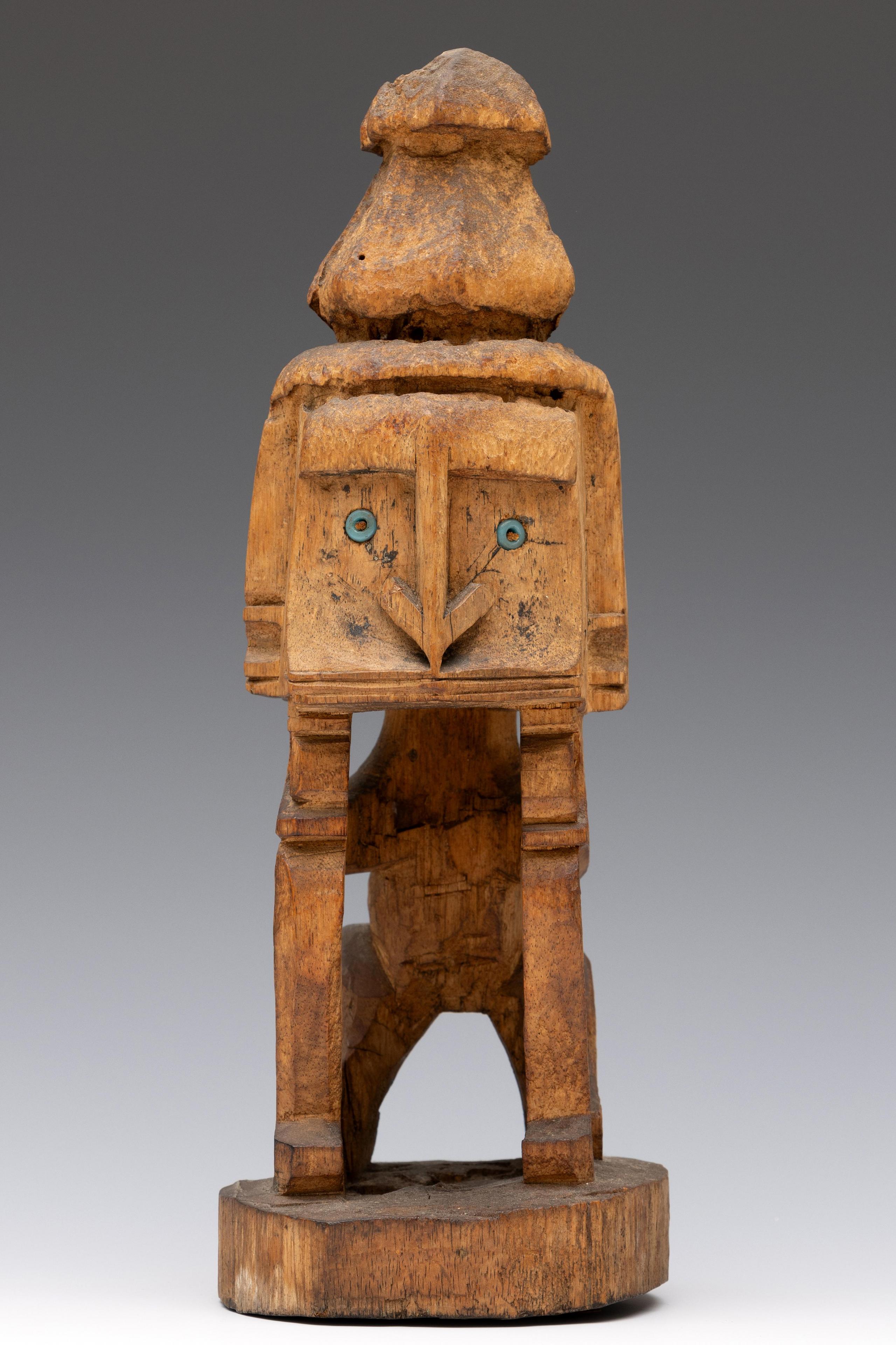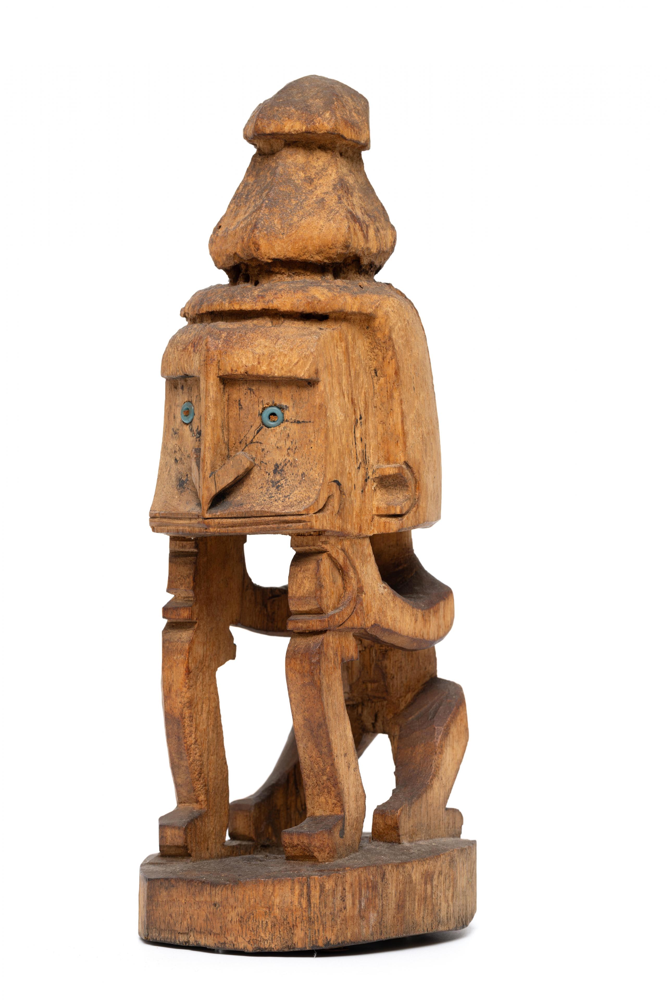 standing behind a pair of S-shaped sticks, the rectangular shaped face below a conical headdress, with blue inset glass bead eyes, arrow-shaped nose, partly carved free, broad narrow mouth, the hands and ears carved likewise. On the back inscribed in black 'Wariab'.