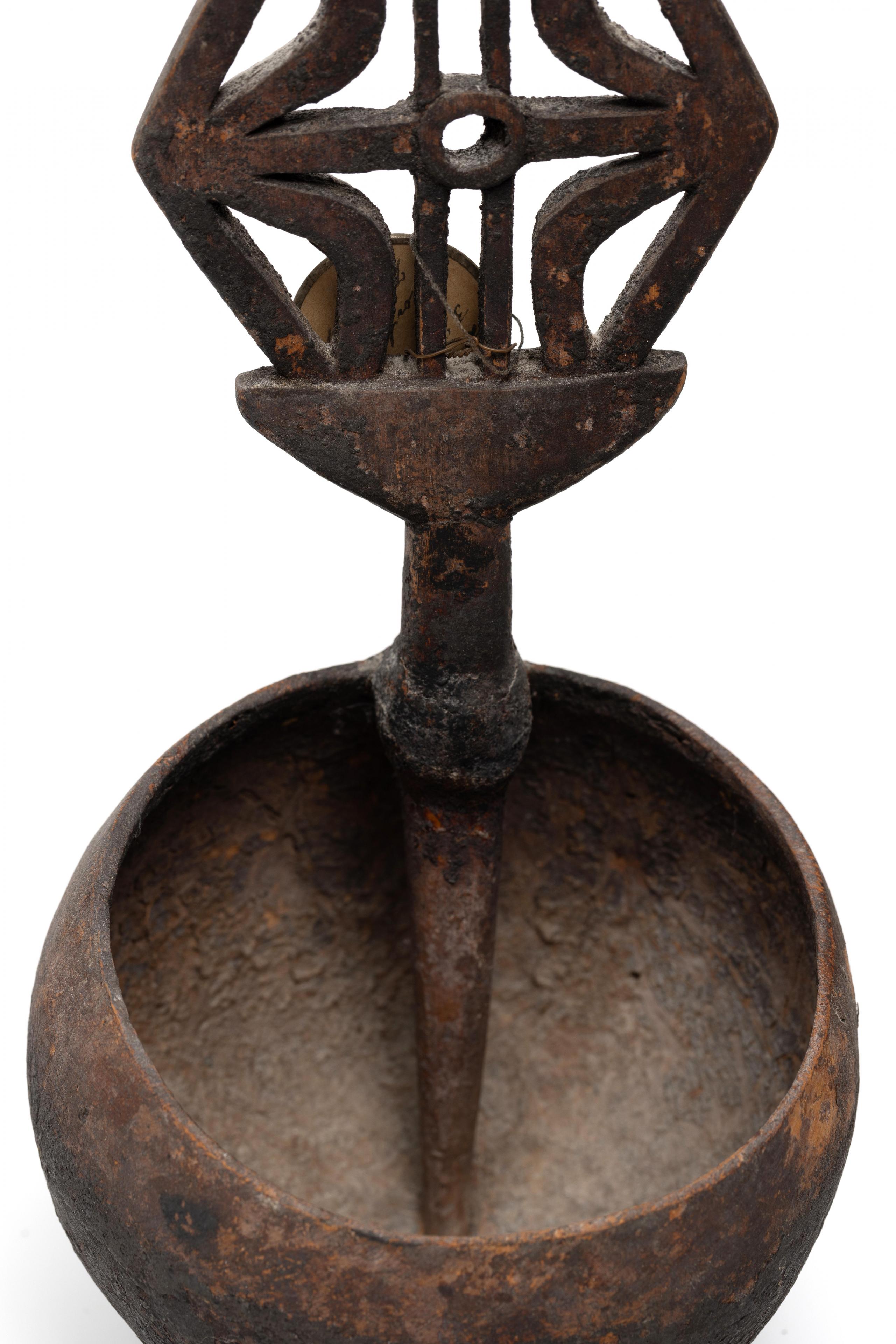 coconut shell scoop and wooden open worked handle, blackish-red encrusted patina.