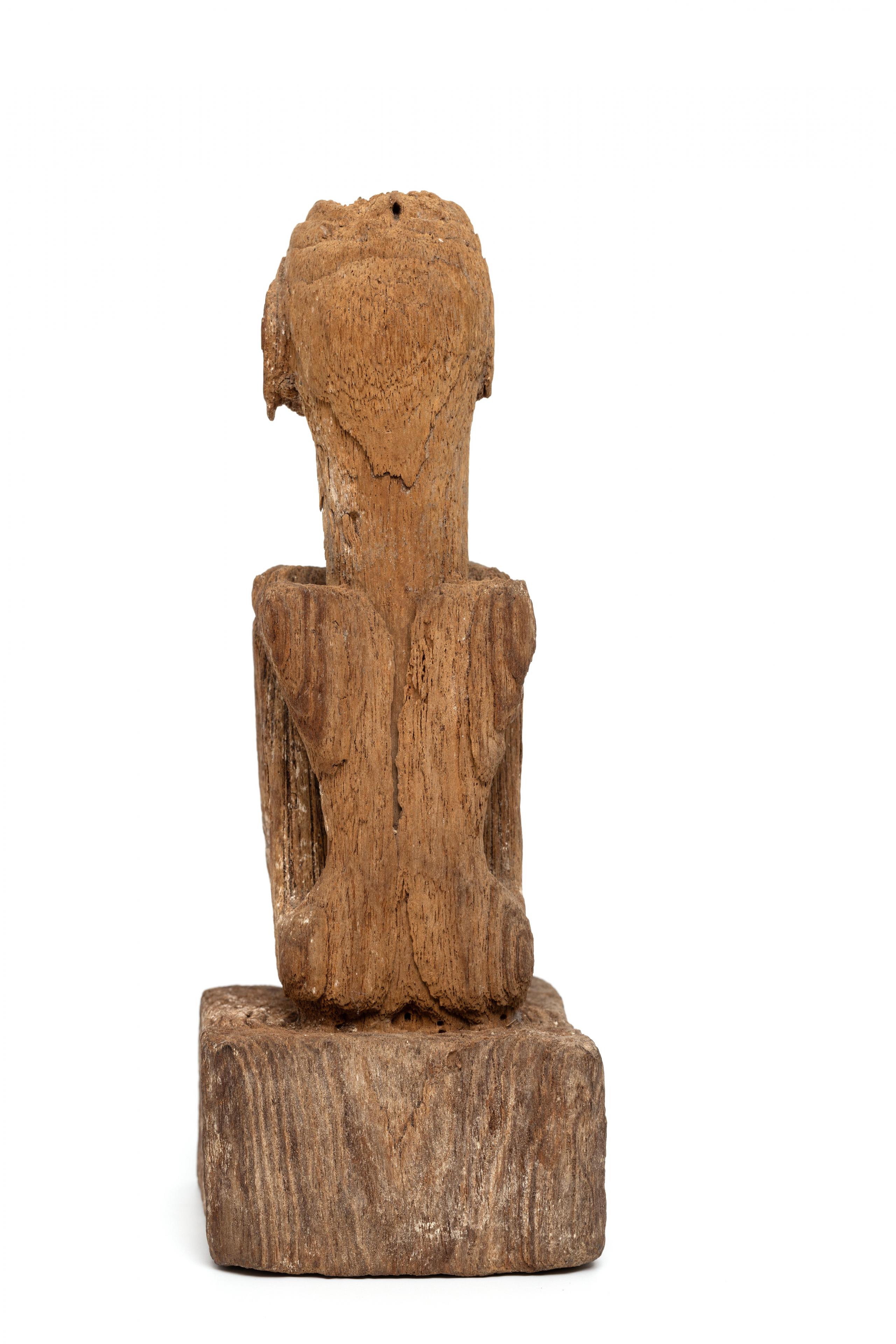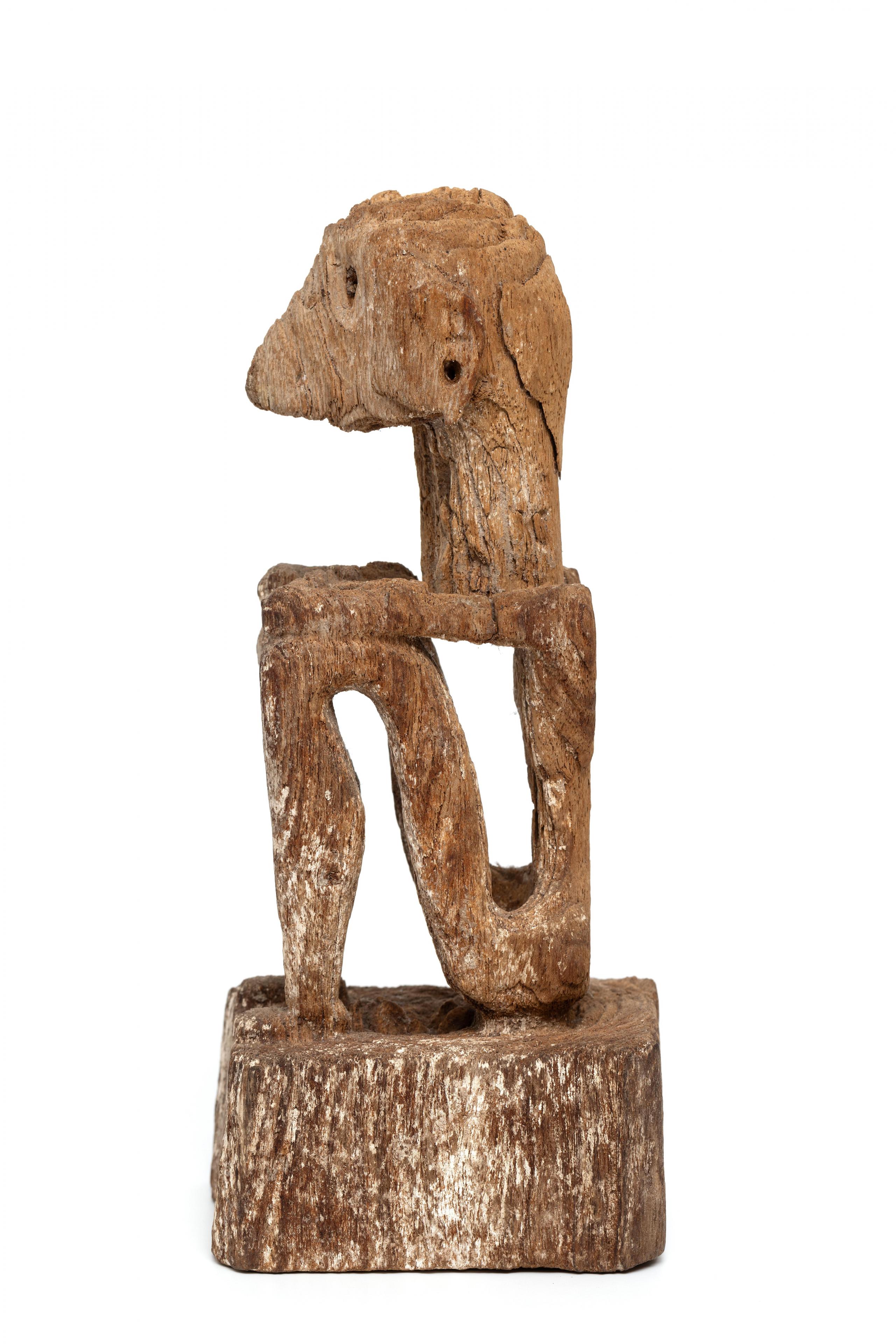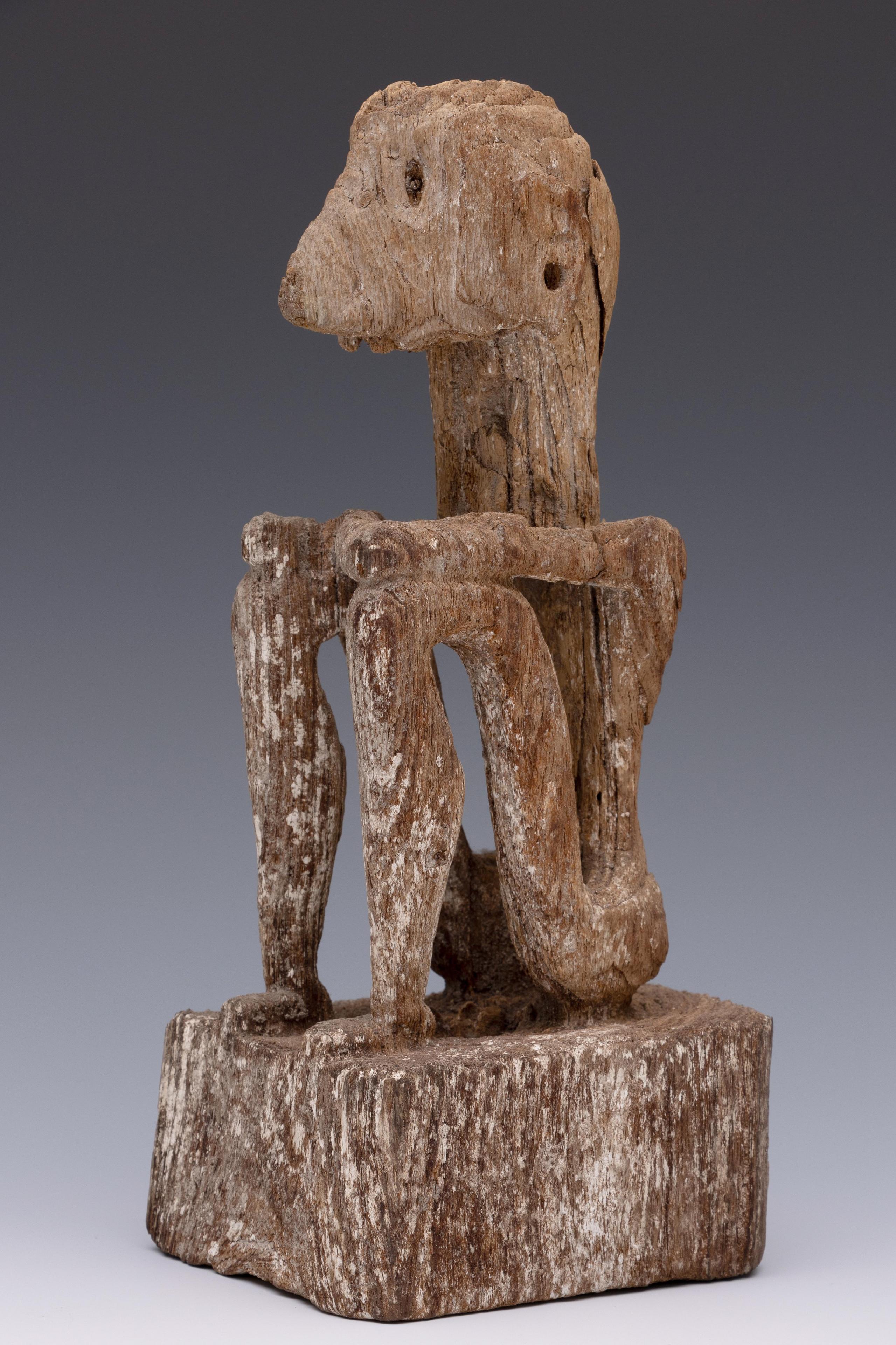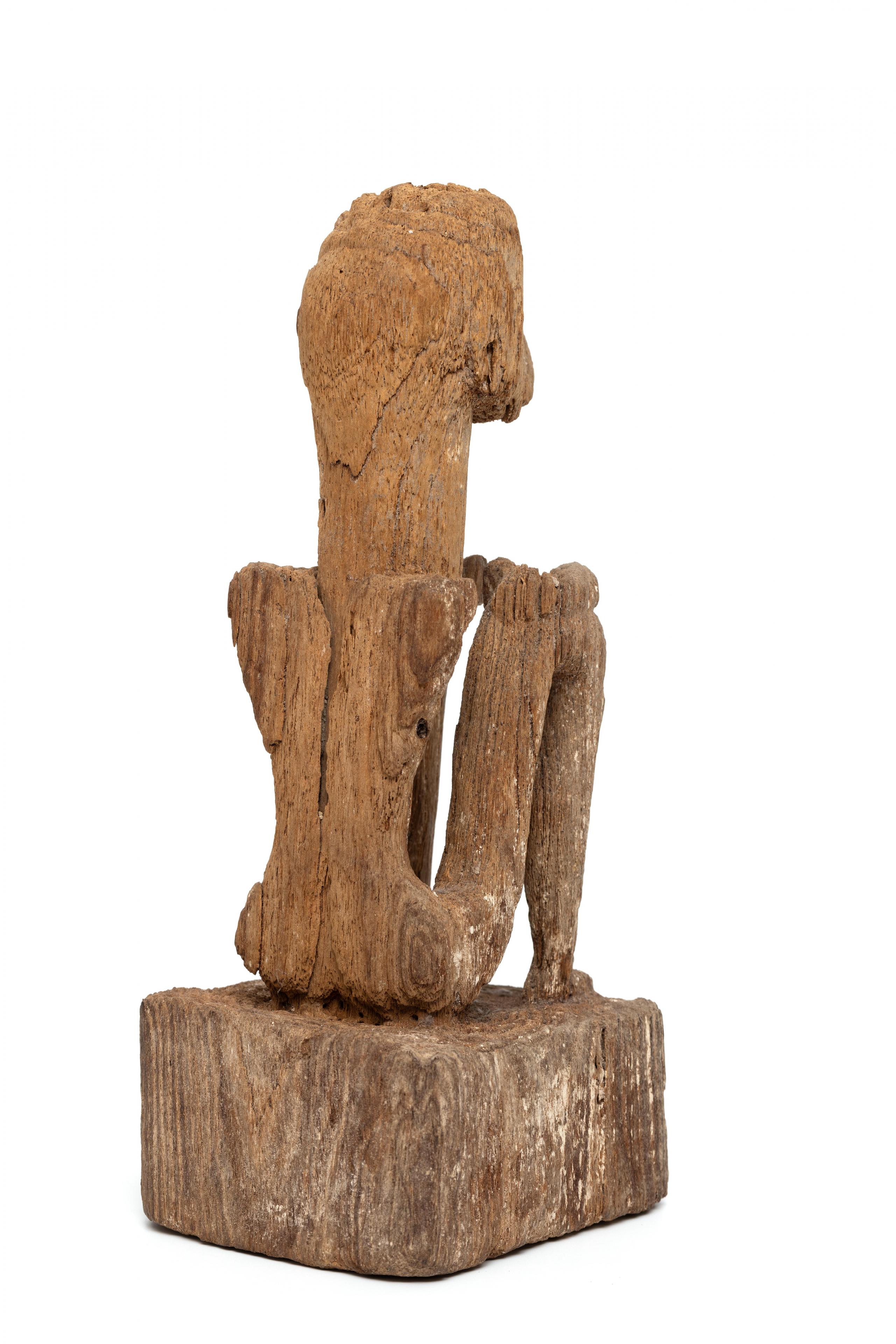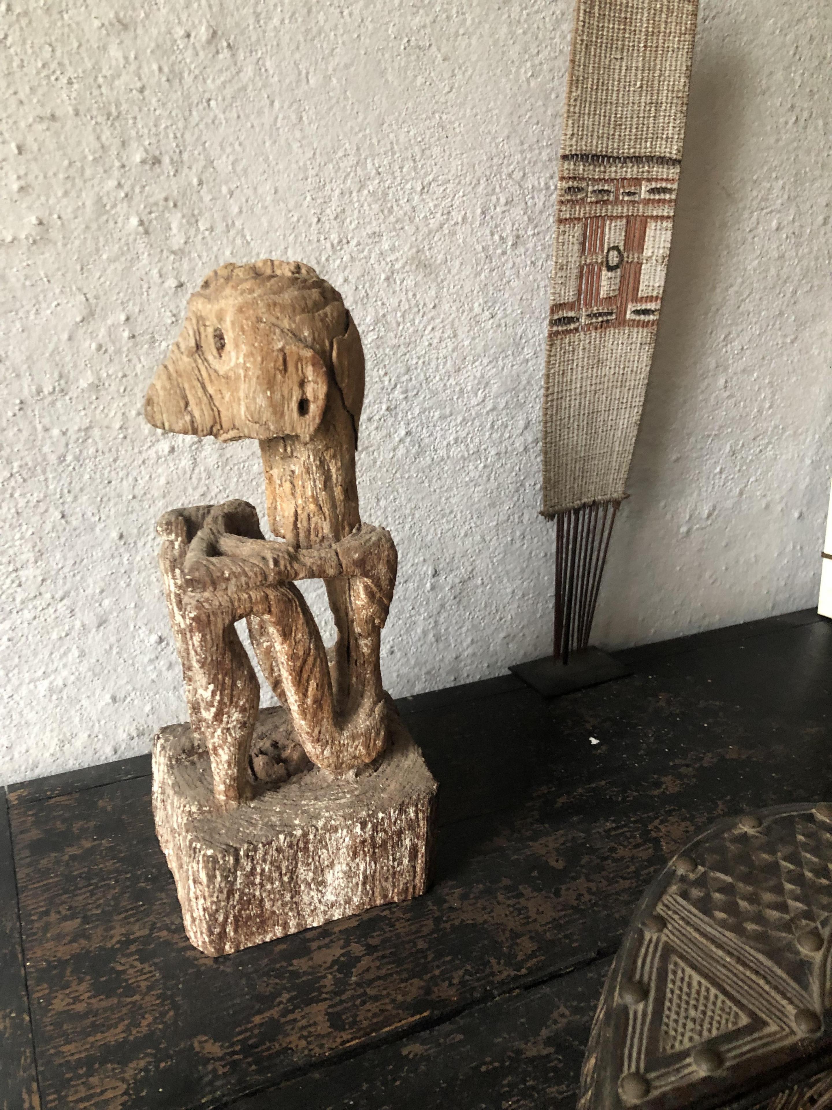 arms crossed resting on the raised knees, drilled eyes and ears.